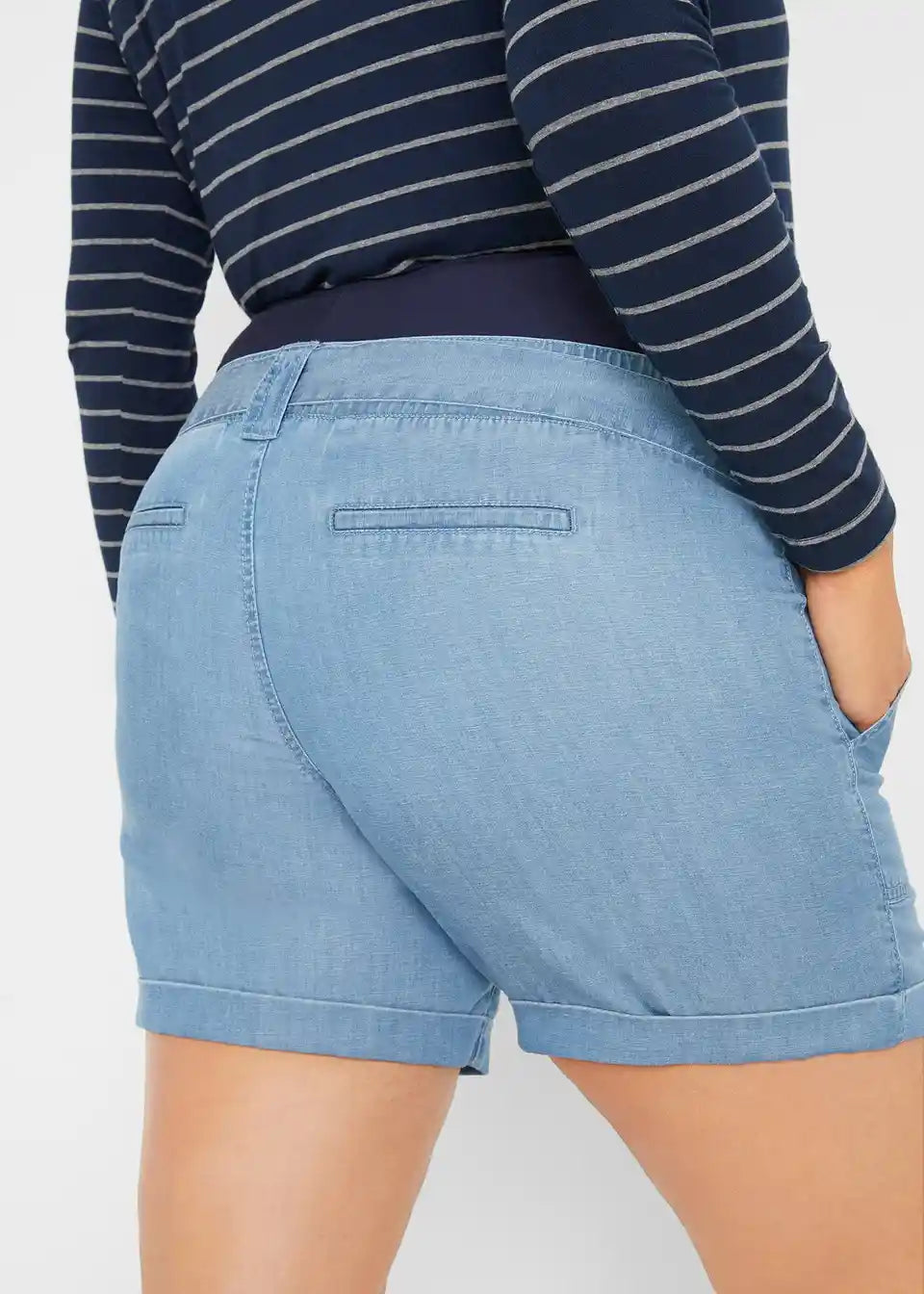 Ove trudničke kratke hlače u traper izgledu prilagođavaju se rastućem trbuhu i stoga su nosive tijekom cijele trudnoće. Posebno su prikladne za tople ljetne dane zbog materijala od lana.