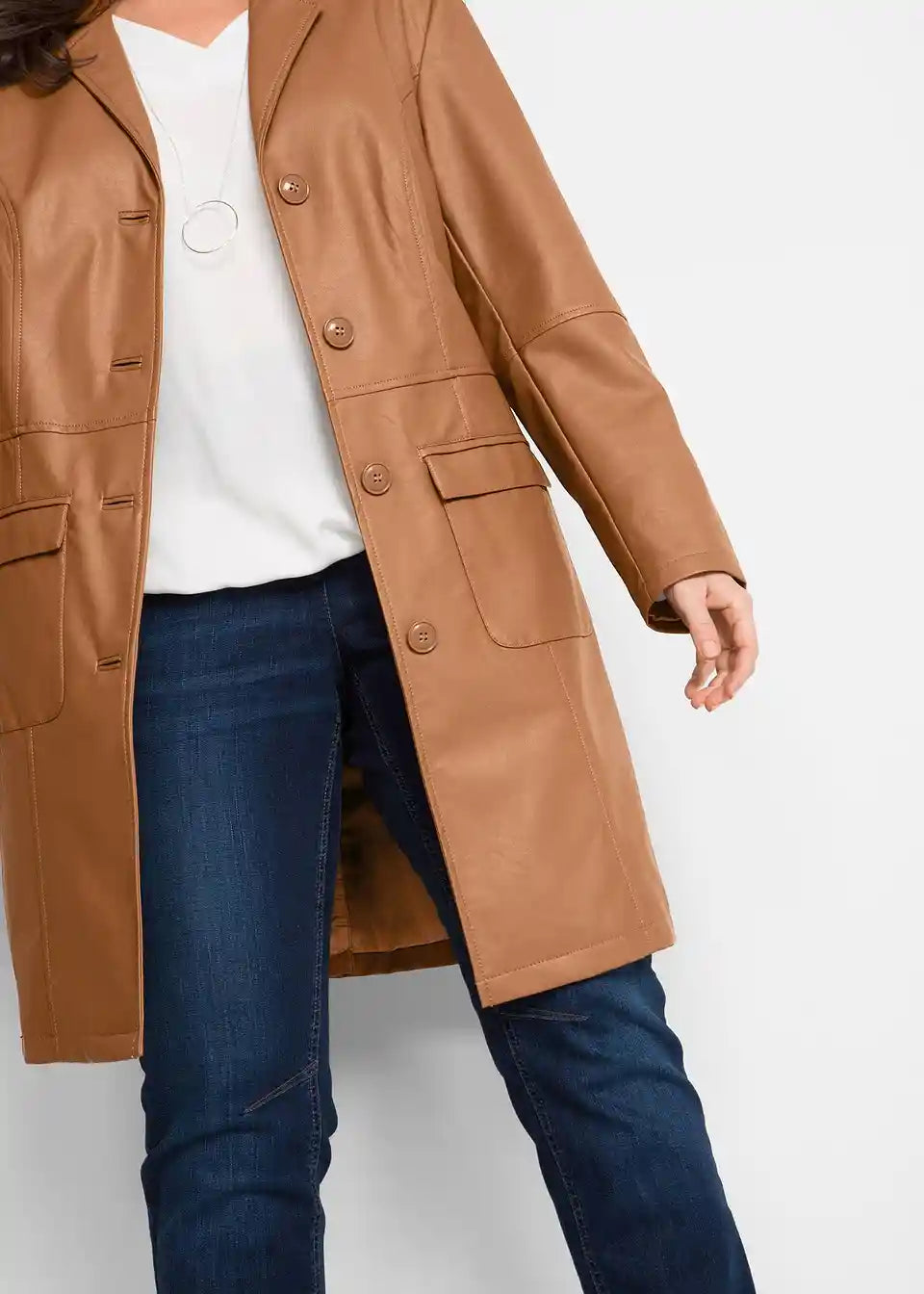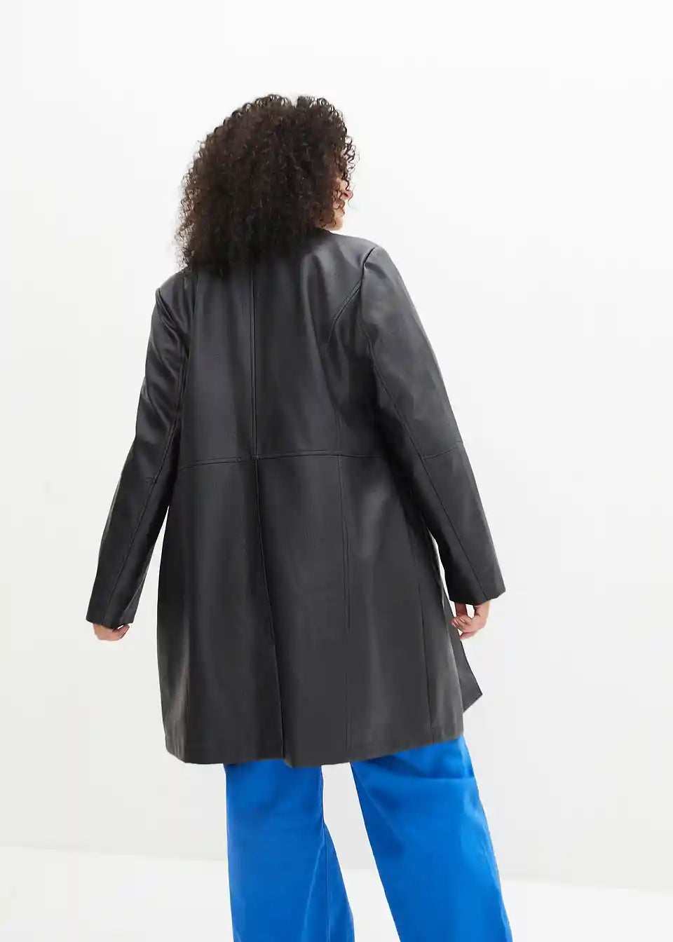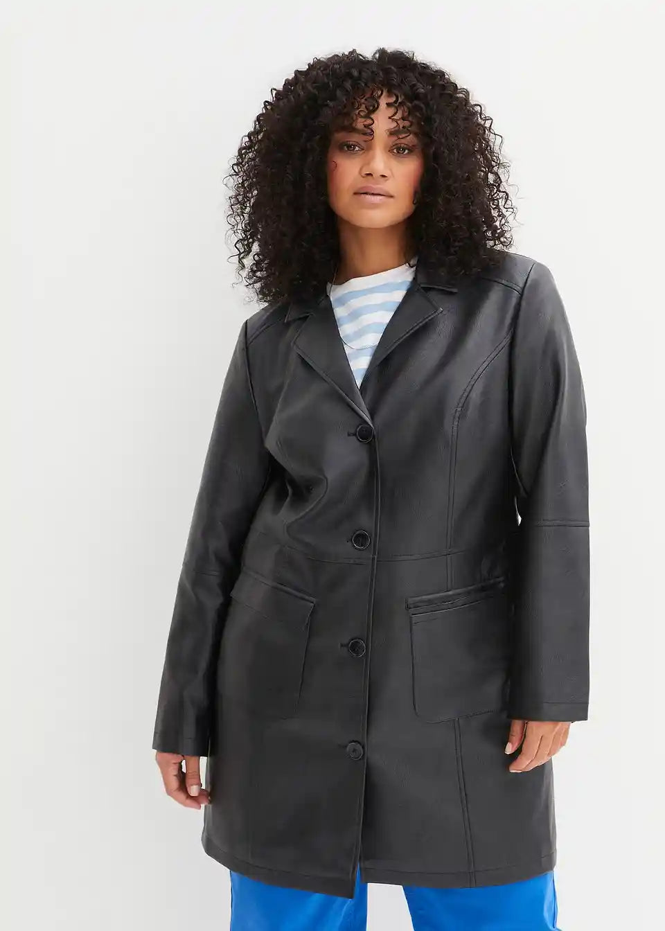 Ovaj ležerni frak od imitacije kože marke bpc pravi je privlačan komad. Kaput duljine do koljena krojen je tako da pristaje figuri i oduševljava svoje nositeljice s ušivenim džepovima s preklopima i produženim reverima. Reveri i šavovi, karakteristični za kožu, izdužuju i laskaju figuri. Strukirani frak sprijeda se zatvara s četiri velika gumba.