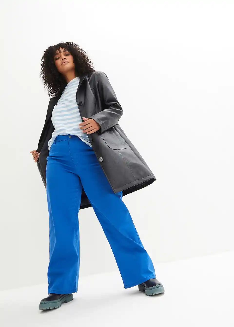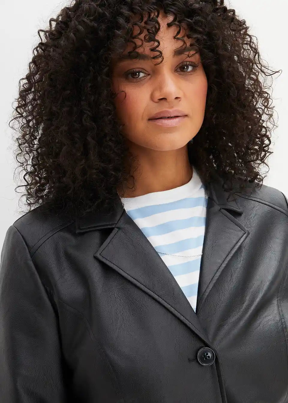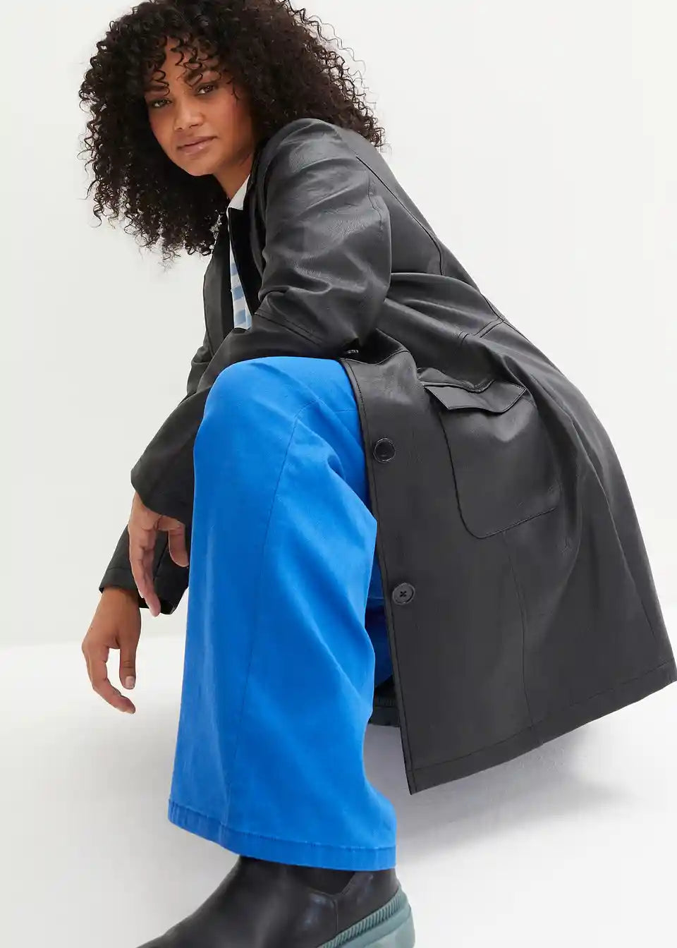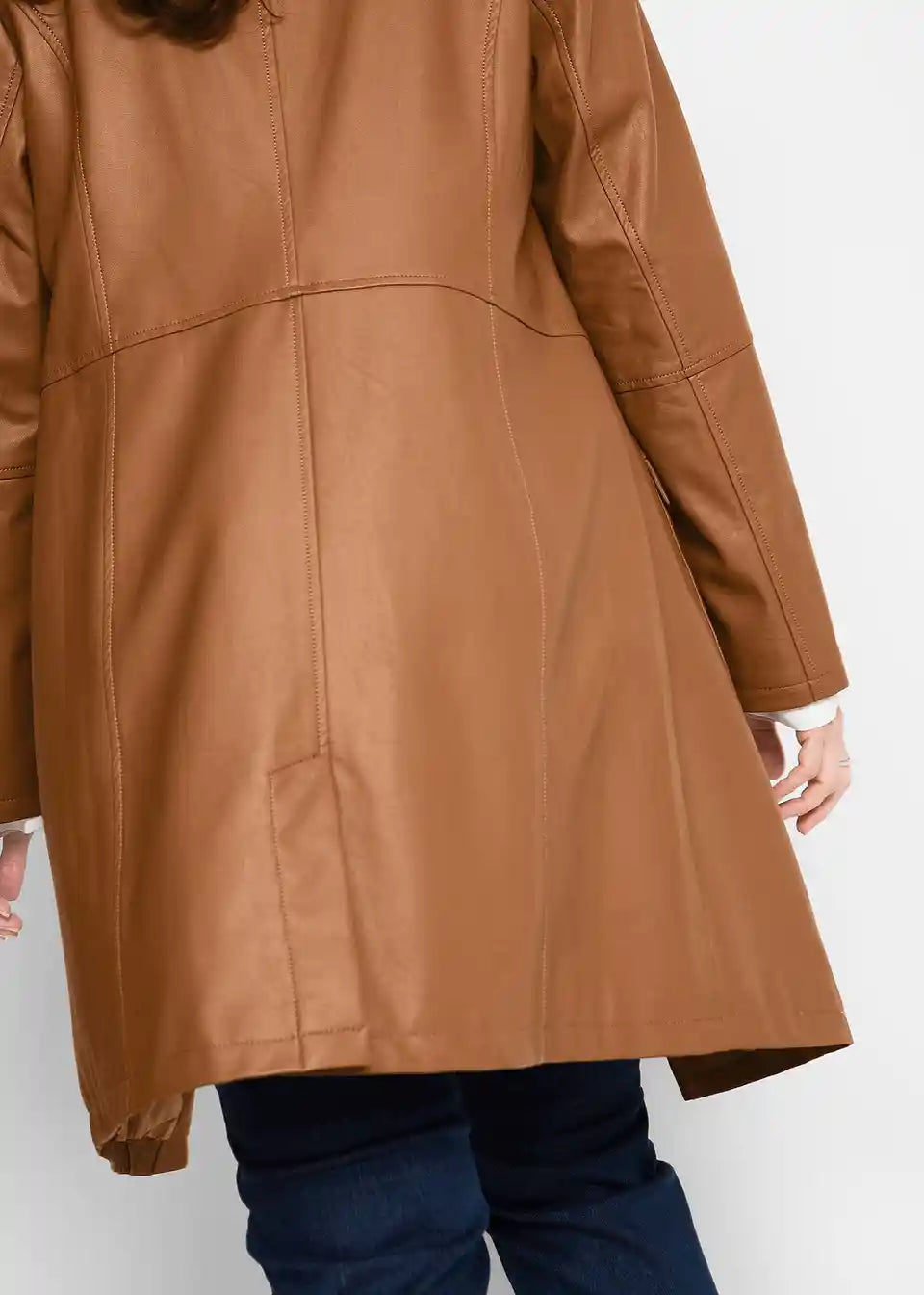 Ovaj ležerni frak od imitacije kože marke bpc pravi je privlačan komad. Kaput duljine do koljena krojen je tako da pristaje figuri i oduševljava svoje nositeljice s ušivenim džepovima s preklopima i produženim reverima. Reveri i šavovi, karakteristični za kožu, izdužuju i laskaju figuri. Strukirani frak sprijeda se zatvara s četiri velika gumba.