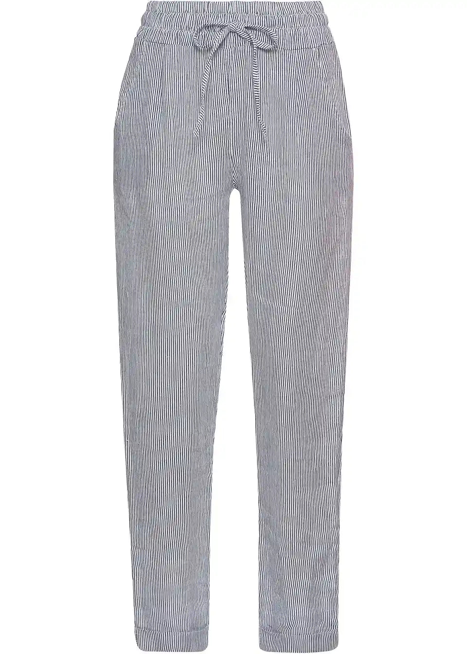 Ove elegantne lanene hlače marke BODYFLIRT prekrasan su model za toplije dane. Široki kroj hlača suptilno naglašava noge te su izrađene s širokim elastičnim pojasom s vezicom. Ispod pojasa uočavaju se suptilni nabori. Dva bočna ušivena džepa i fiksirani porub s preklopom na završetku nogavica čine dizajn ovih lijepih hlača potpunim.