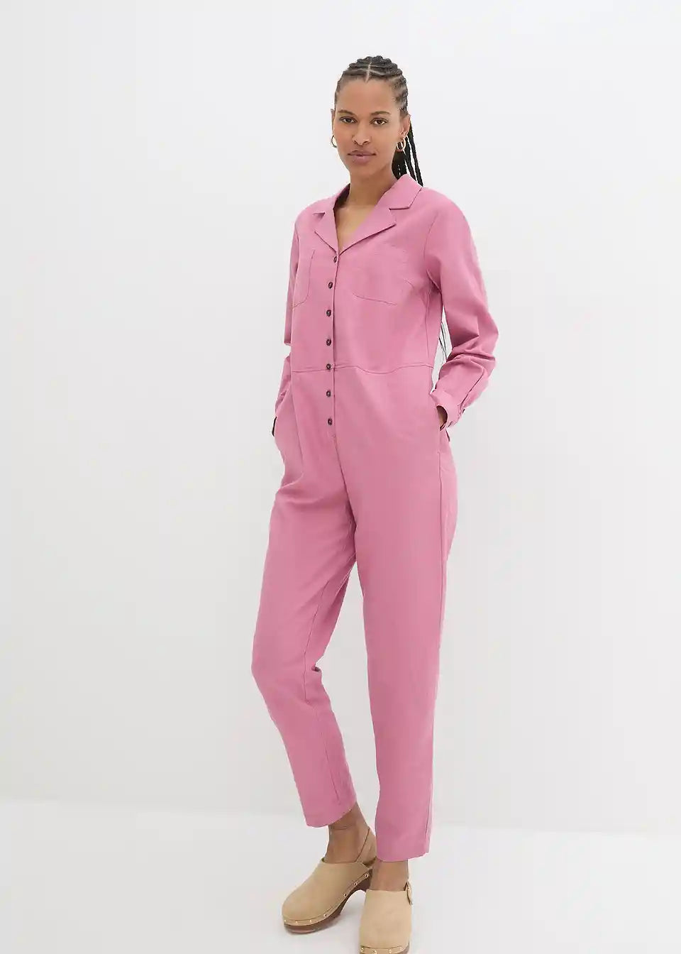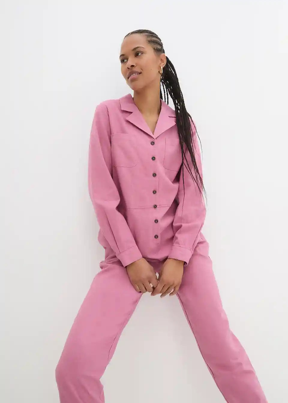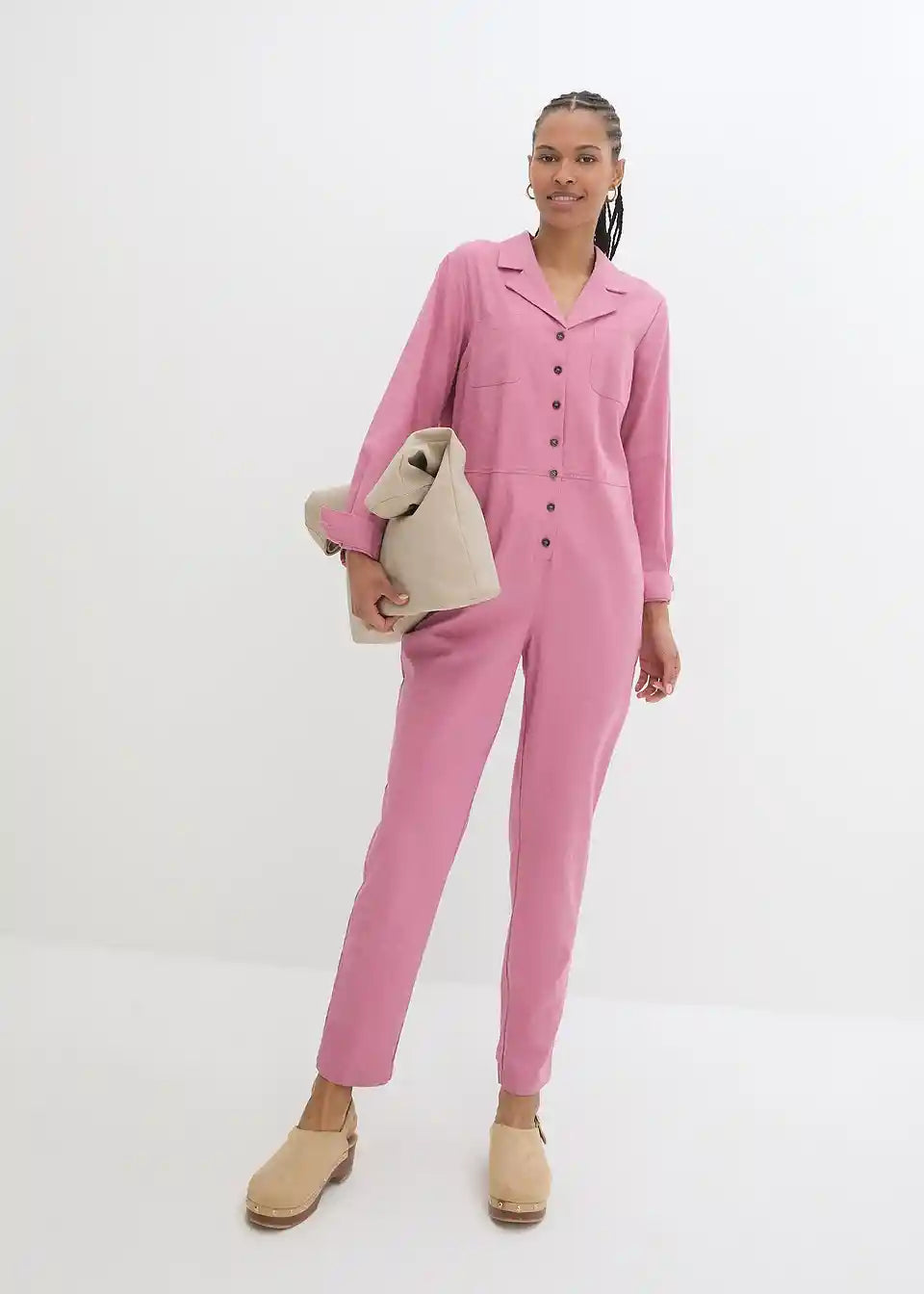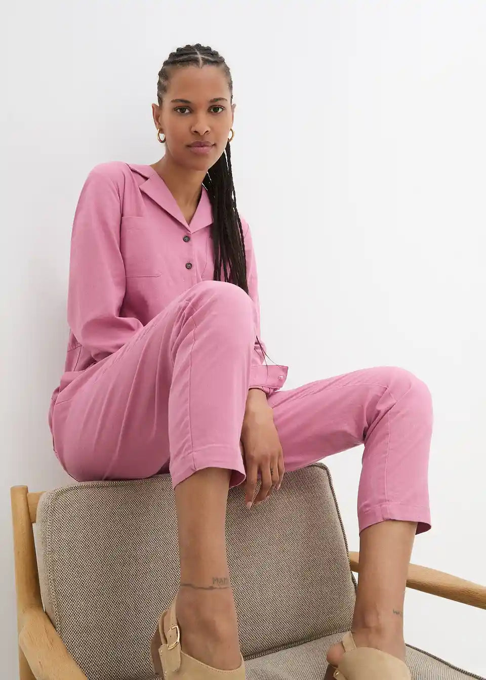 Moderan laneni kombinezon s džepovima i kopčanjem na gumbe