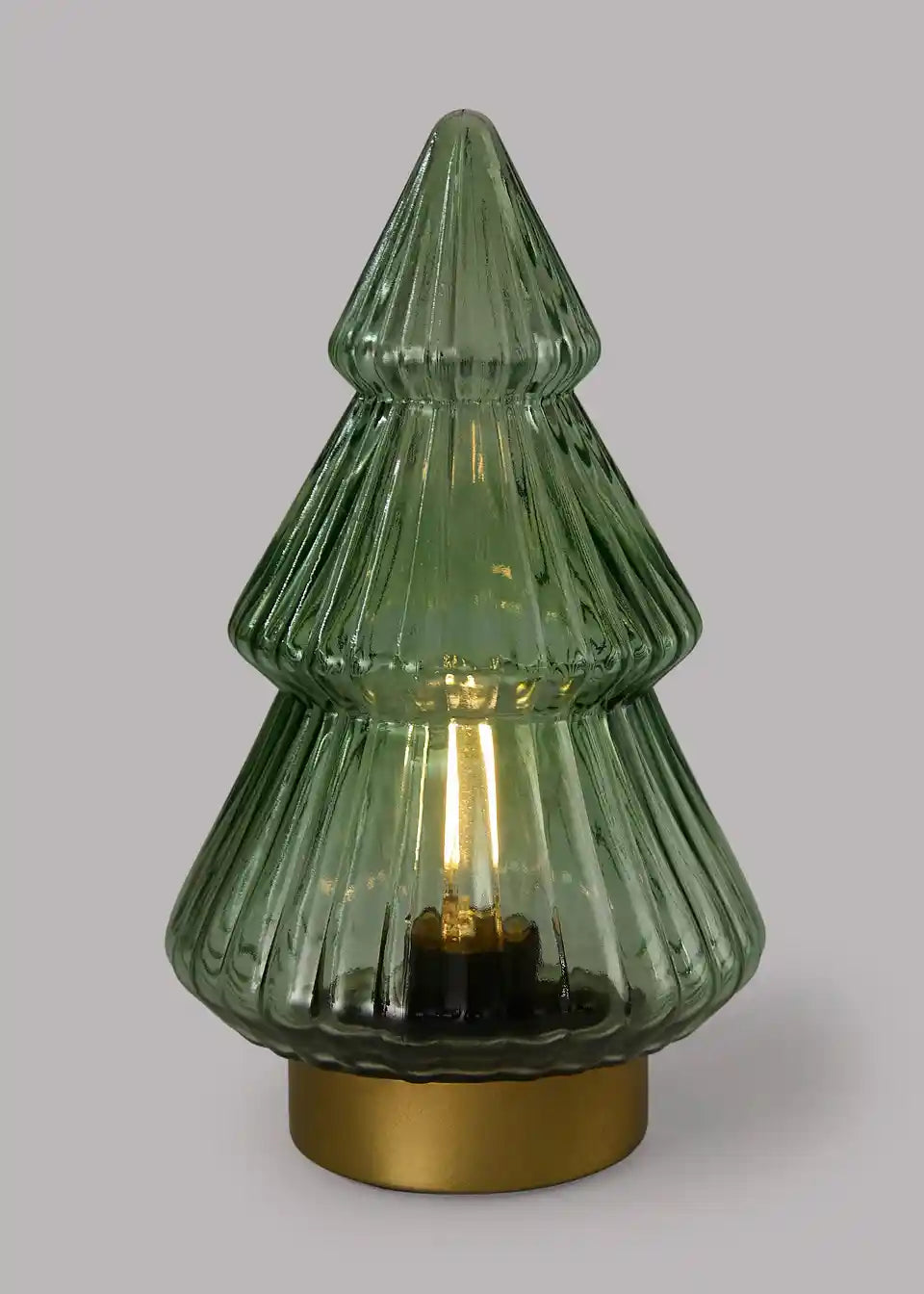 Otkrij naše božićno drvce s LED-om: zeleno staklo i postolje zlatne boje donose svečano svjetlo u tvoj dom.