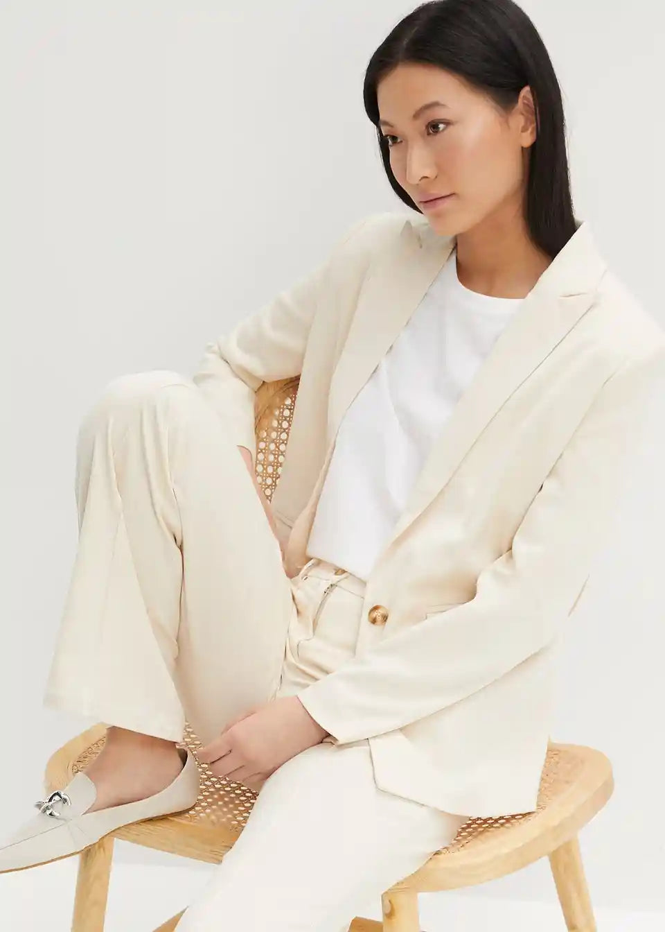 Model je visok 1,77 m i nosi veličinu 36.