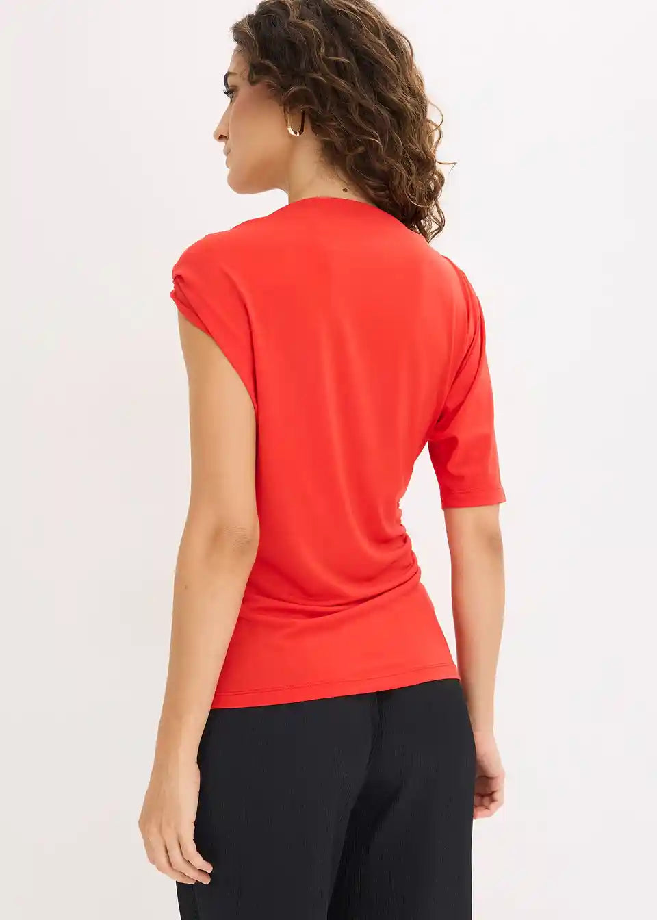 Majica s asimetričnim izrezom te s drapiranjem i metalnom aplikacijom na ramenu.