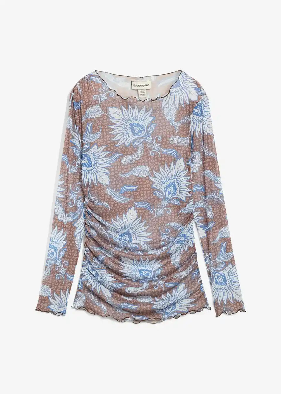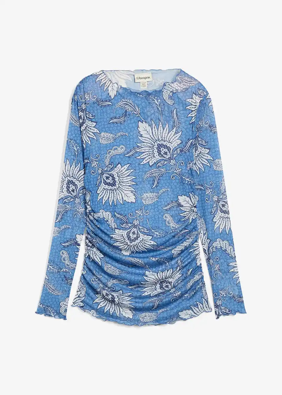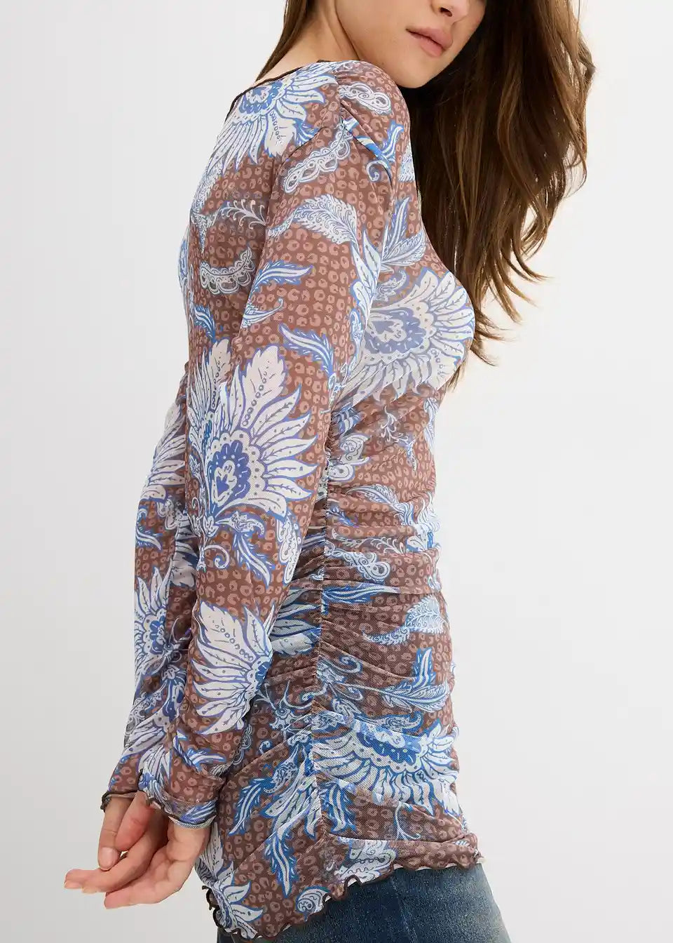 Tisak na majici s dugim rukavima od fine mrežice s naborima