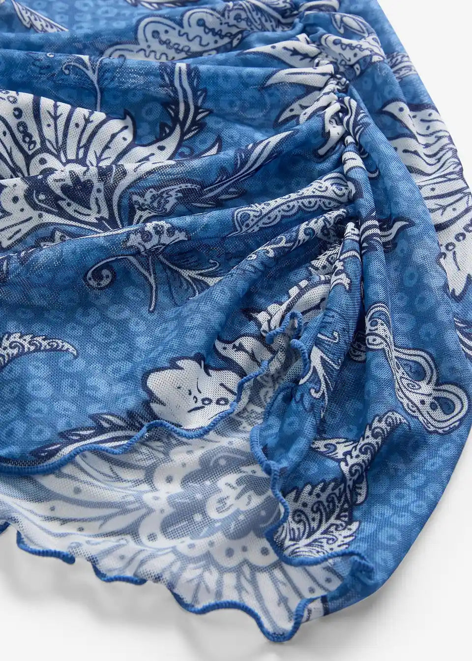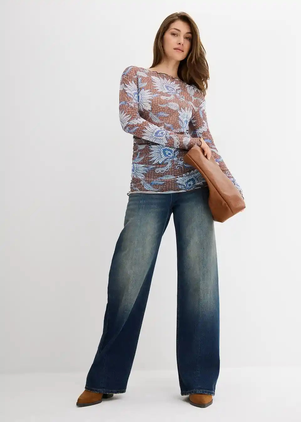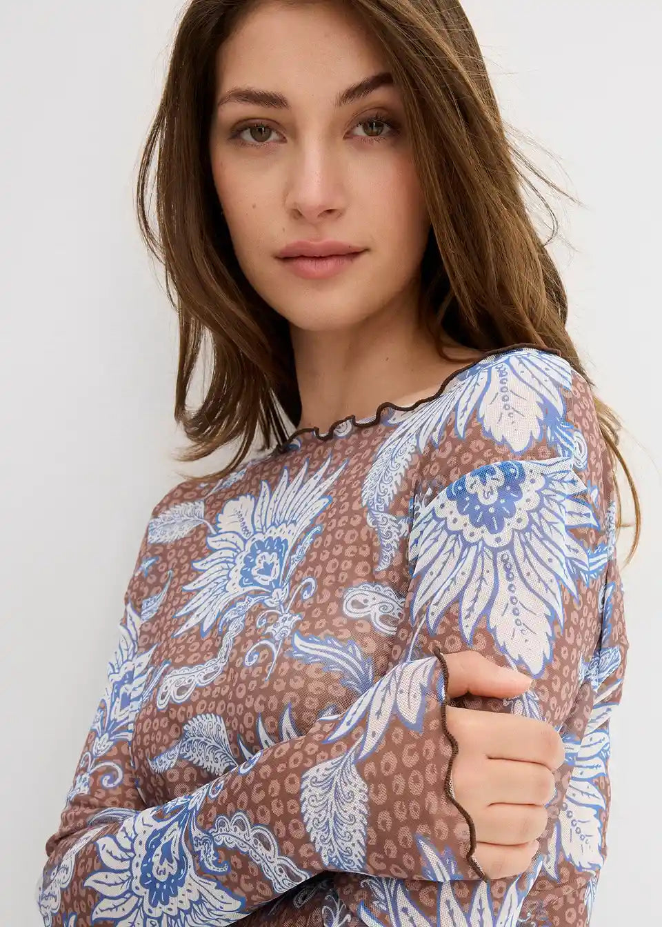 Tisak na majici s dugim rukavima od fine mrežice s naborima