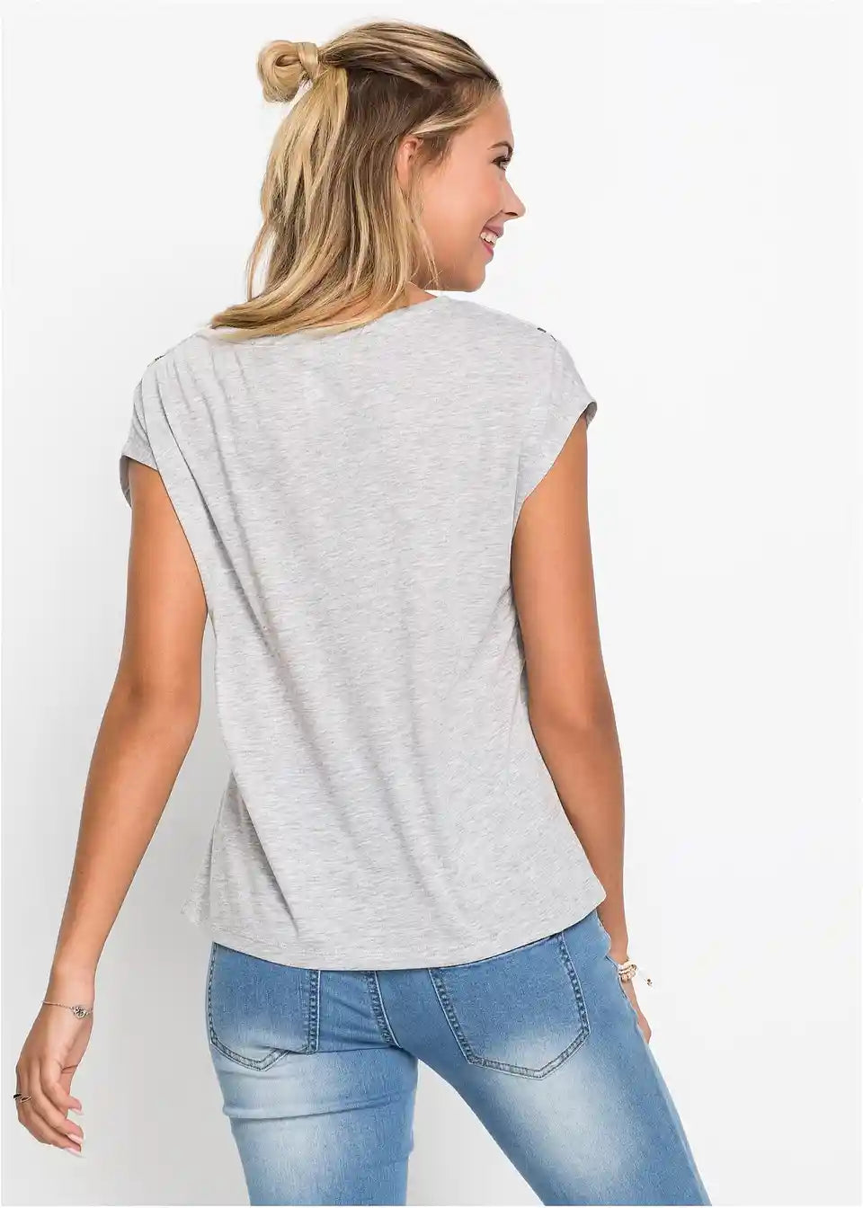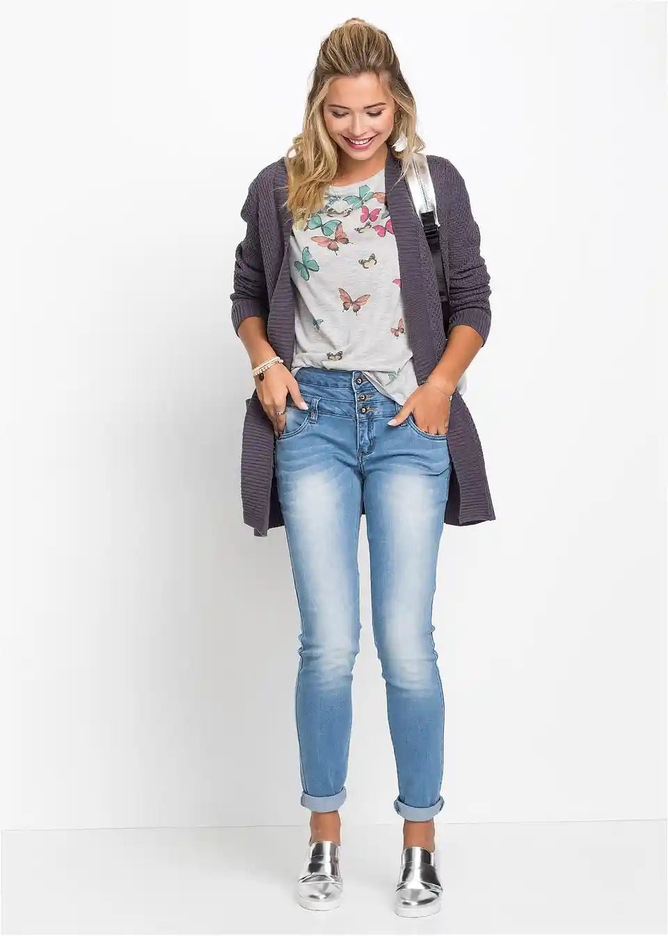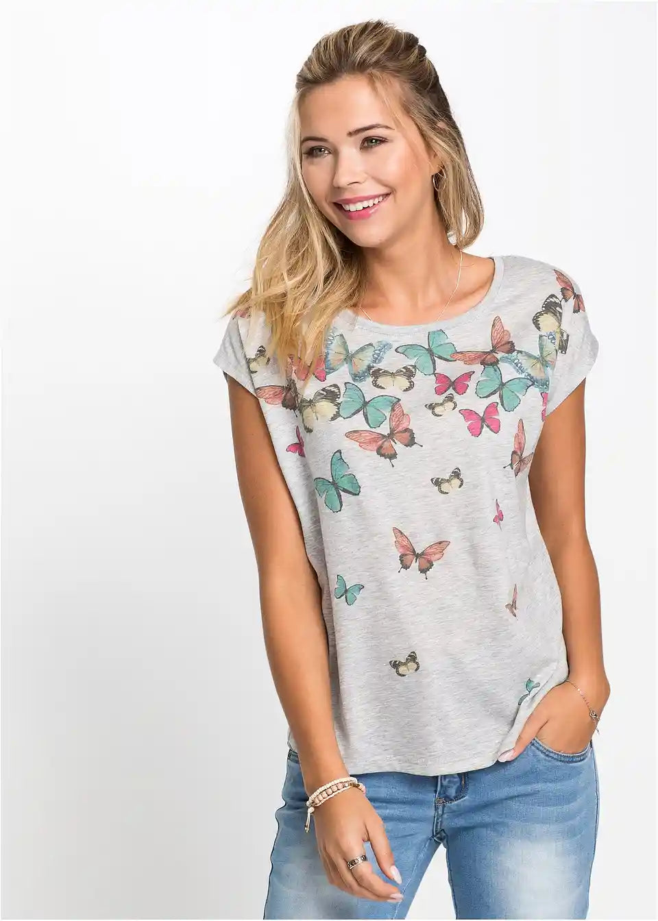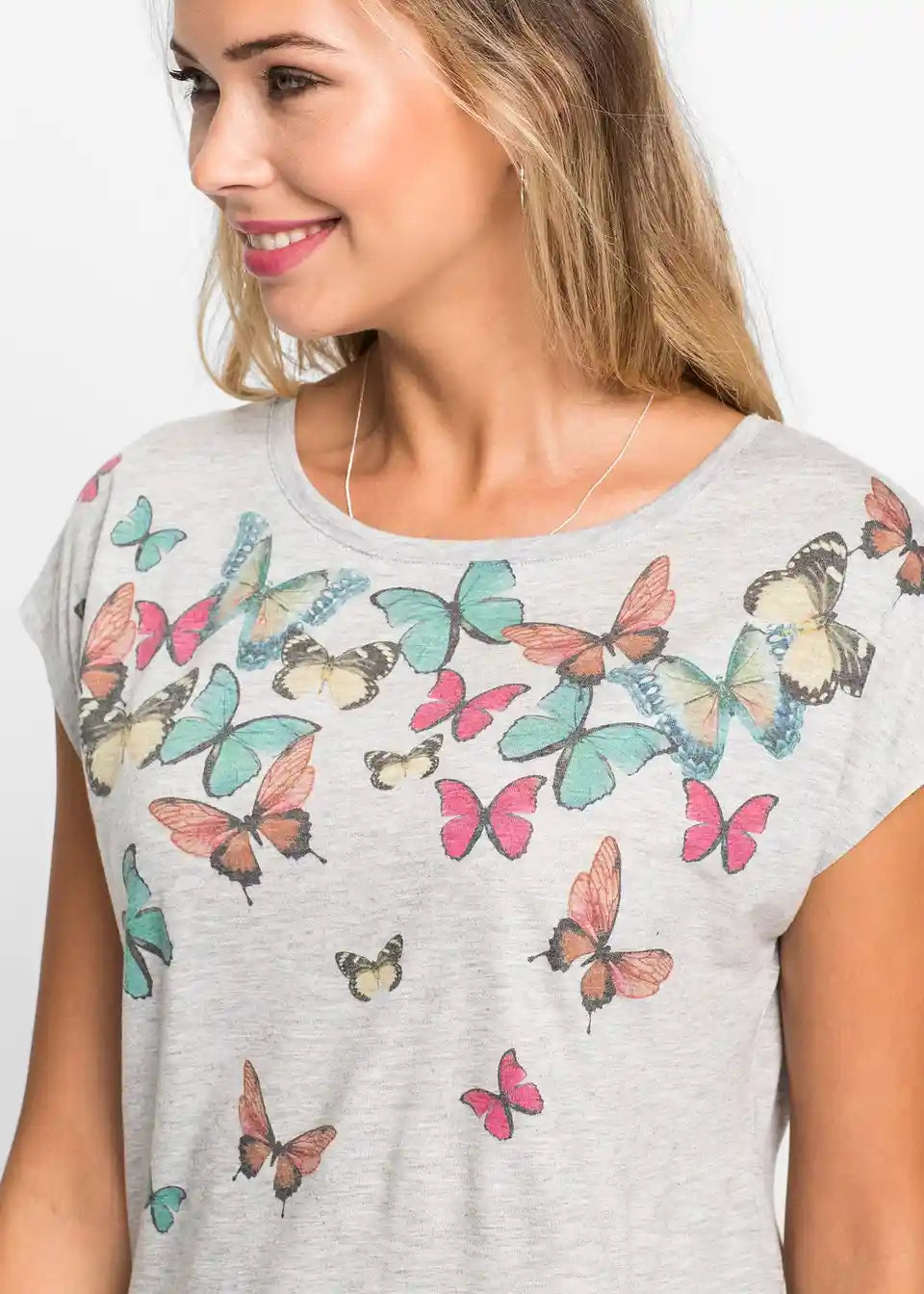 Šareni leptiri ukrašavaju ovu majicu. Dizajn upotpunjuju maleni krilni rukavi. Model s okruglim izrezom koji ležerno pada oduševljava svojim prekrasnim izgledom i raznolikim mogućnostima kombinacije. Ležeran outfit lako ćete postići s trapericama i tenisicama. Elegantna majica s leptirima također se savršeno slaže s kratkim suknjama od imitacije kože ili dugim til suknjama. Kardigan ili sako upotpunjuju izgled.