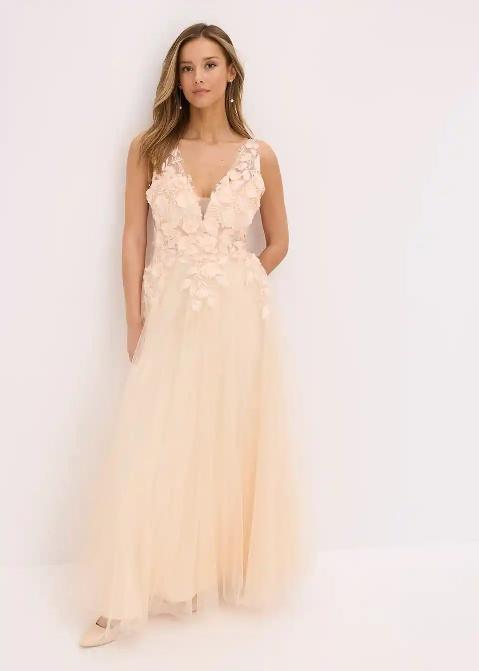 Romantična i ženstvena: očaravajuća večernja haljina maksi duljine od nježnog tila s cvjetnim aplikacijama na gornjem dijelu