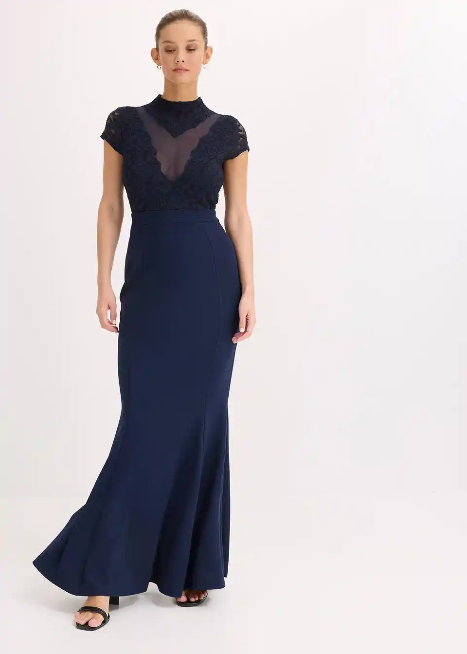 Seksi večernja haljina sirena kroja s ovratnikom i prozirnim mrežastim umetkom na gornjem dijelu