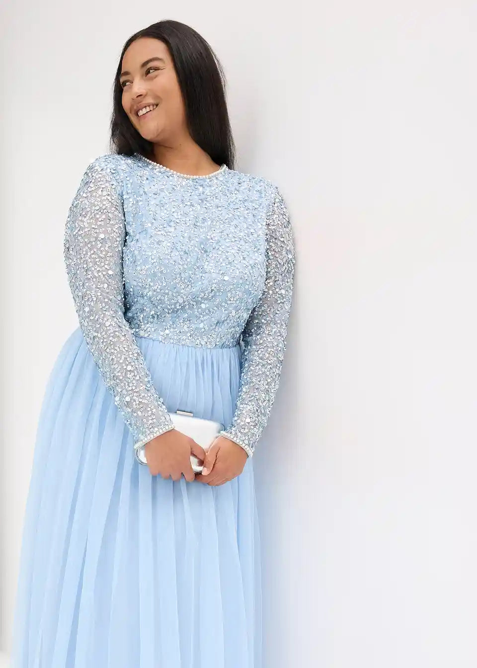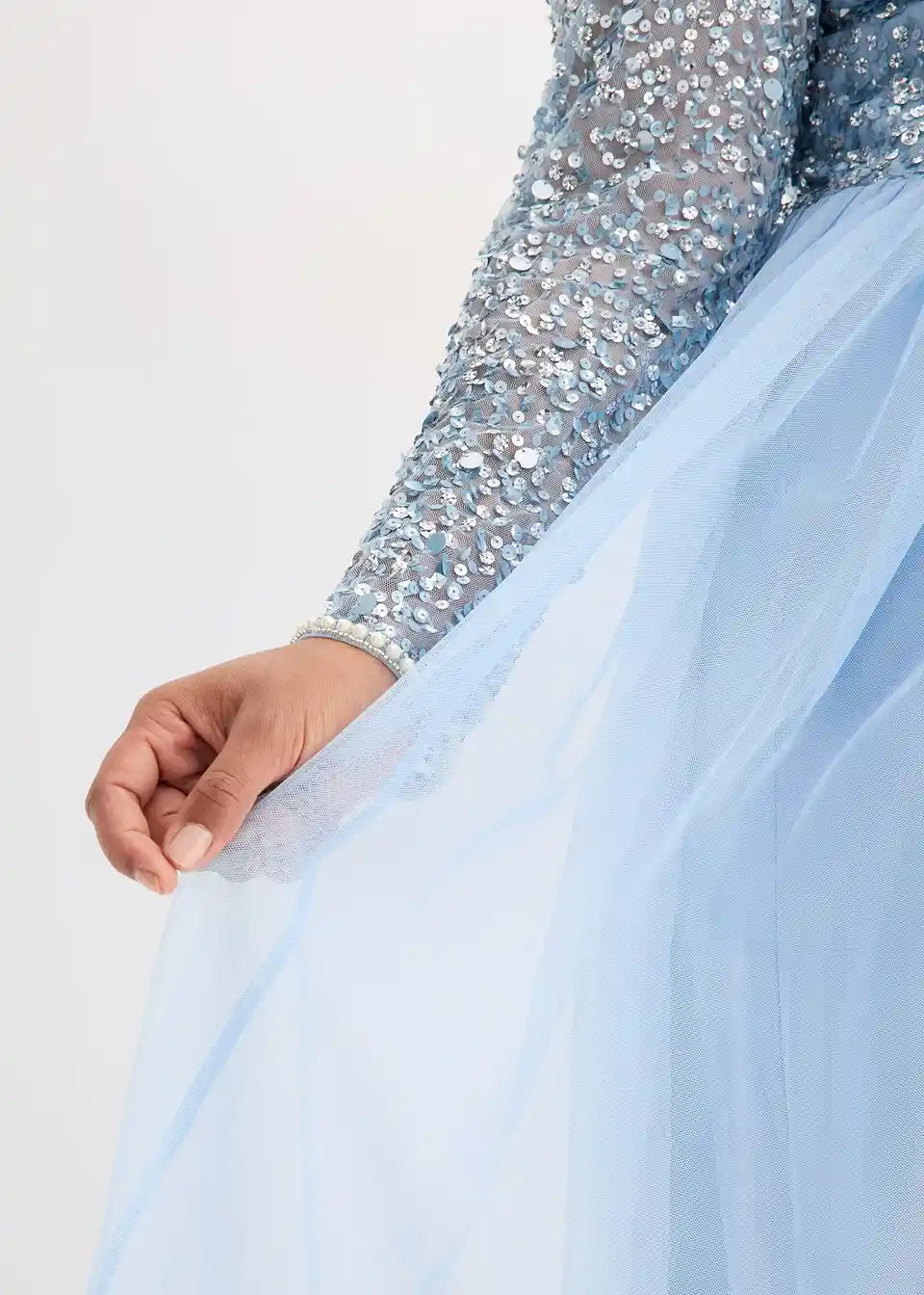 Moderna i ženstvena: večernja haljina s vezom od šljokica i perlicama na rukavima kao i na izrezu.