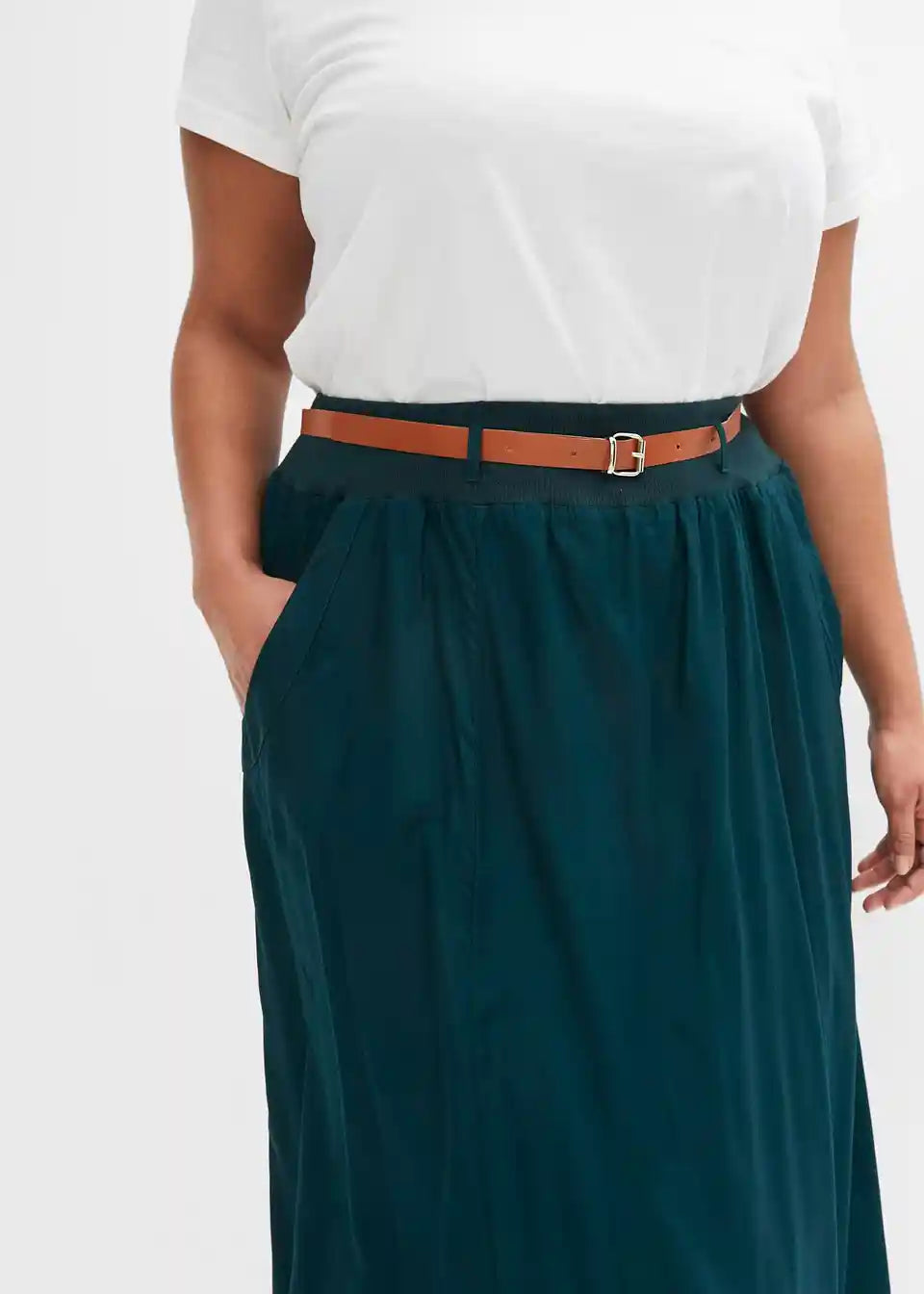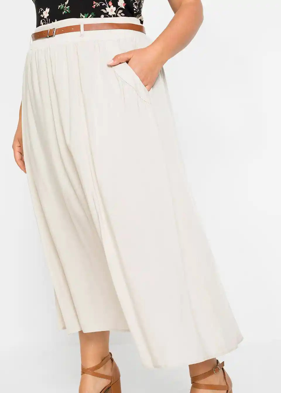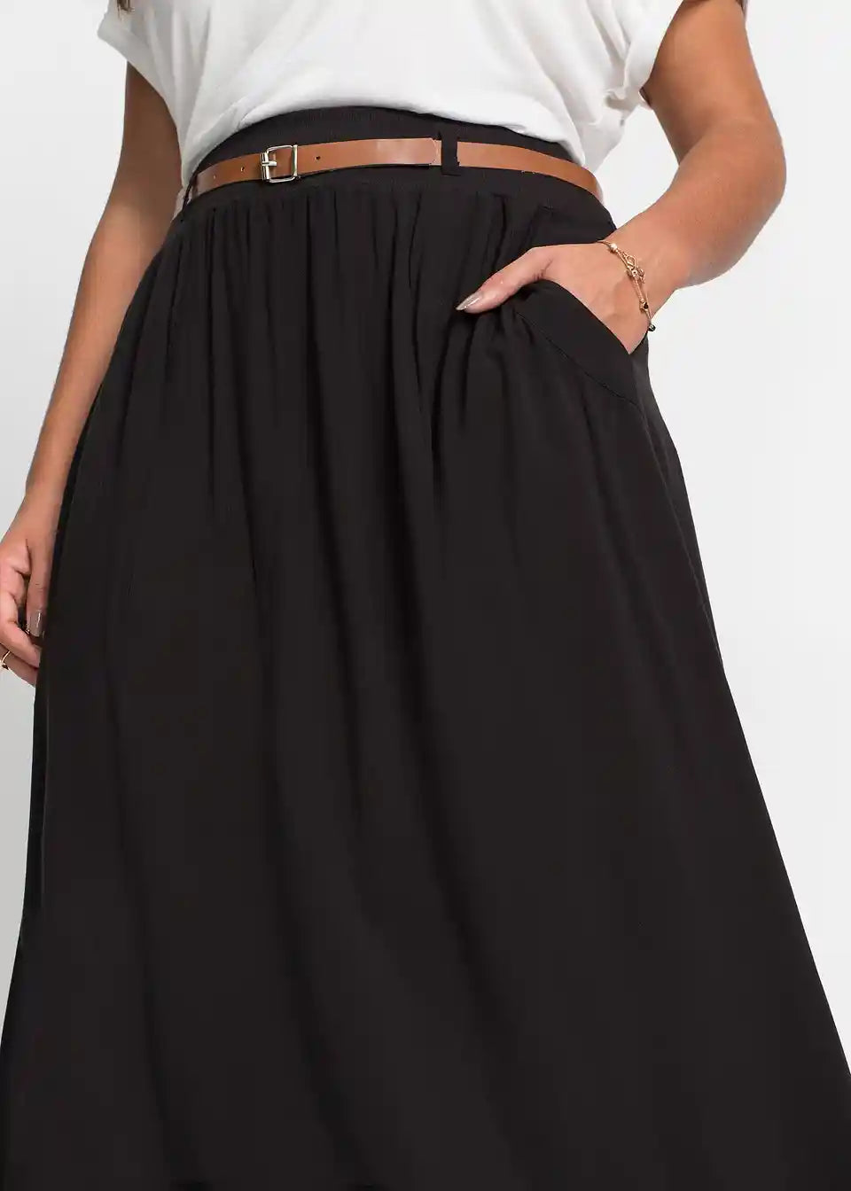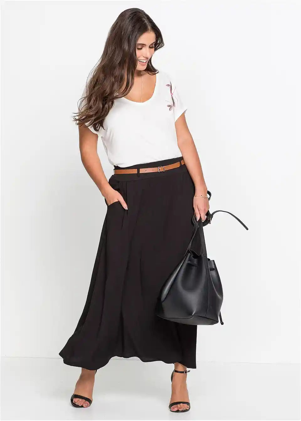 Ova lijepa maksi suknja od BODYFLIRT-a savršena je za toplije dane. Maksi suknja ima široki pojas izrađen od fine rebraste tkanine i dolazi sa uskim remenom. Na prednjoj strani suknje nalaze se dva džepa. Materijal lagano pada niz nogu. Maksi suknja sjajno se kombinira sa sandalama i ženstvenim topovima.