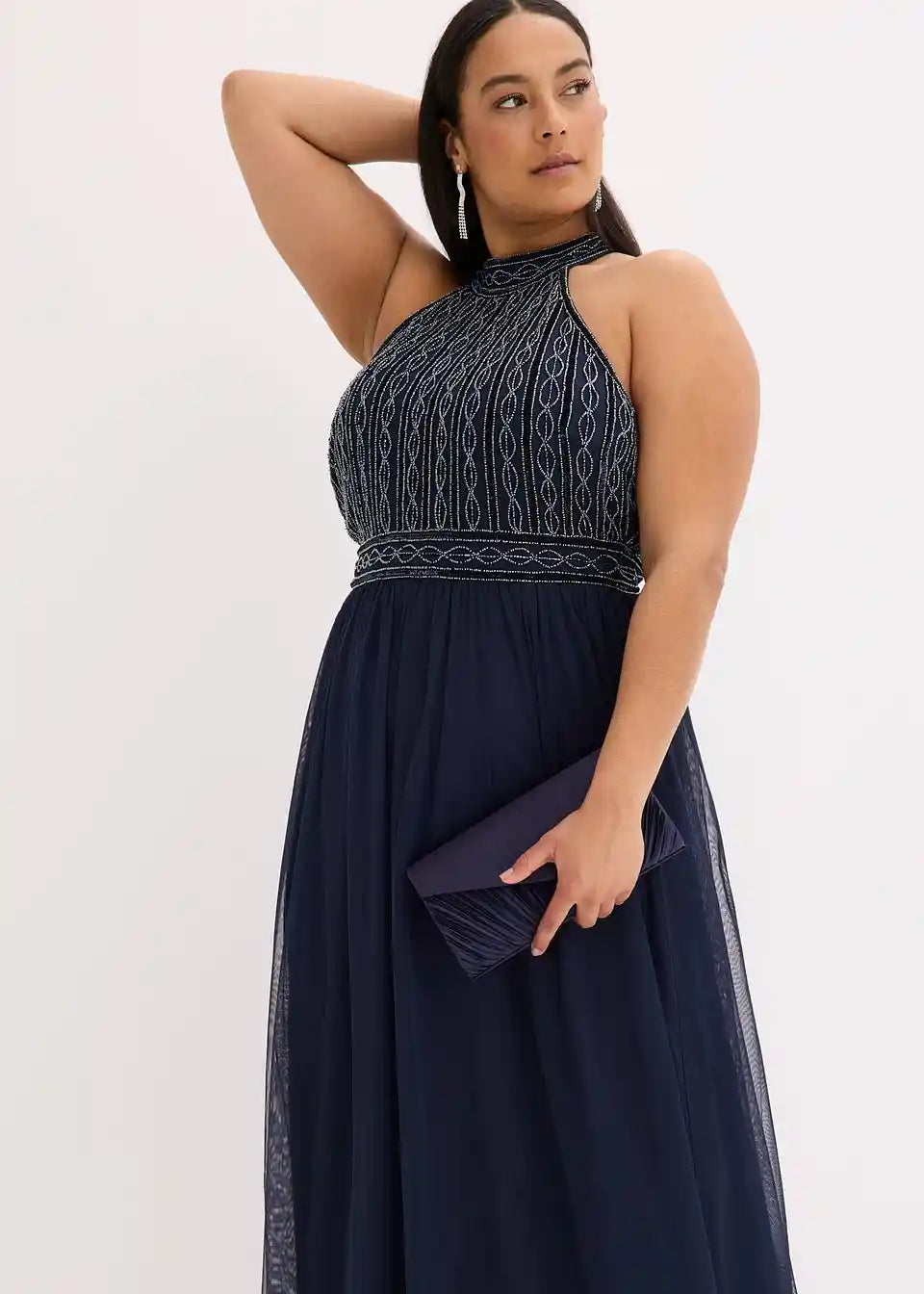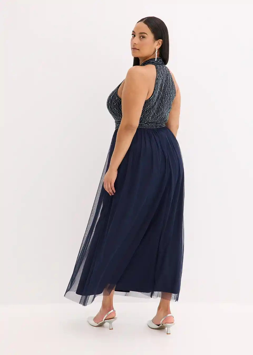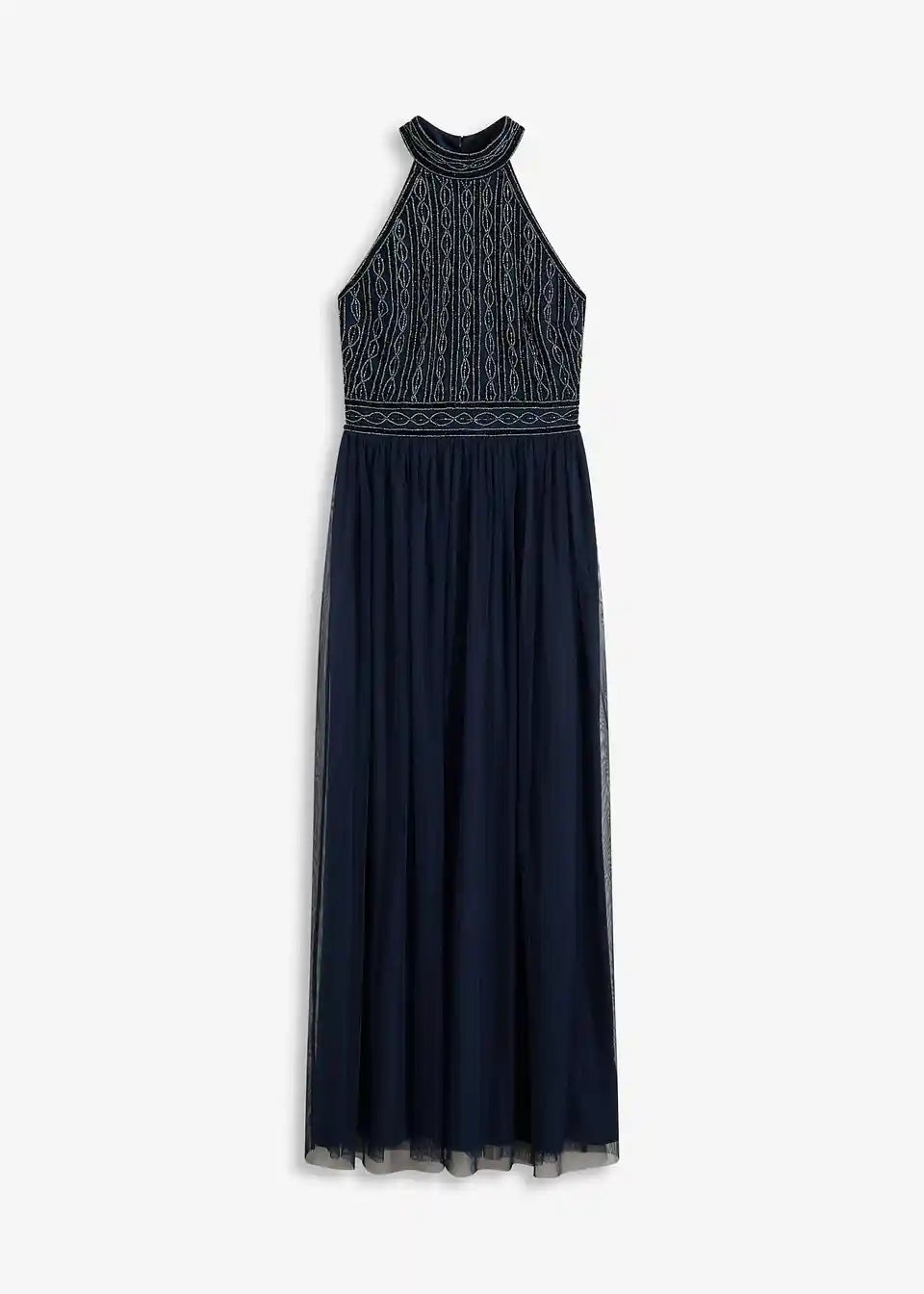 Moderna i ženstvena: večernja haljina dužine maxi s vratnim vezom od fine tila i s vezom od šljokica