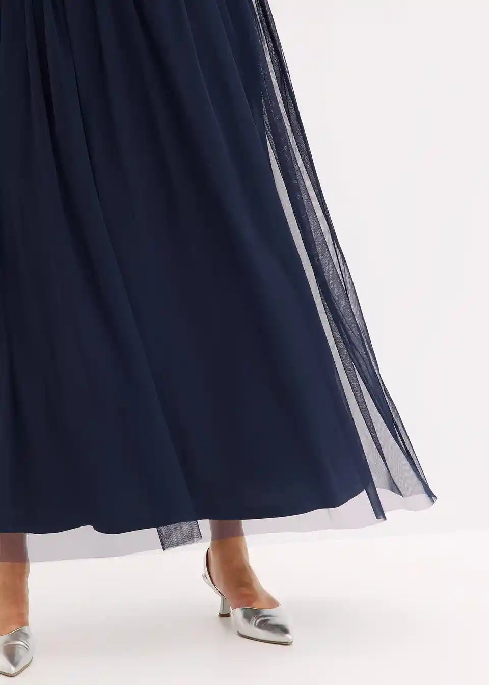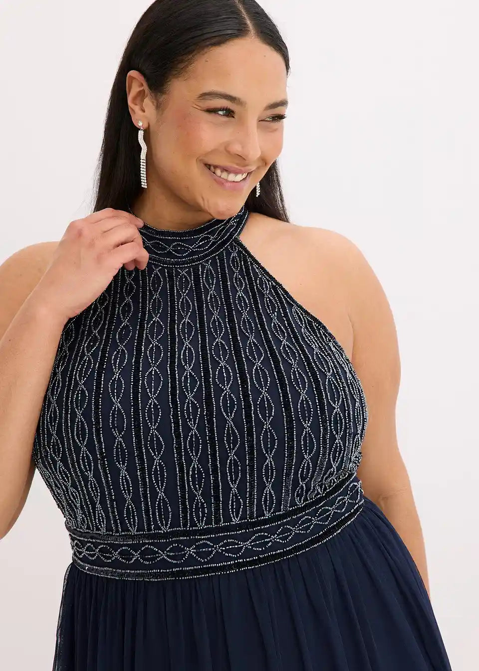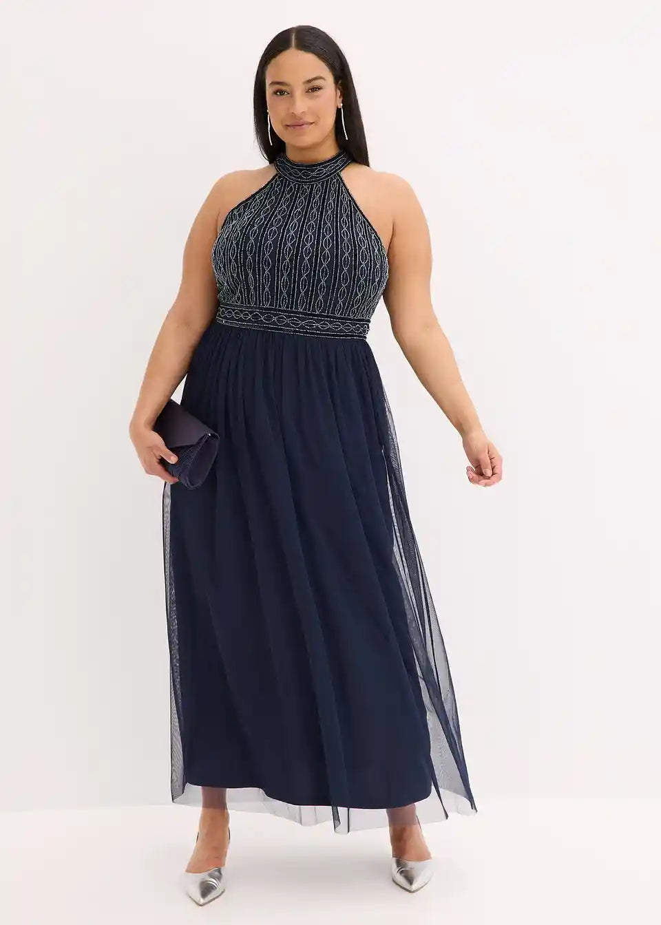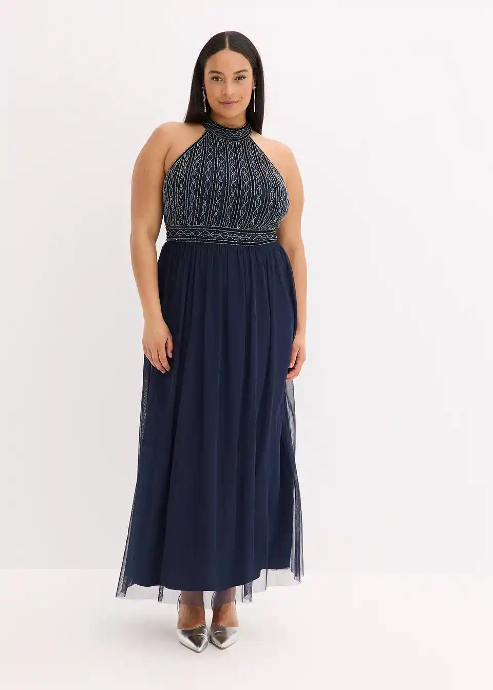 Moderna i ženstvena: večernja haljina dužine maxi s vratnim vezom od fine tila i s vezom od šljokica