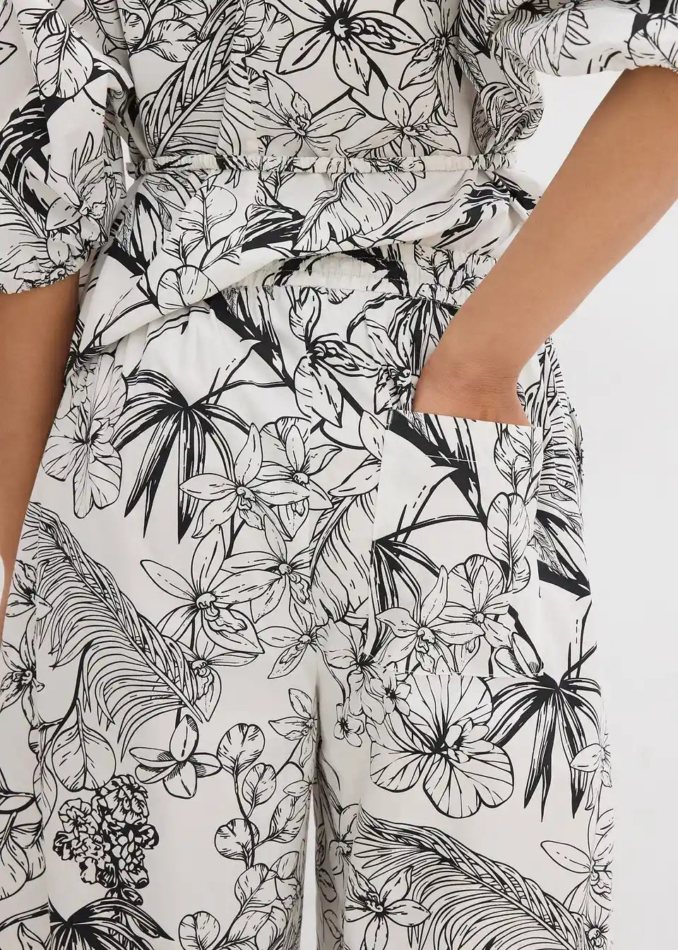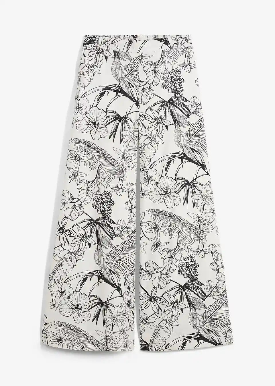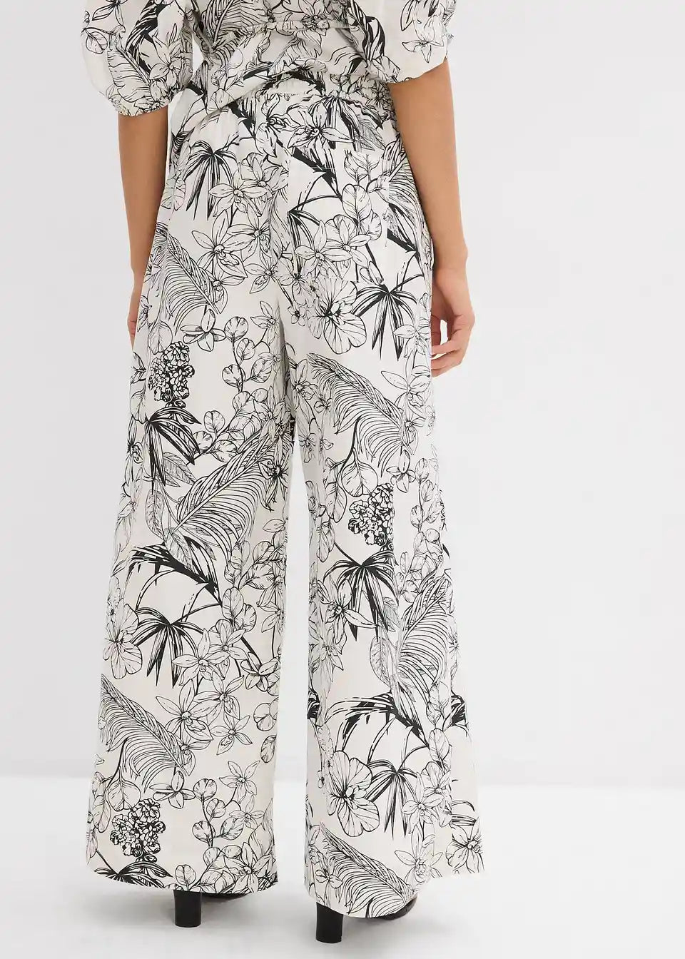 Duge hlače sa širokim nogavicama i visokim strukom , s bočnim džepovima i našivenim stražnjim džepom. Prednje zatvaranje s patentnim zatvaračem, metalnom kukicom i gumbom