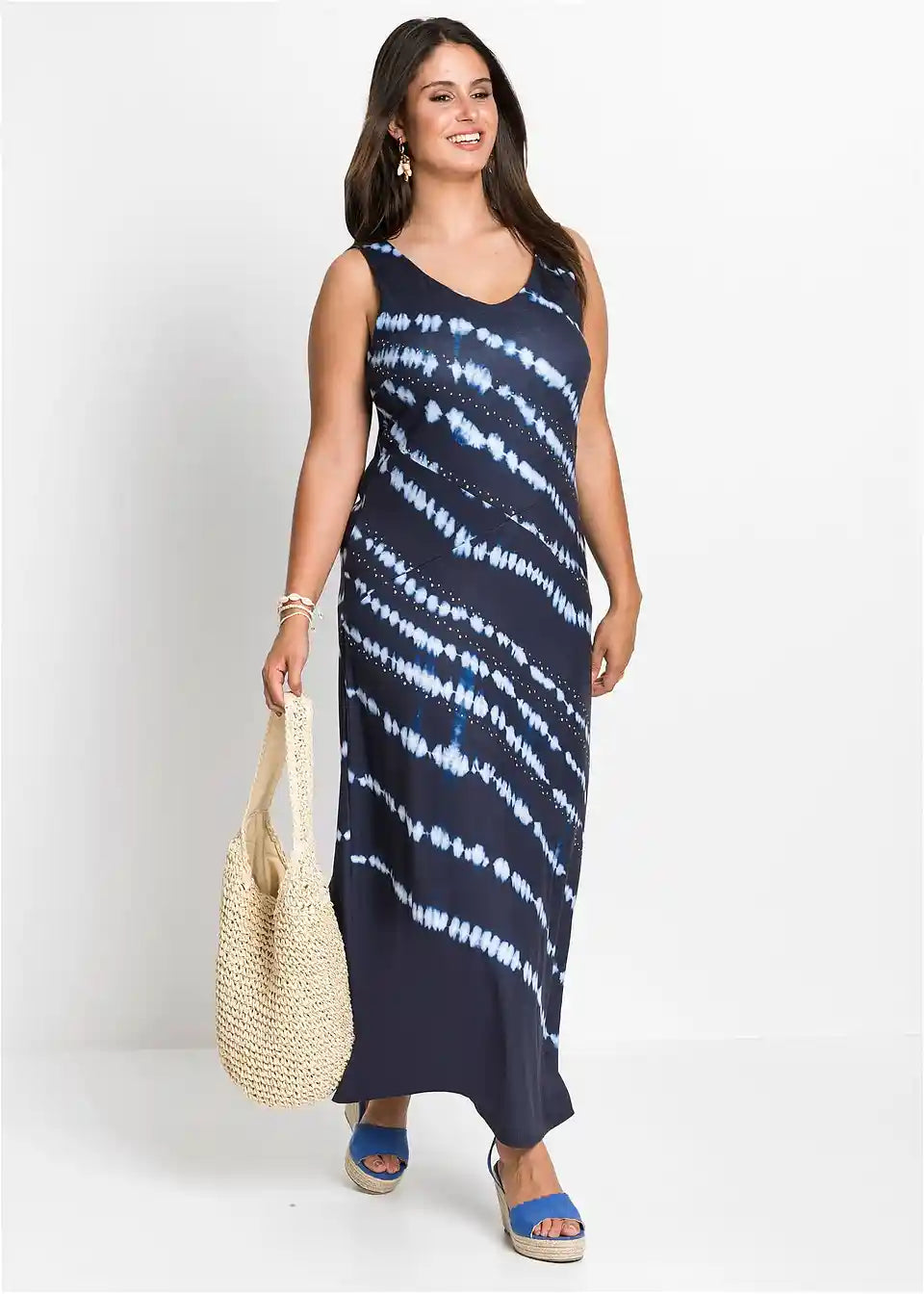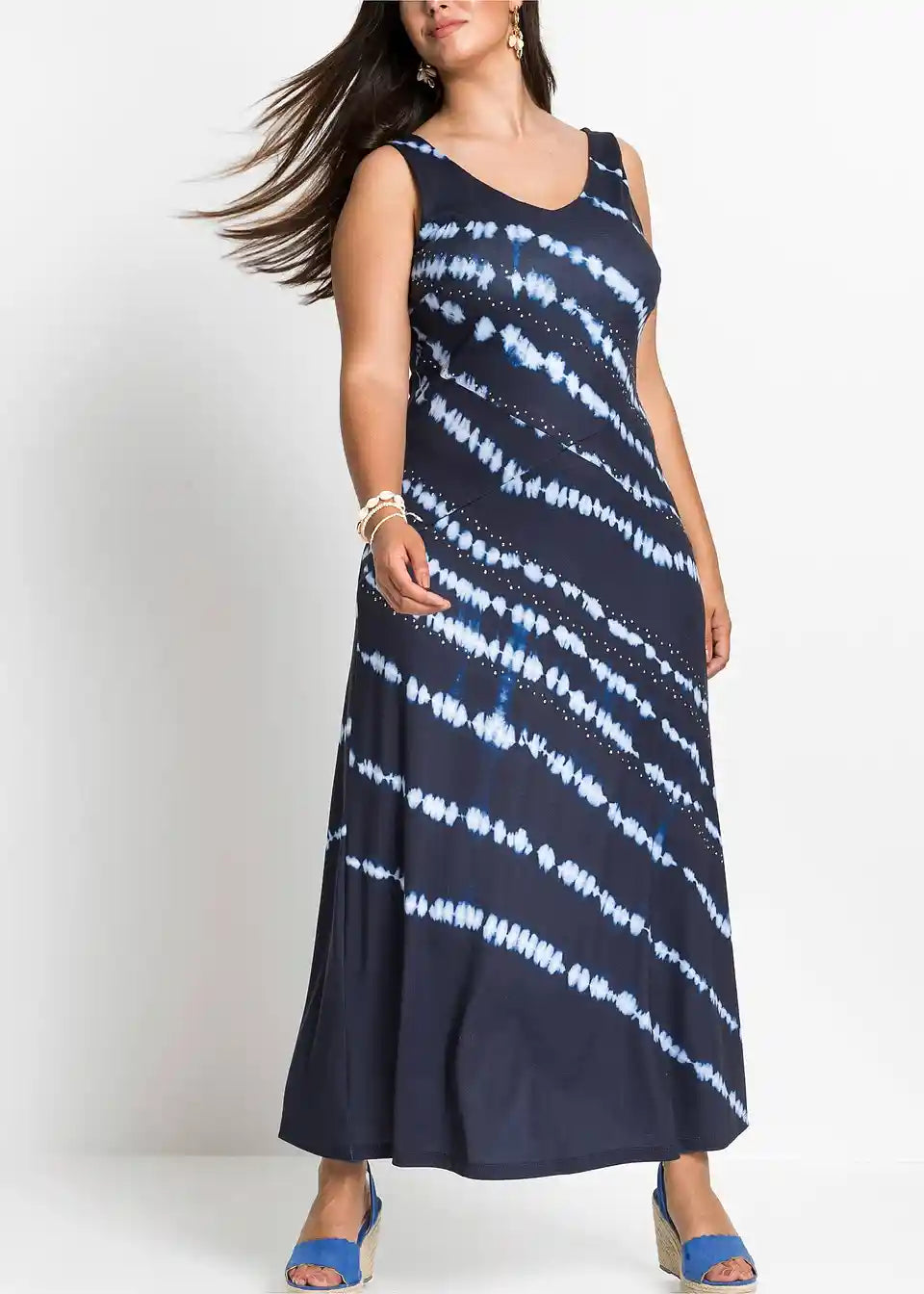 Maxi haljina s dubokim izrezom, batik uzorkom i ukrasnim kamenčićima