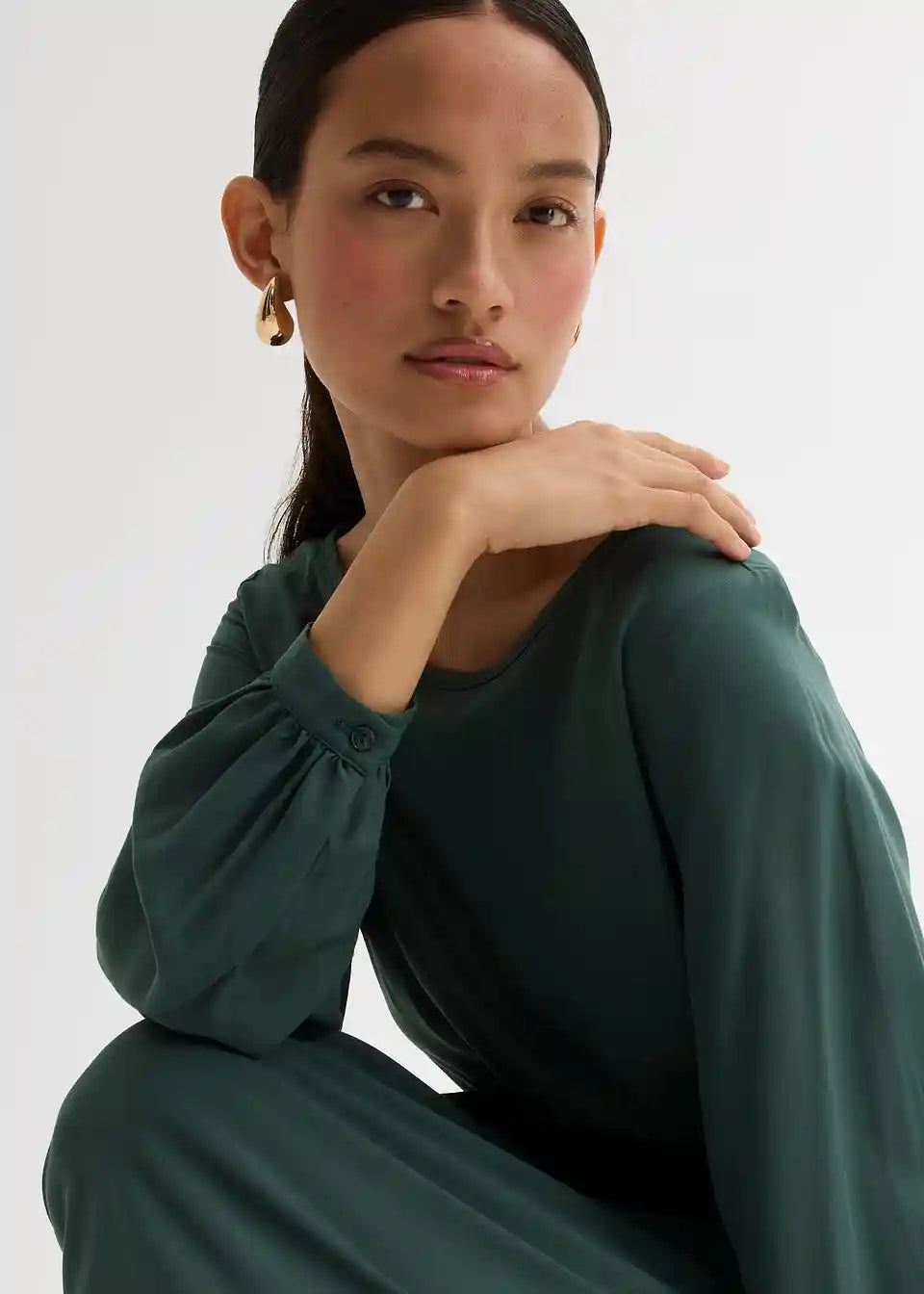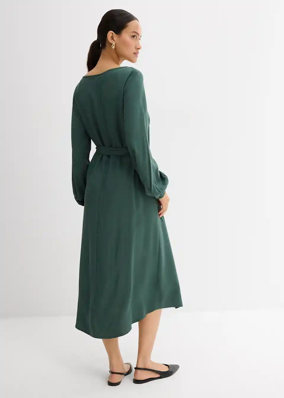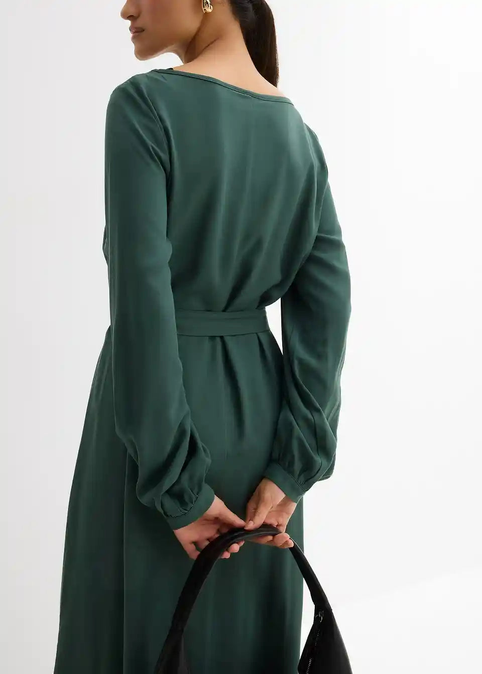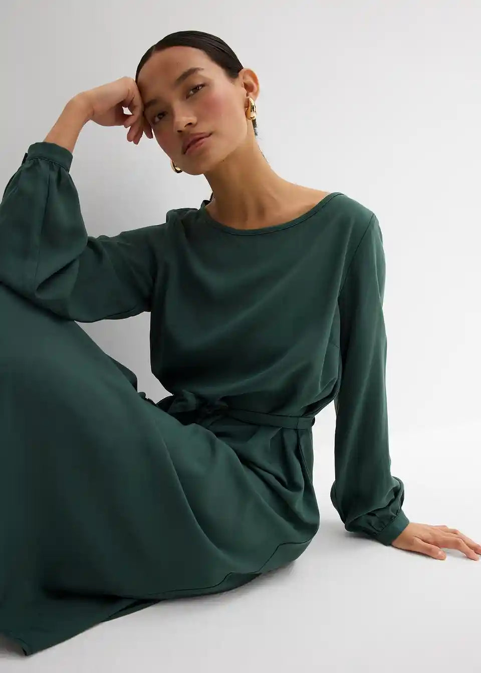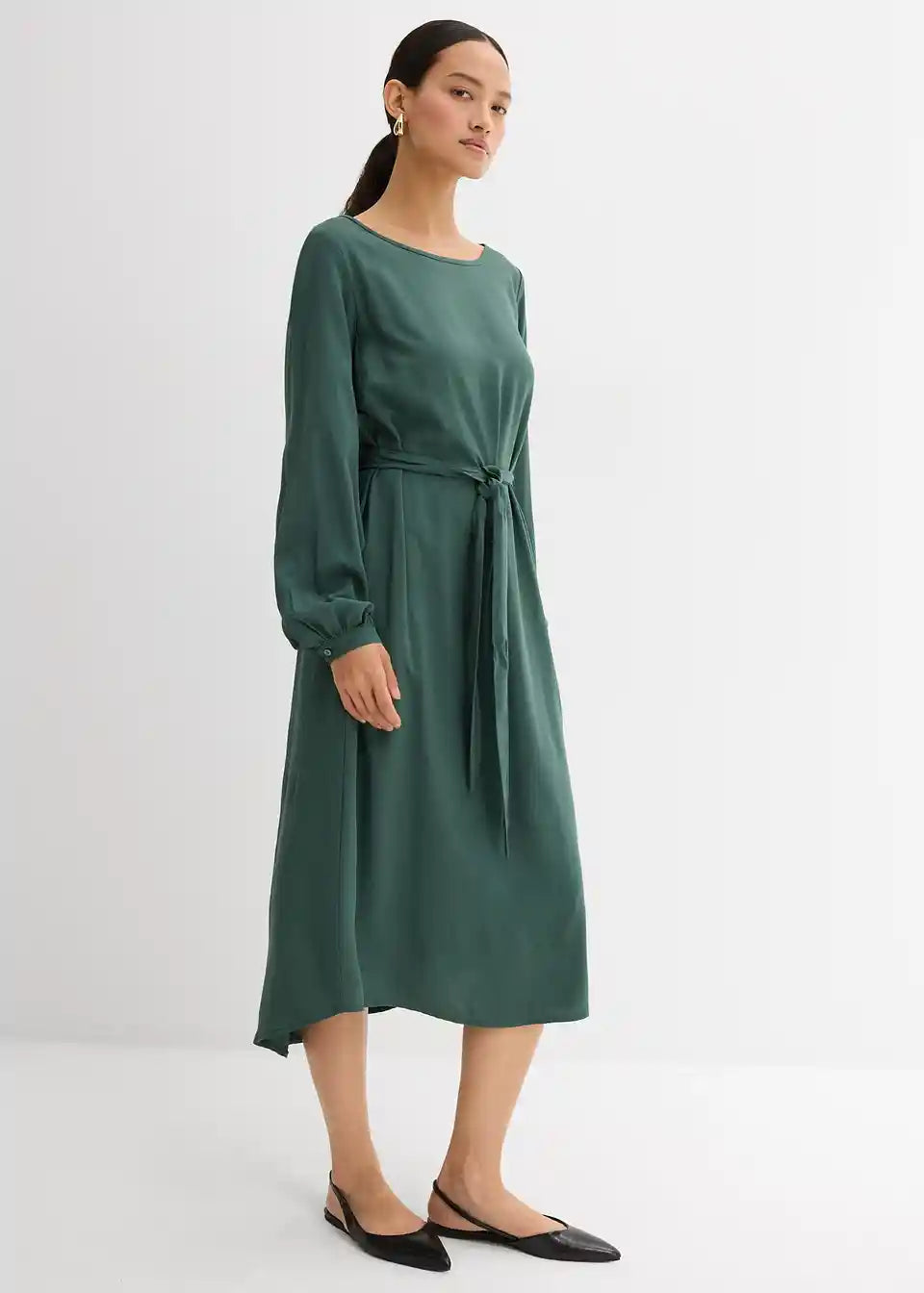 Midihaljina s okruglim izrezom, dugim biskupskim rukavima i pojasom u struku
