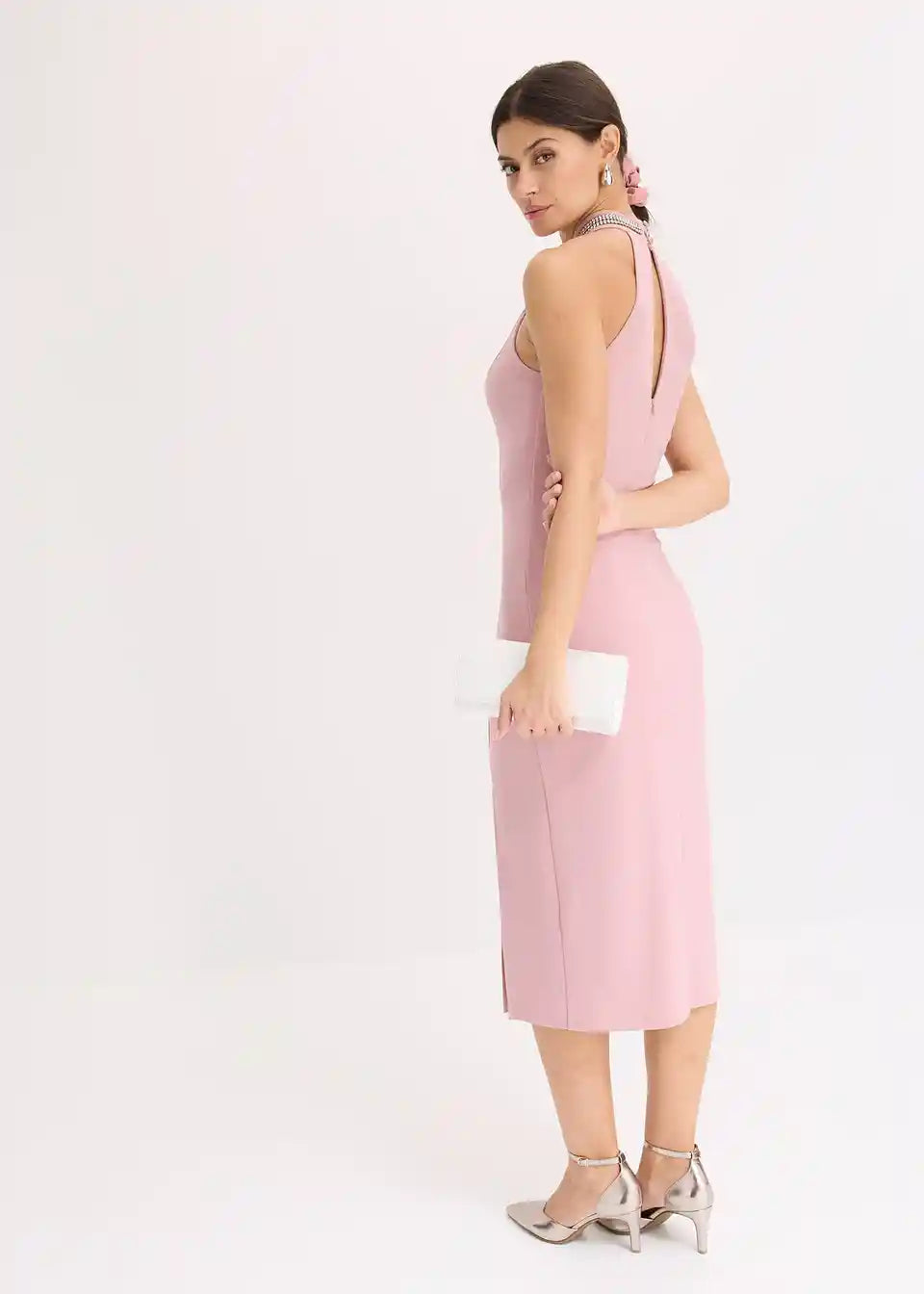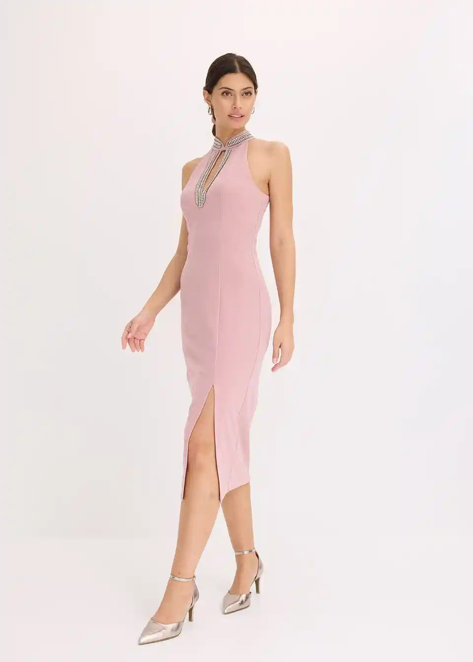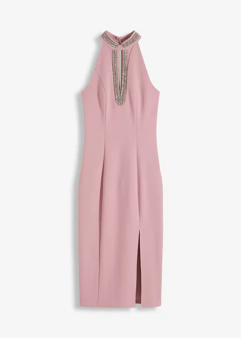 Seksi koktel haljina od strukturiranog krep materijala midi dužine s prorezom na izrezu i ukrasima od kristalića