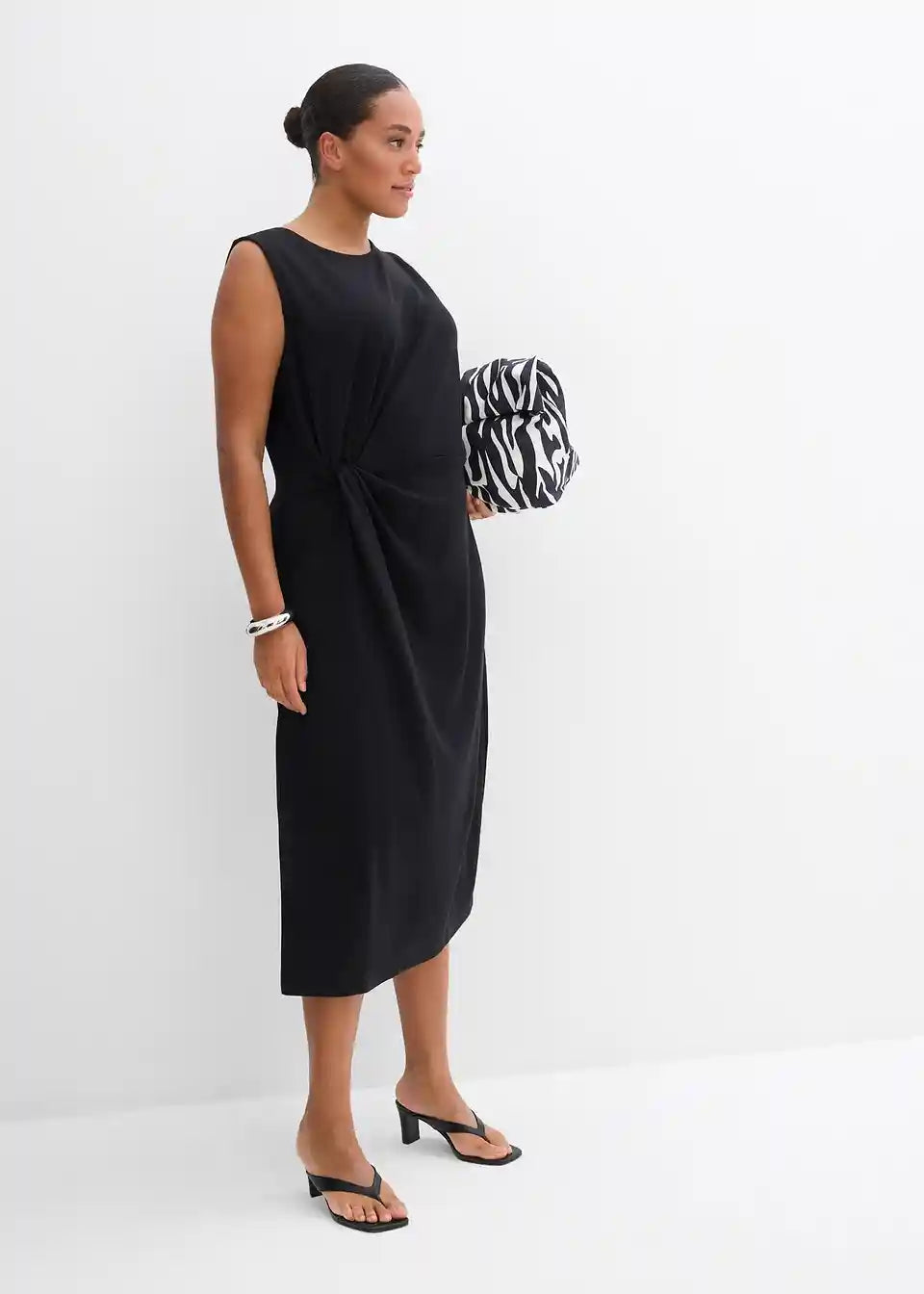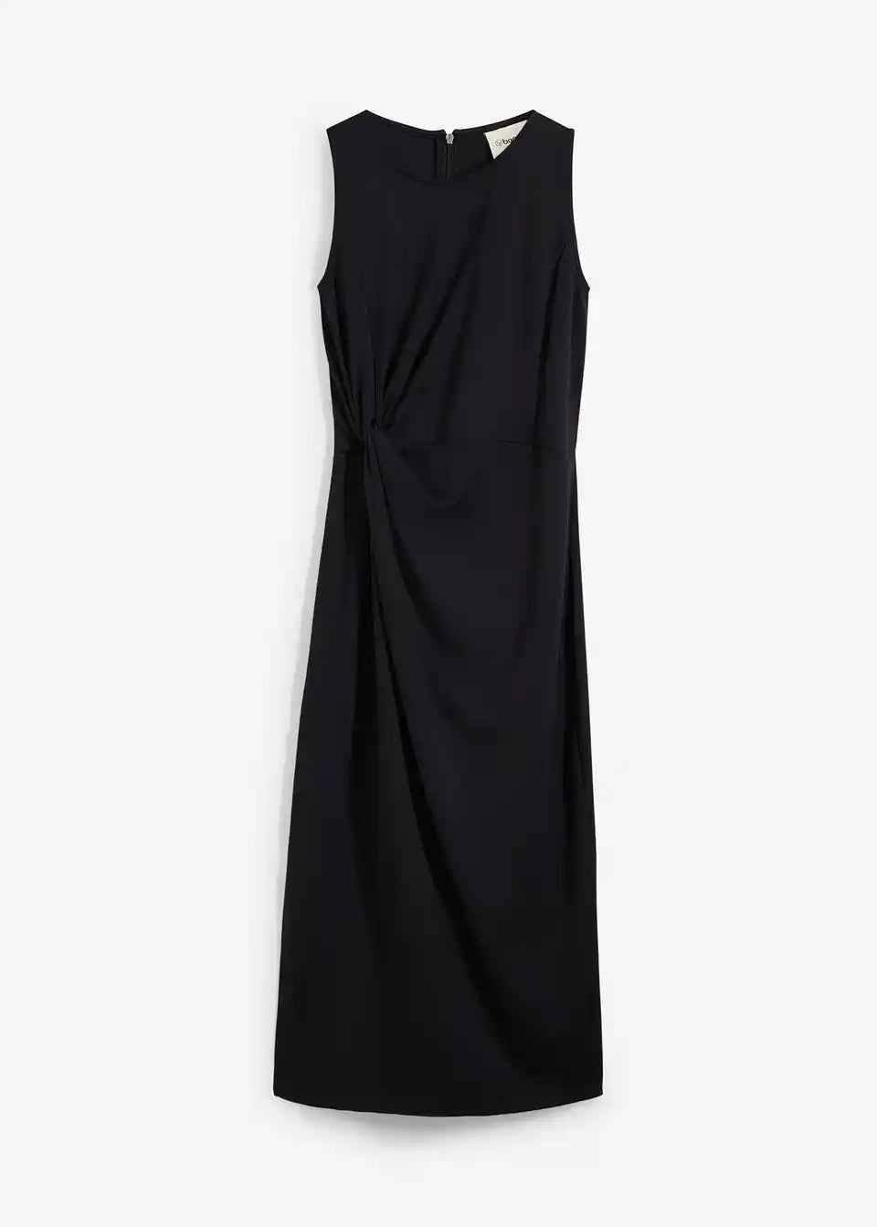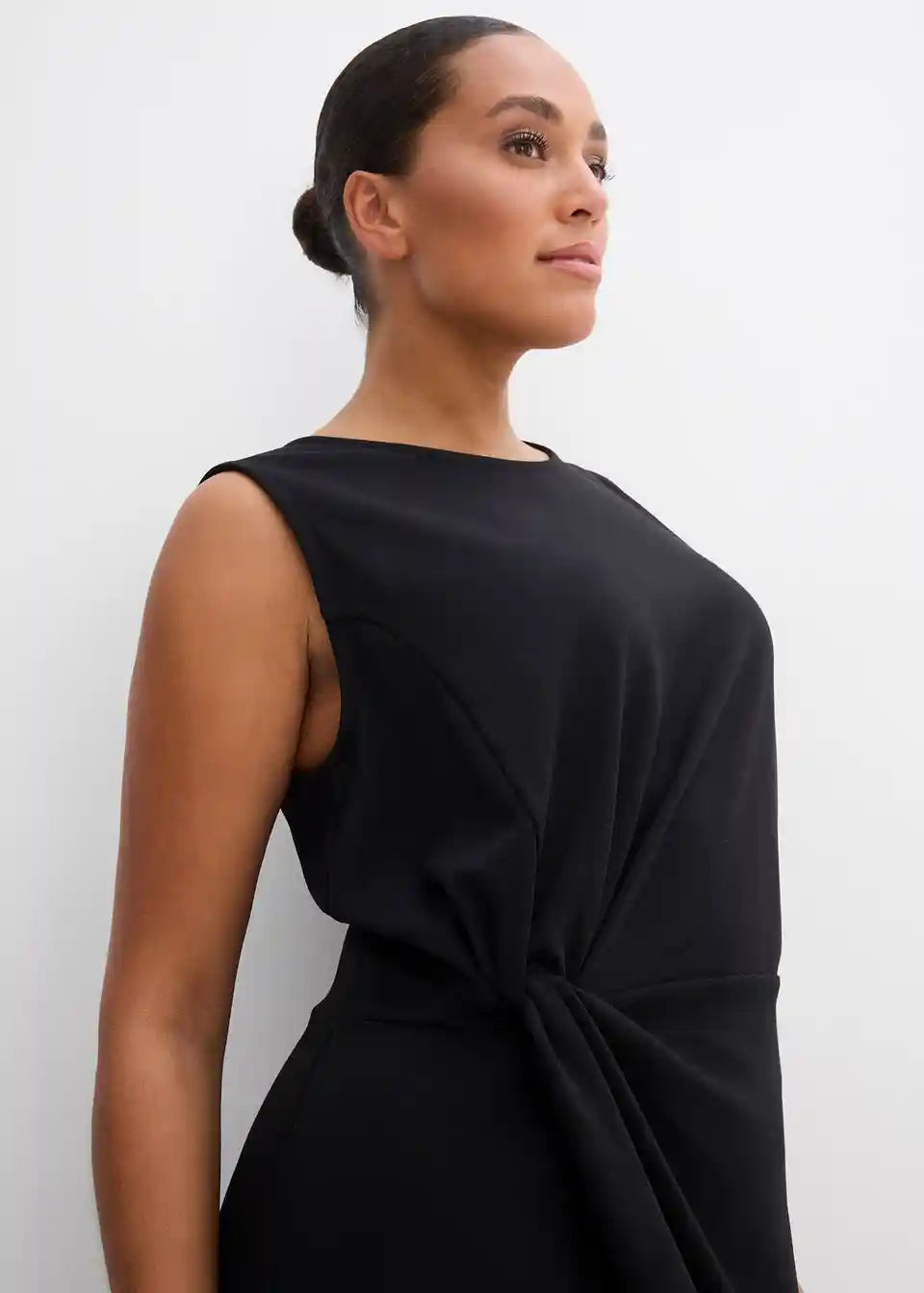Haljina srednje dužine bez rukava s okruglim izrezom i čvor detaljem sa strane. Rub sa bočnim prorezom i skriveni patentni zatvarač na leđima.