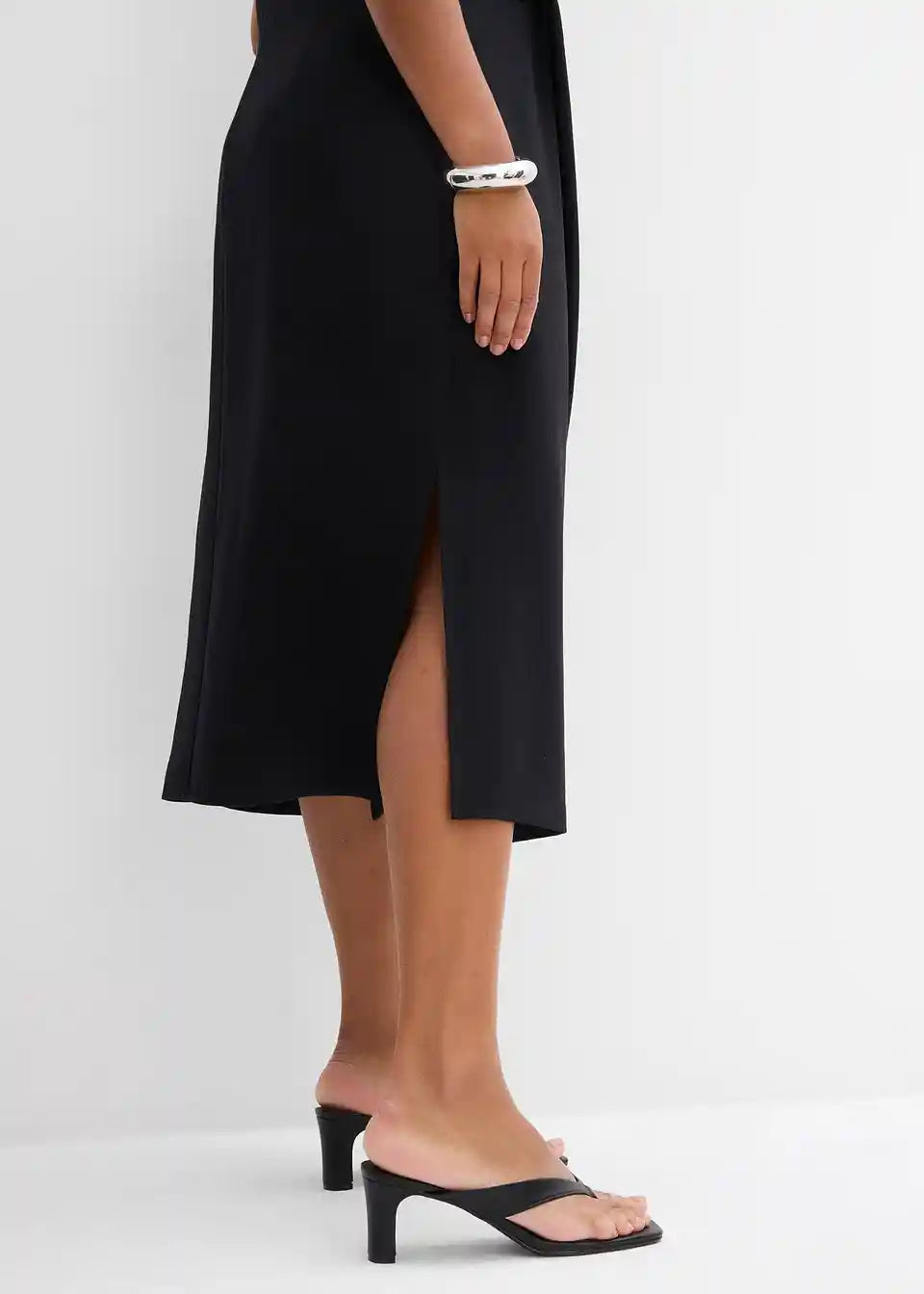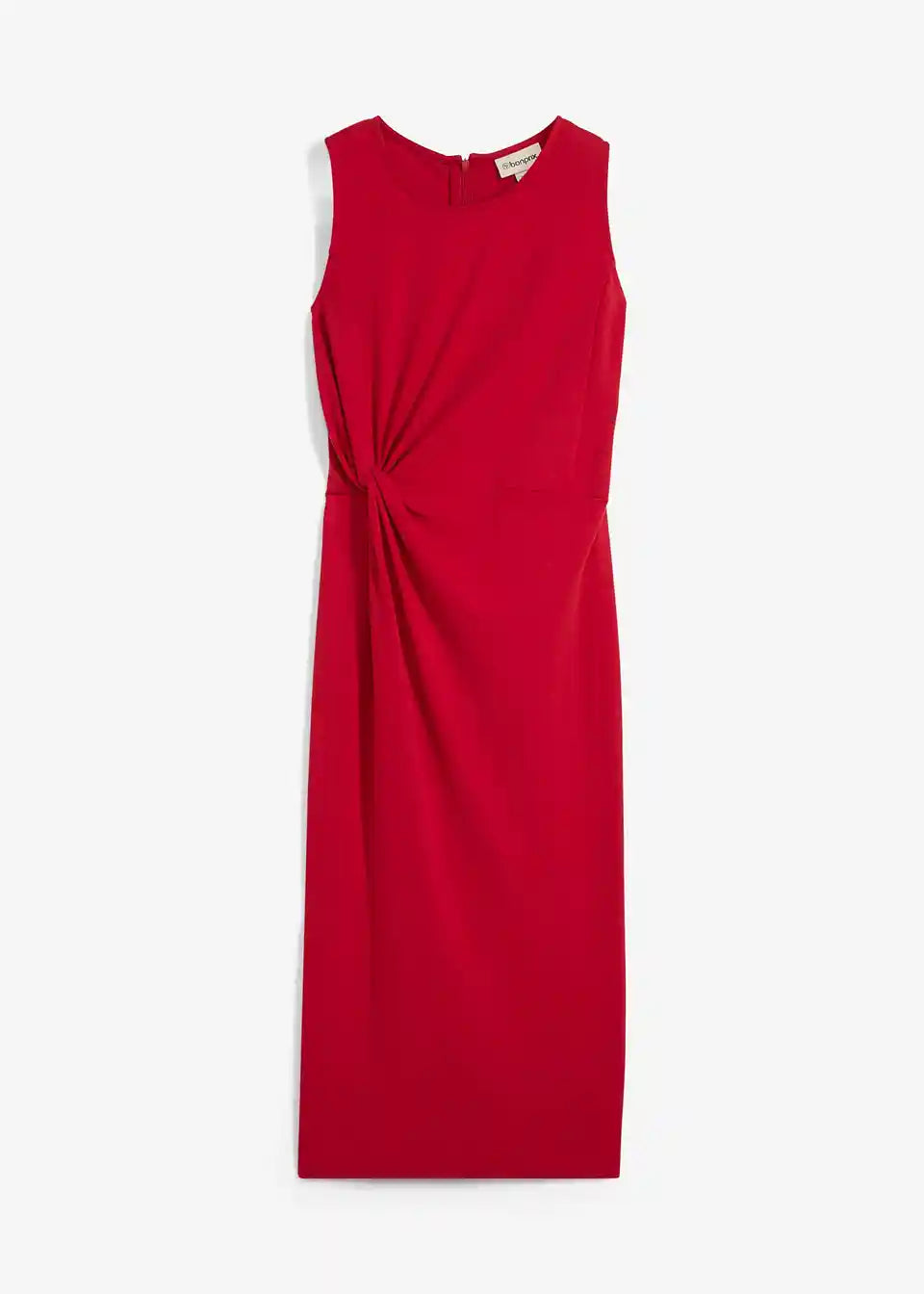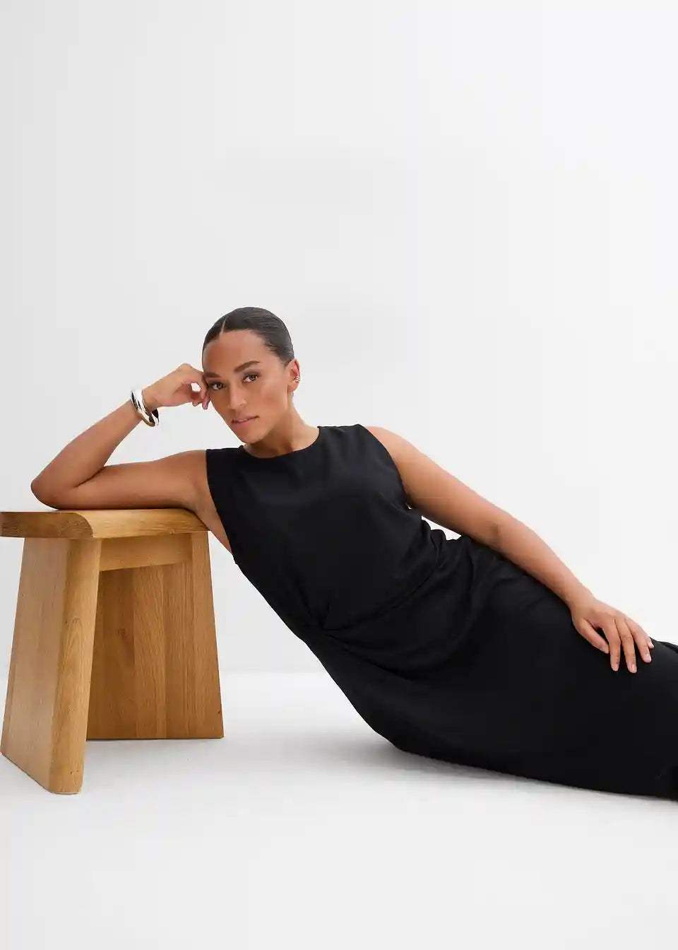 Haljina srednje dužine bez rukava s okruglim izrezom i čvor detaljem sa strane. Rub sa bočnim prorezom i skriveni patentni zatvarač na leđima.