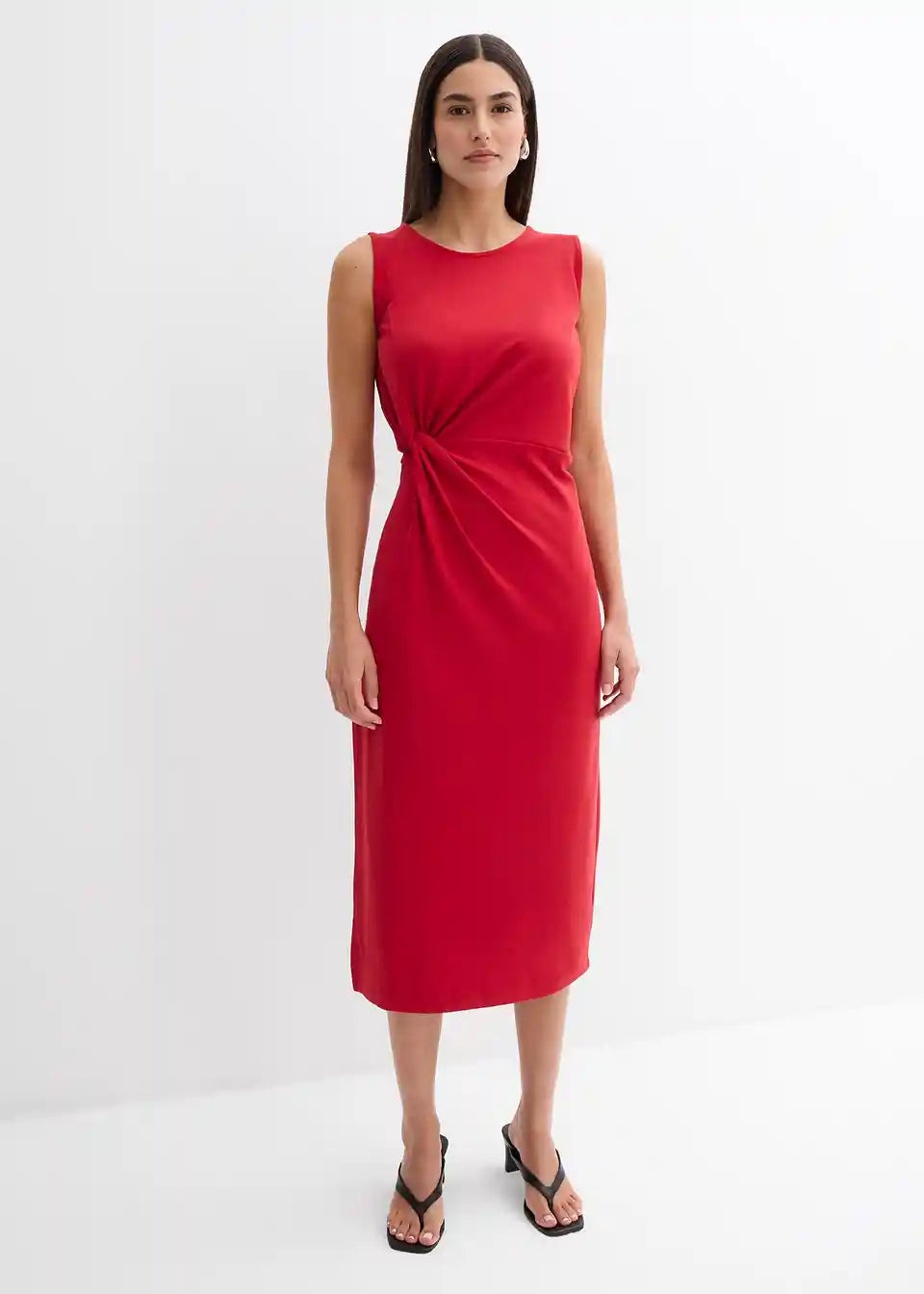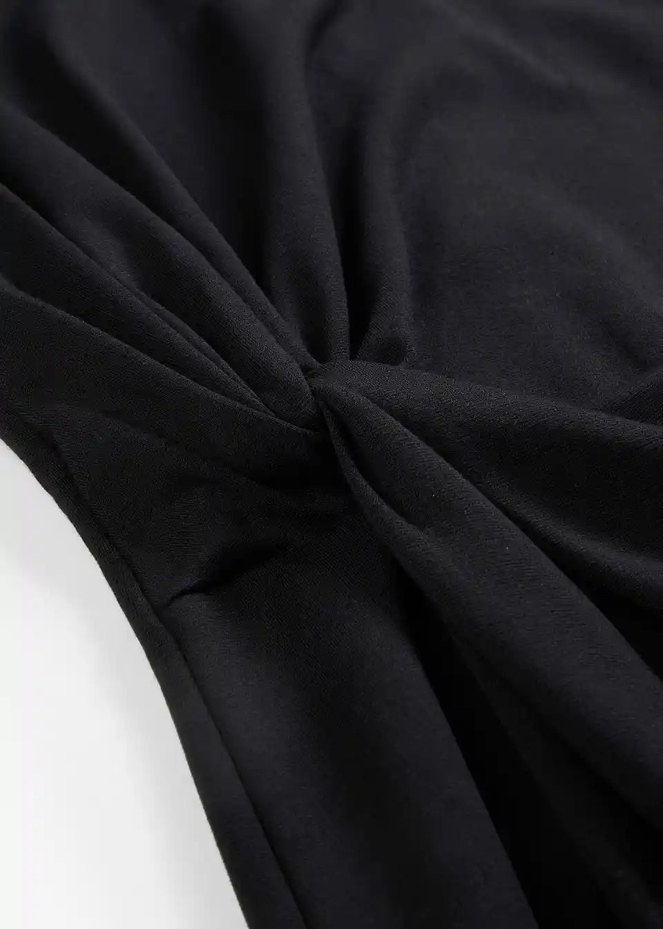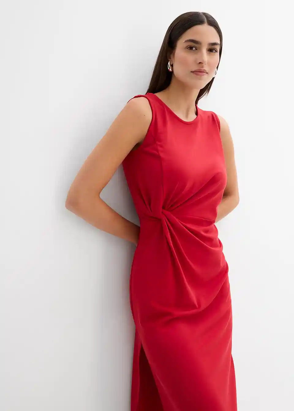 Haljina srednje dužine bez rukava s okruglim izrezom i detaljem čvora sa strane. Porub s bočnim prorezom i skrivenim patentnim zatvaračem na leđima.