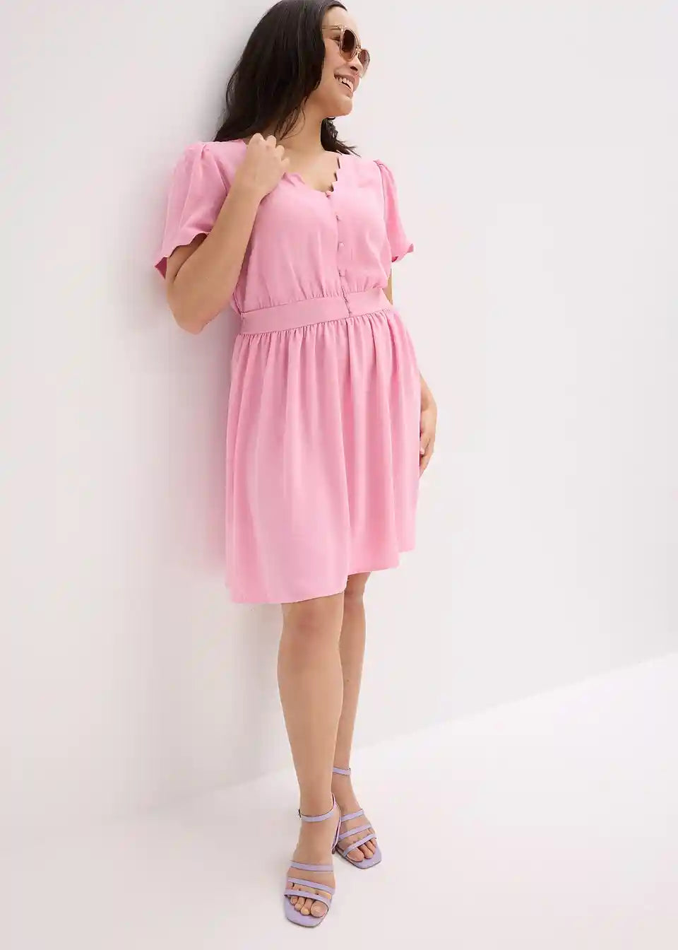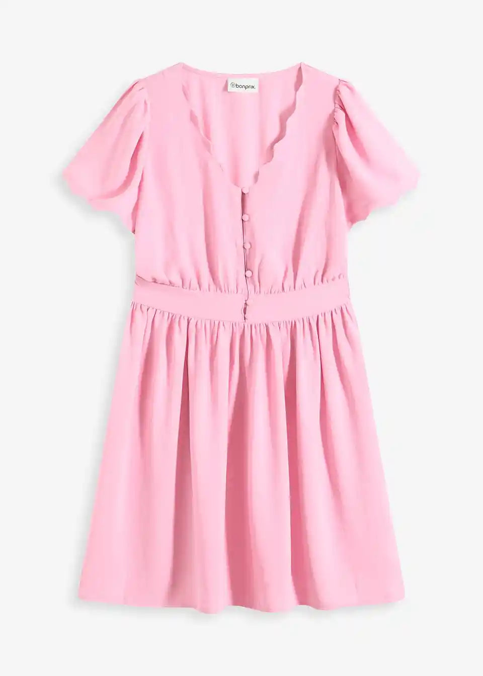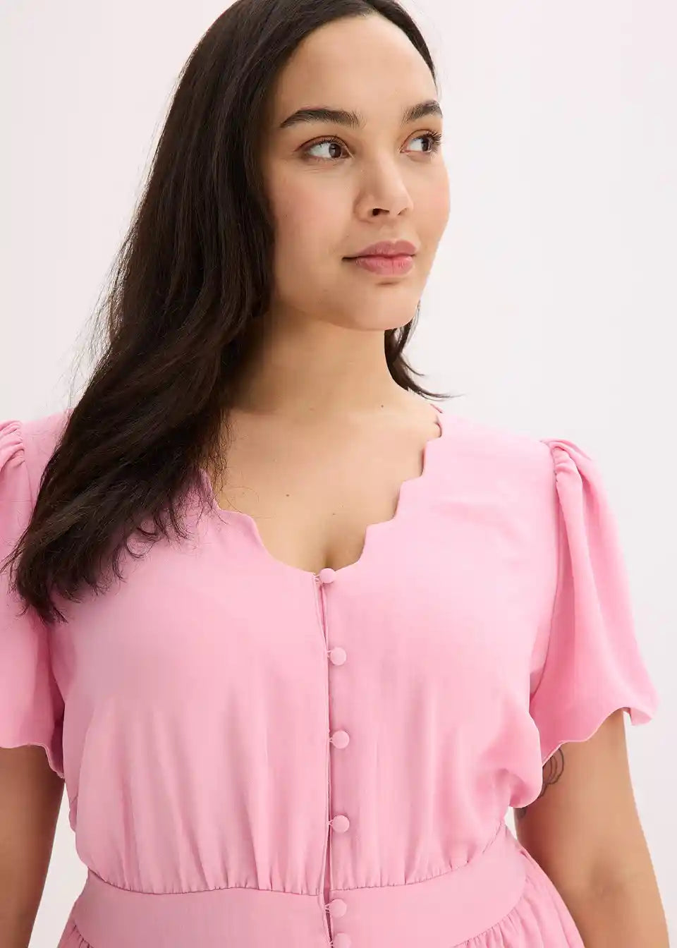 ženstvena haljina s gumbima sprijeda i ukrasnim valovitim rubom na izrezu i rubu rukava