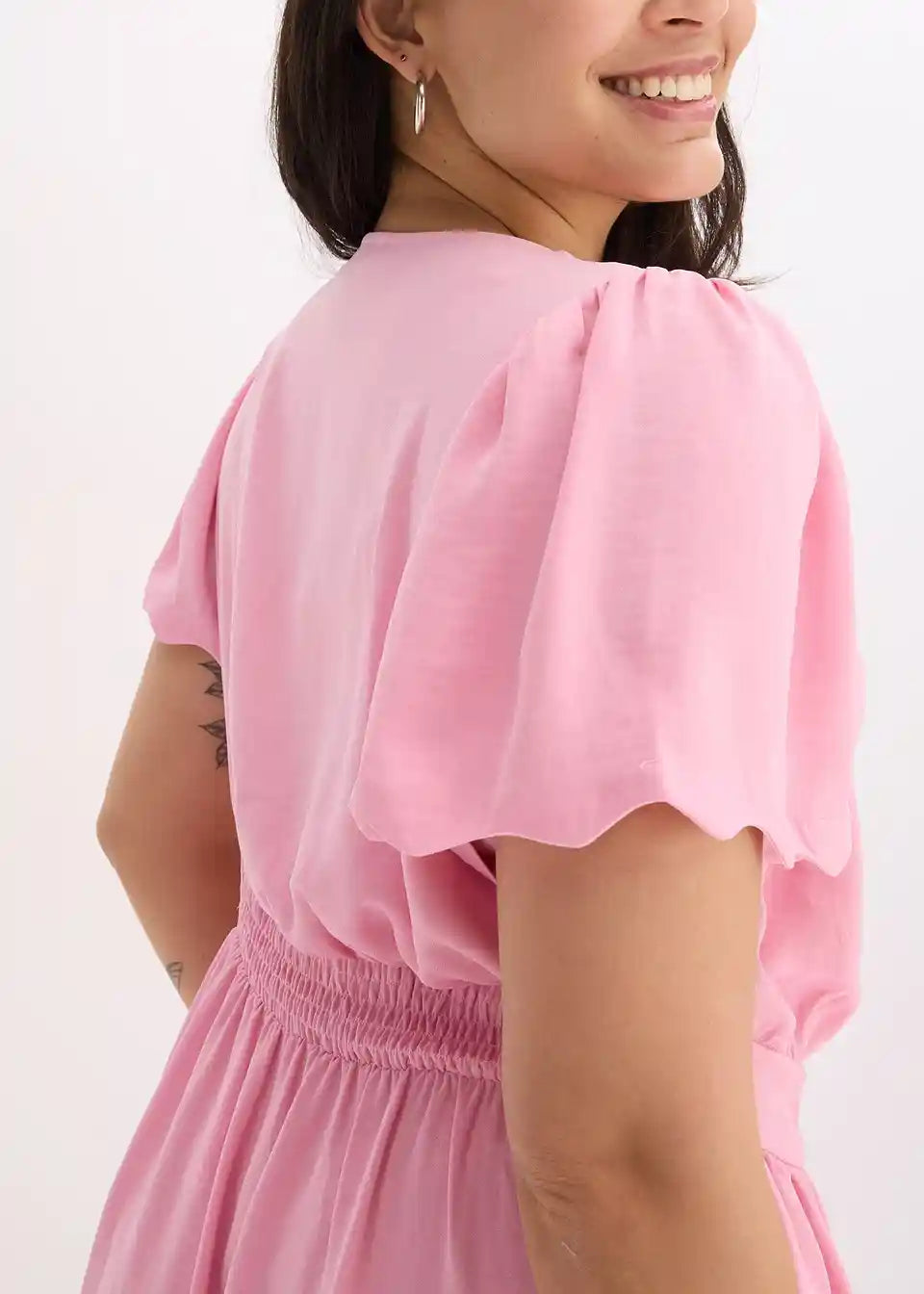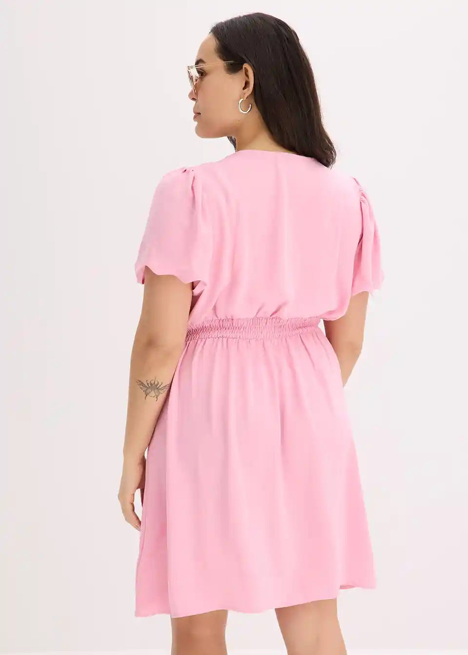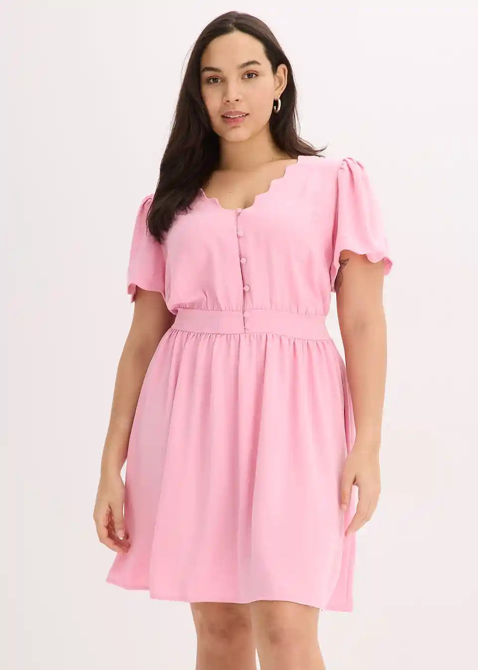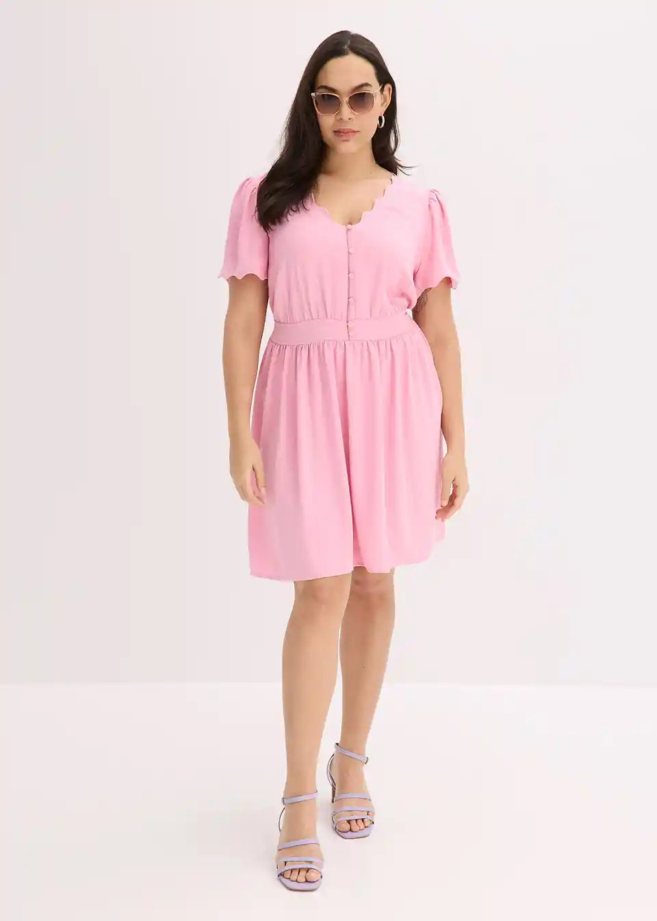 ženstvena haljina s gumbima sprijeda i ukrasnim valovitim rubom na izrezu i rubu rukava