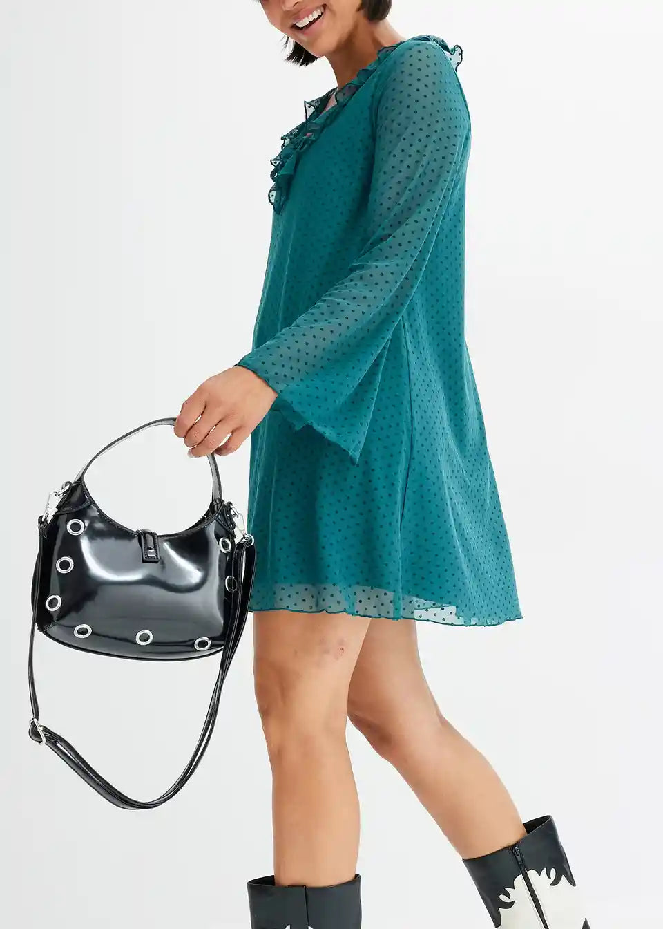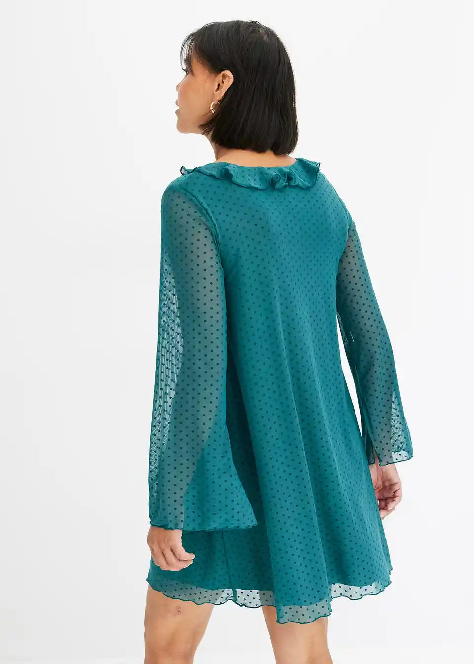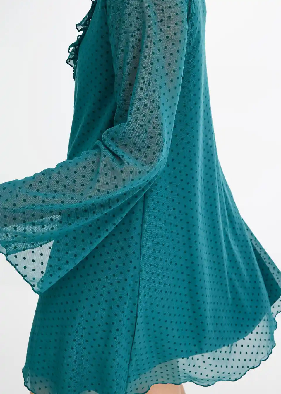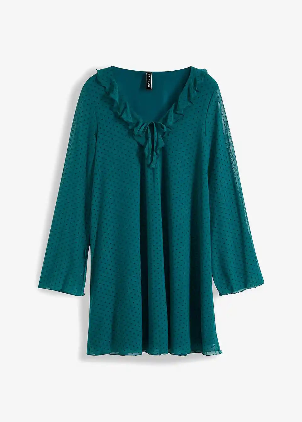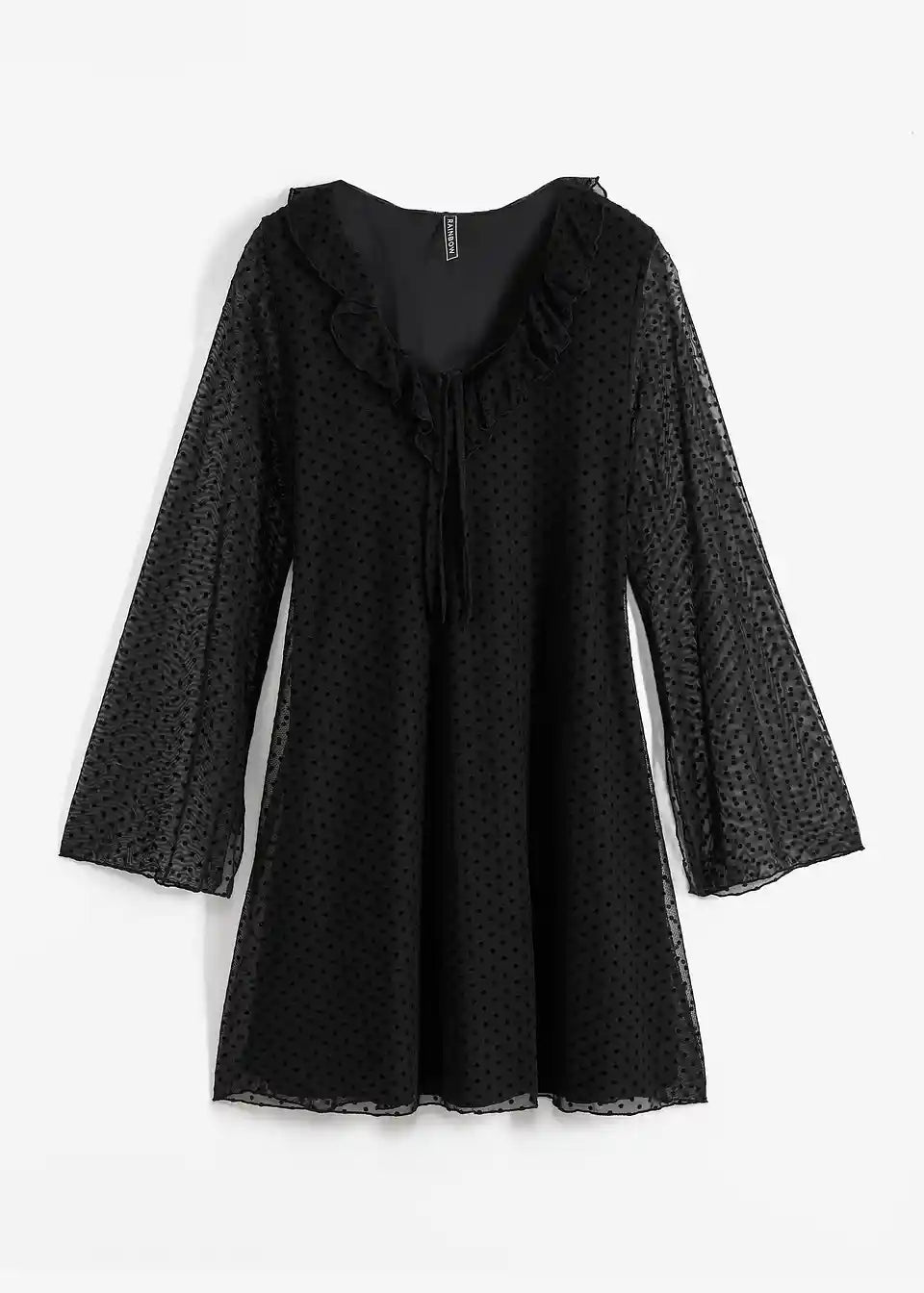 Moderna, podstavljena mini haljina od mrežaste tkanine s volanima na izrezu