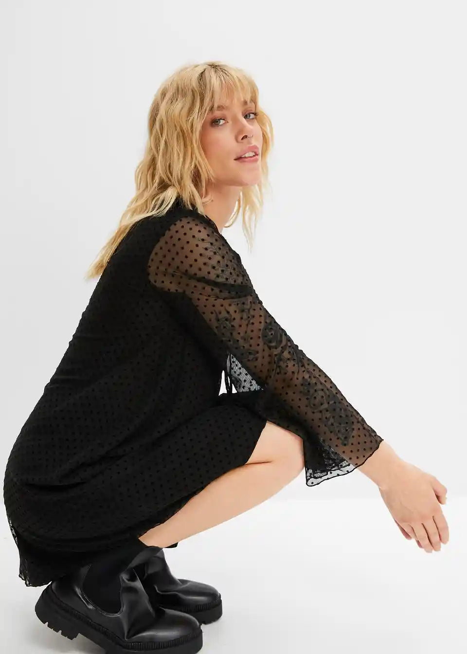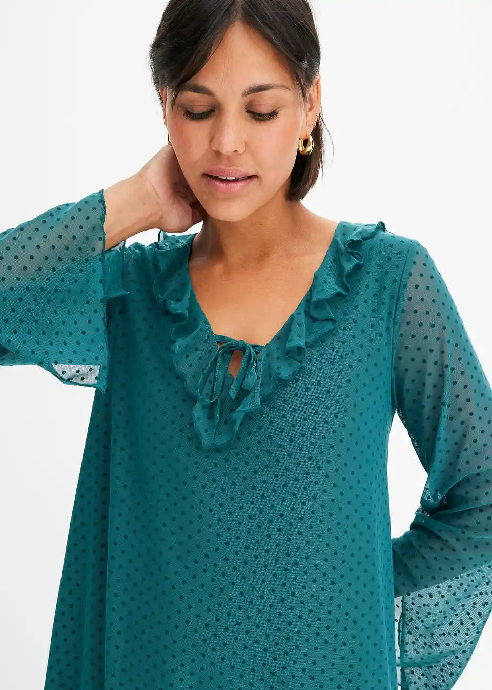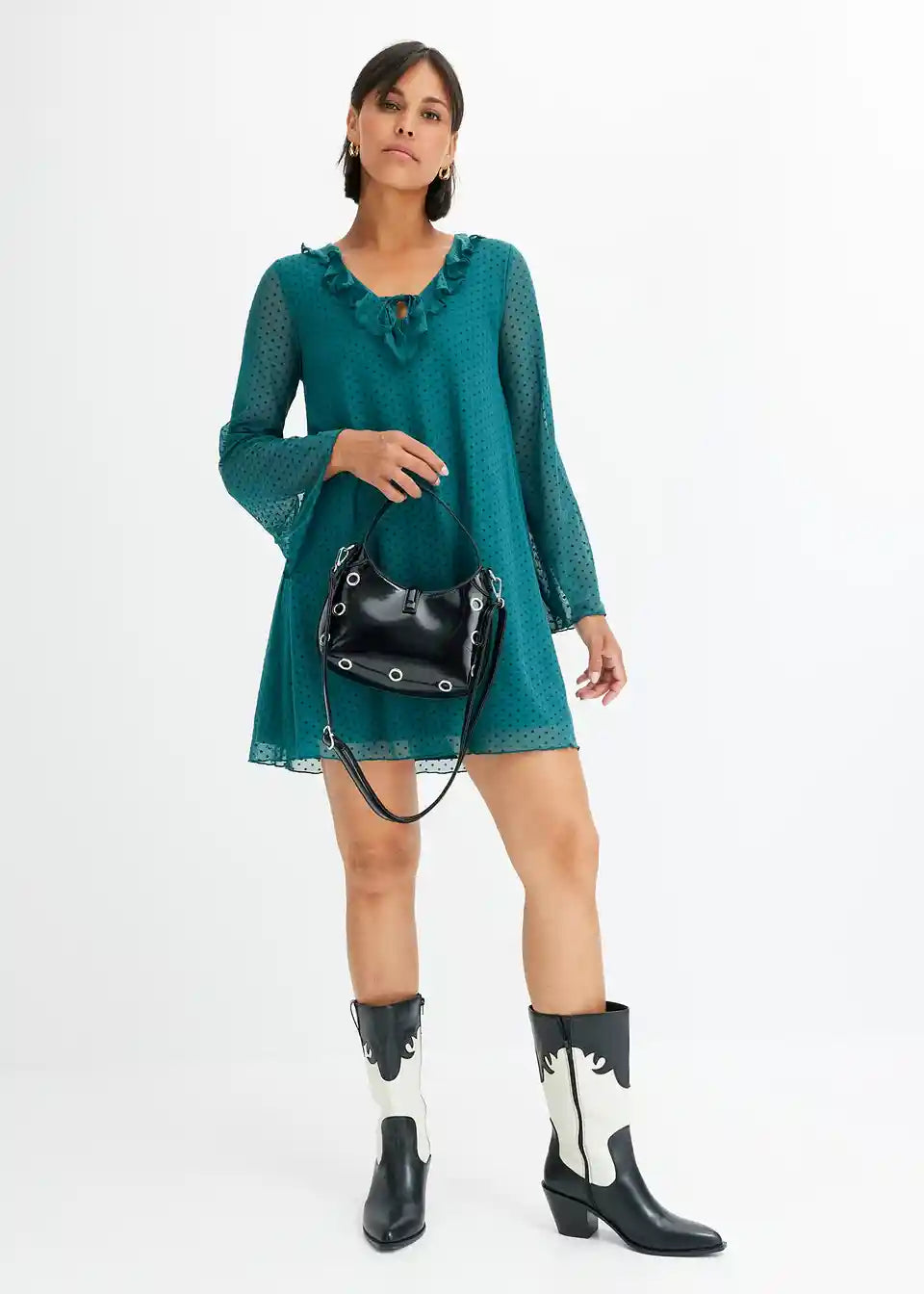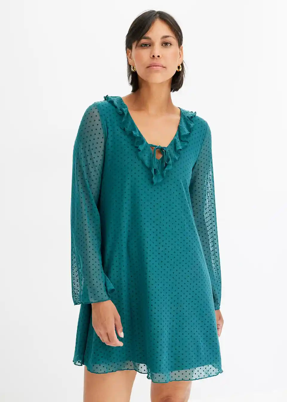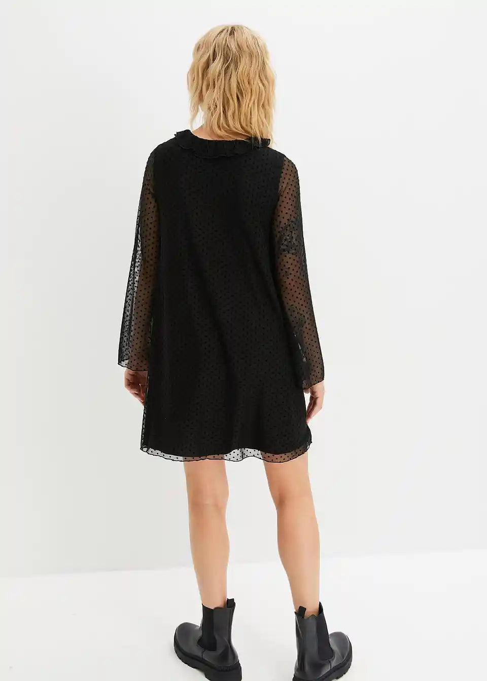 Moderna, podstavljena mini haljina od mrežaste tkanine s volanima na izrezu