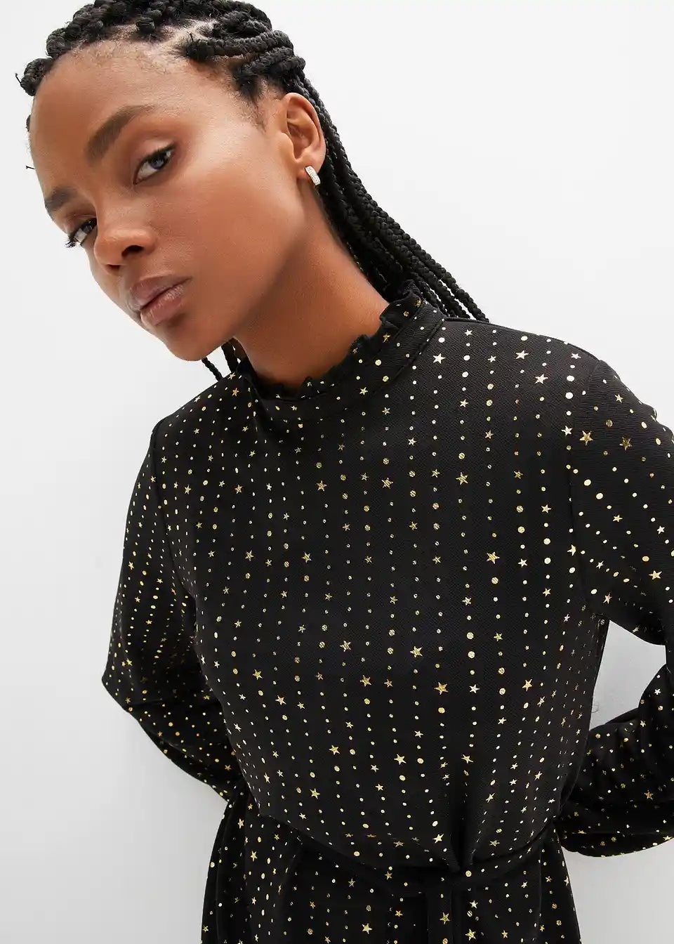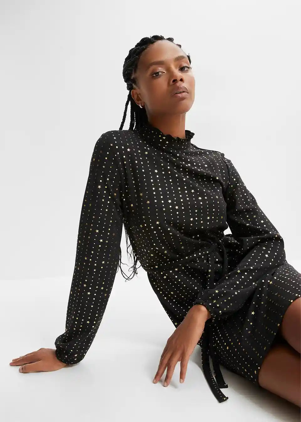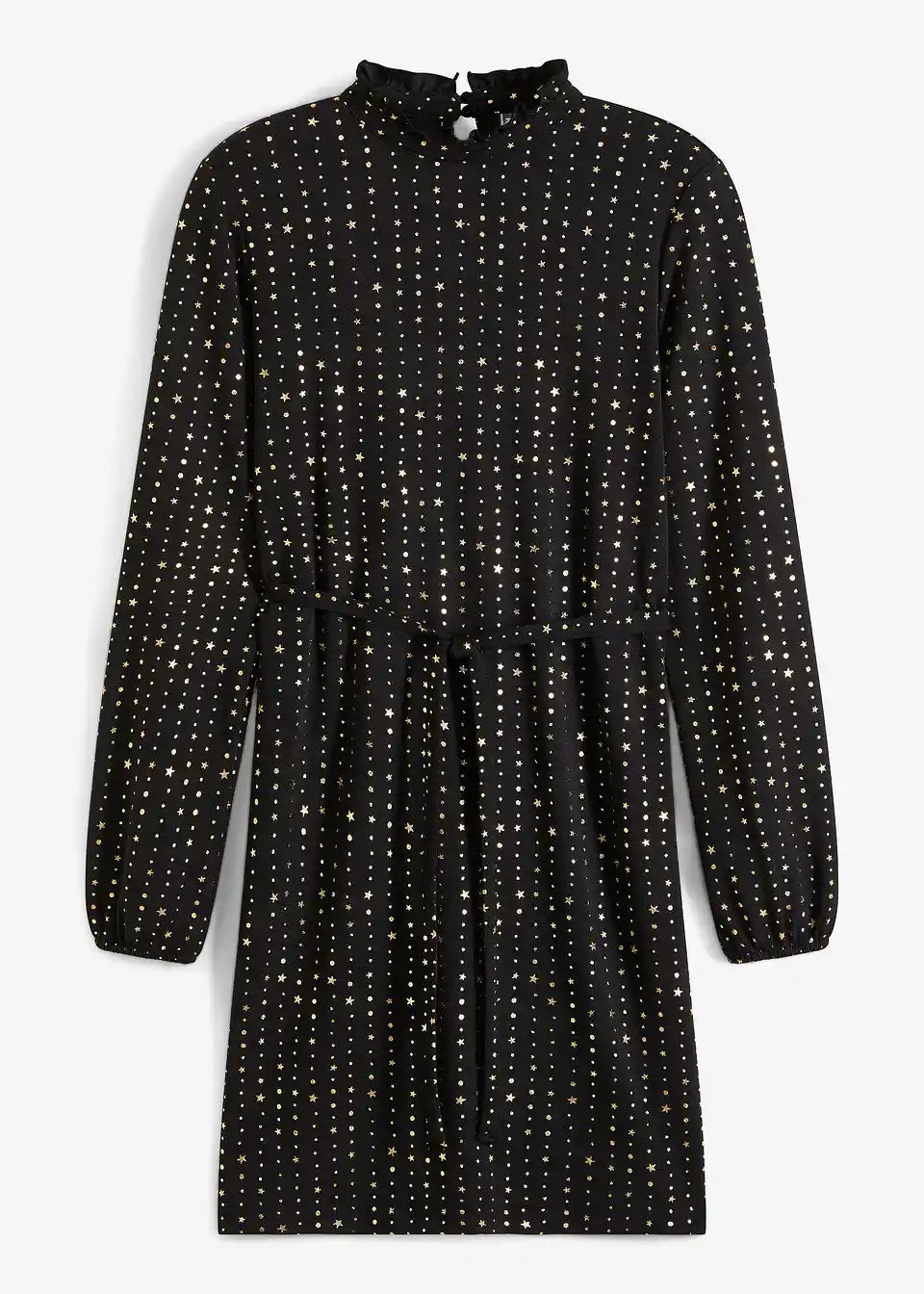 Moderna haljina s teksturiranim izgledom i vezicom, uz sjajni otisak