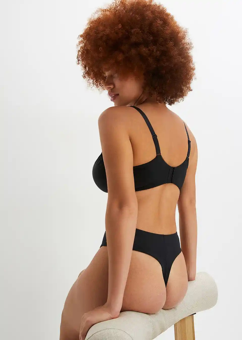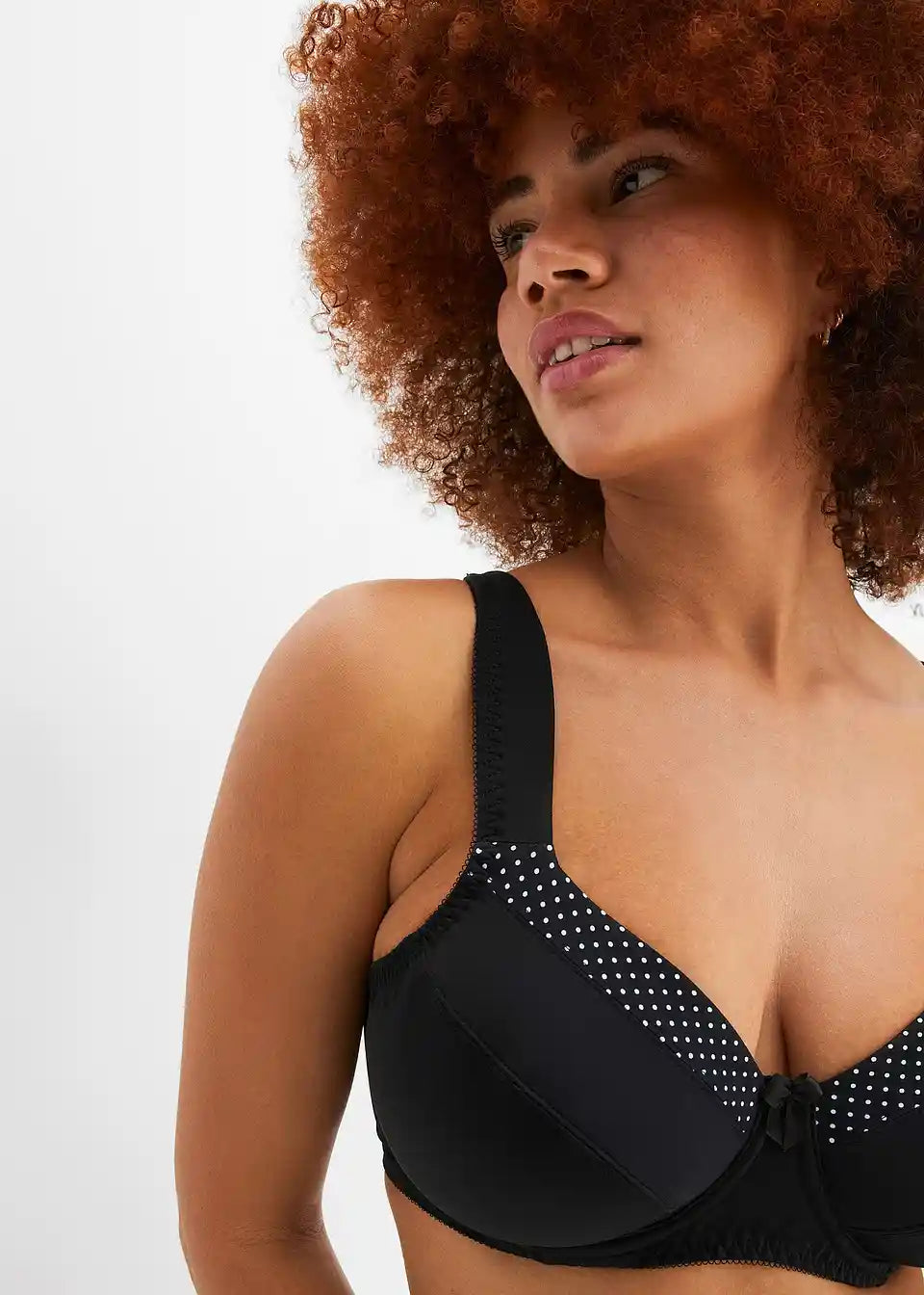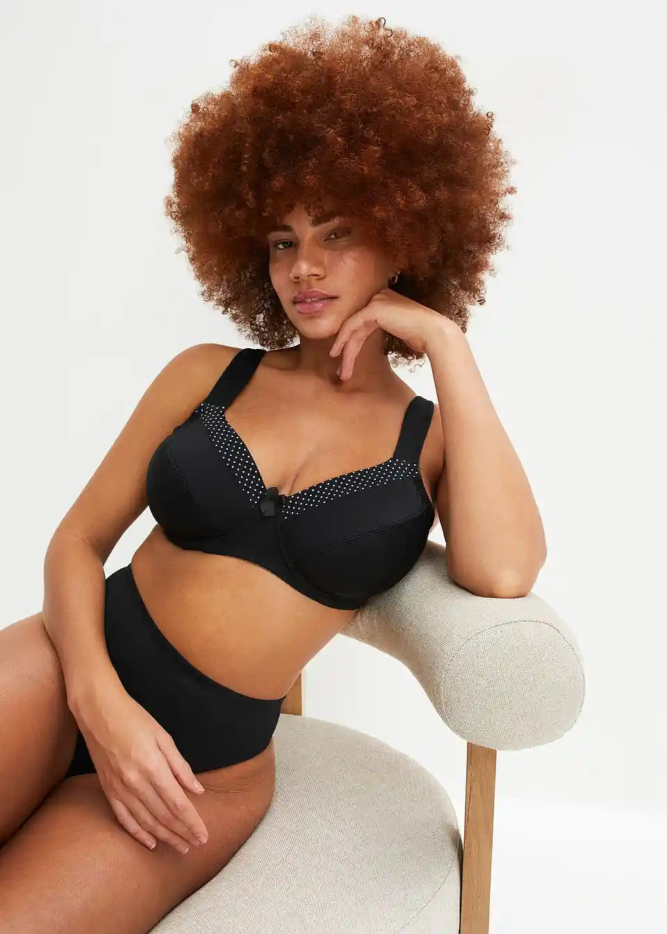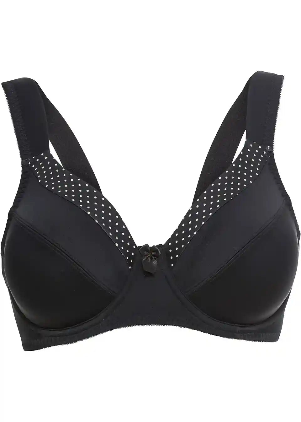 Bezvremenski uzorak s točkicama na gornjoj košarici daje funkcionalnom grudnjaku posebno ženstven izgled. Oblik minimizera s žicom vizualno smanjuje dojke i pruža dobru potporu. Kopča i podesive naramenice su šire kod većih košarica.