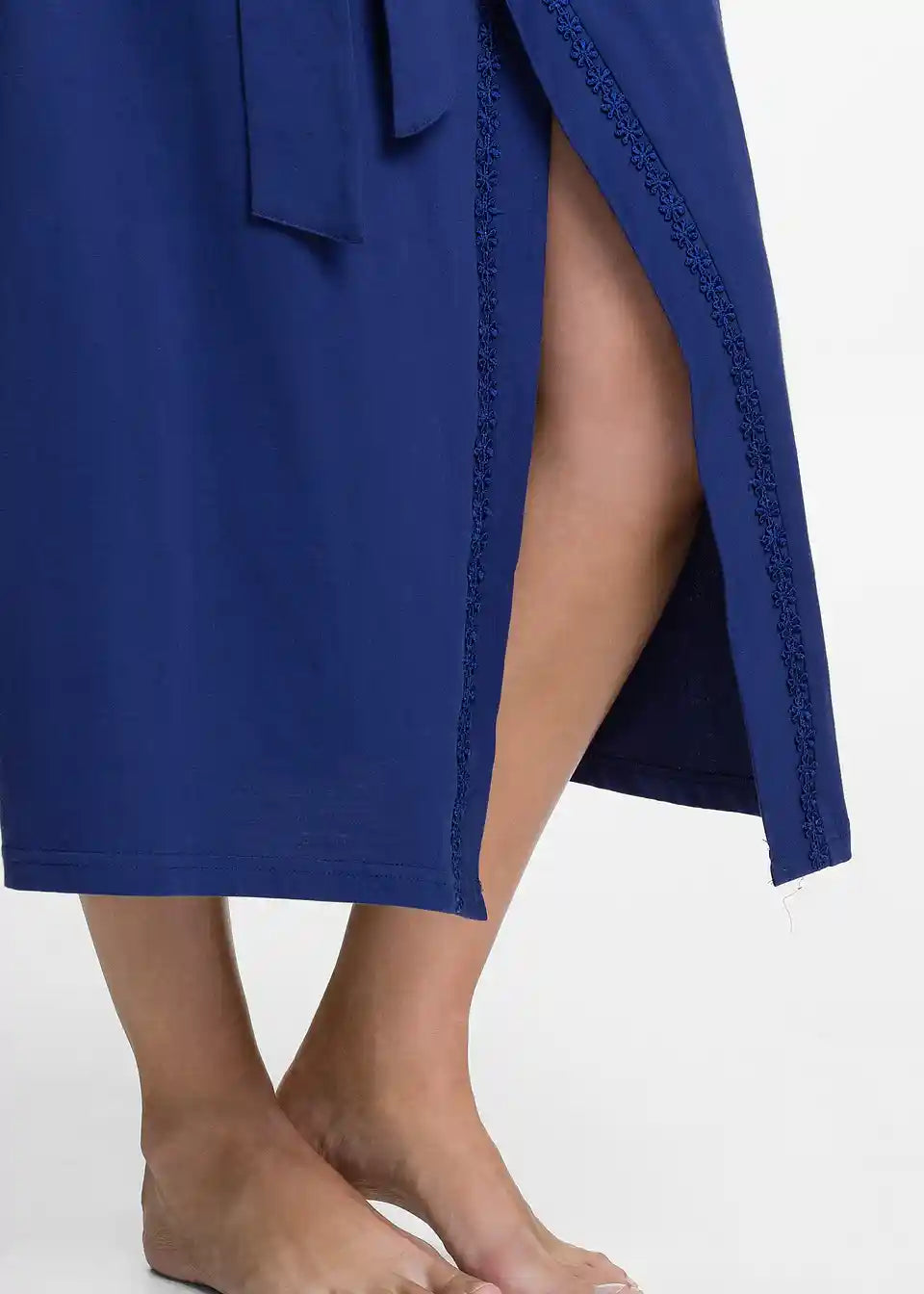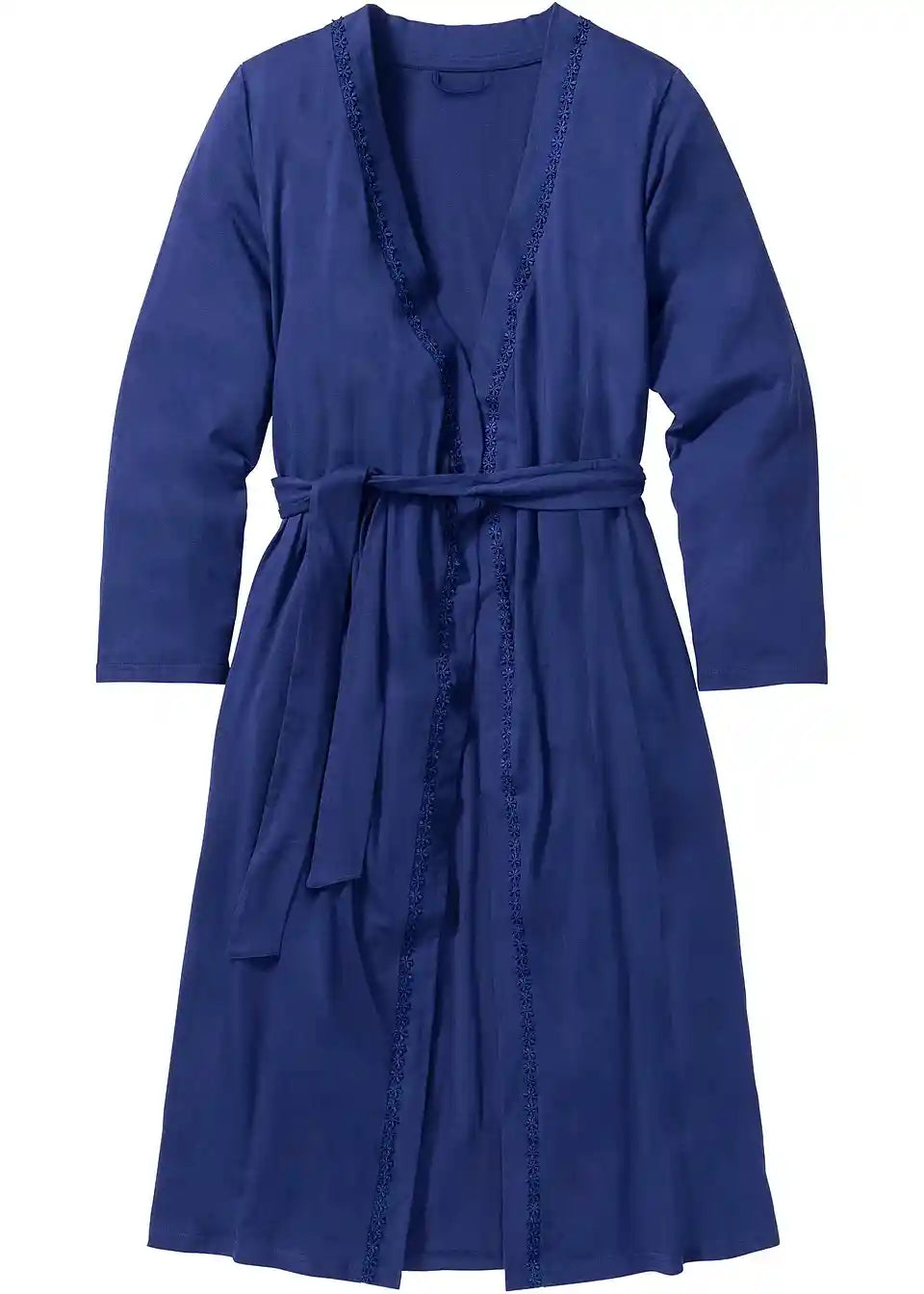 Udoban jersey ogrtač marke bpc ugodan je za nošenje tijekom sauniranja ili kao kućna odjeća preko pidžame. Mekani materijal od pamuka divno prianja uz kožu. Duž ovratnika s preklopom pa sve do ruba, ogrtač je ukrašen cvjetnim ukrasnim rubom. Model se može učvrstiti vezicom. Dva bočna džepa upotpunjuju udoban dizajn.