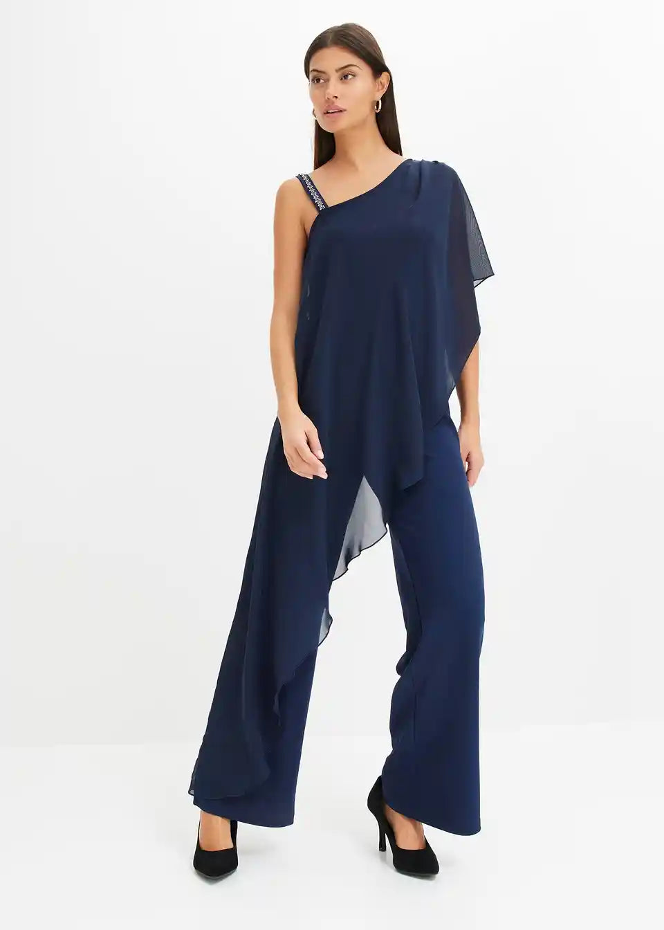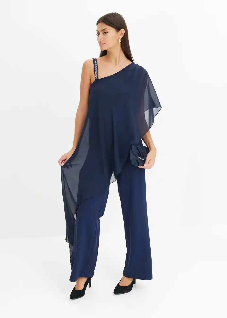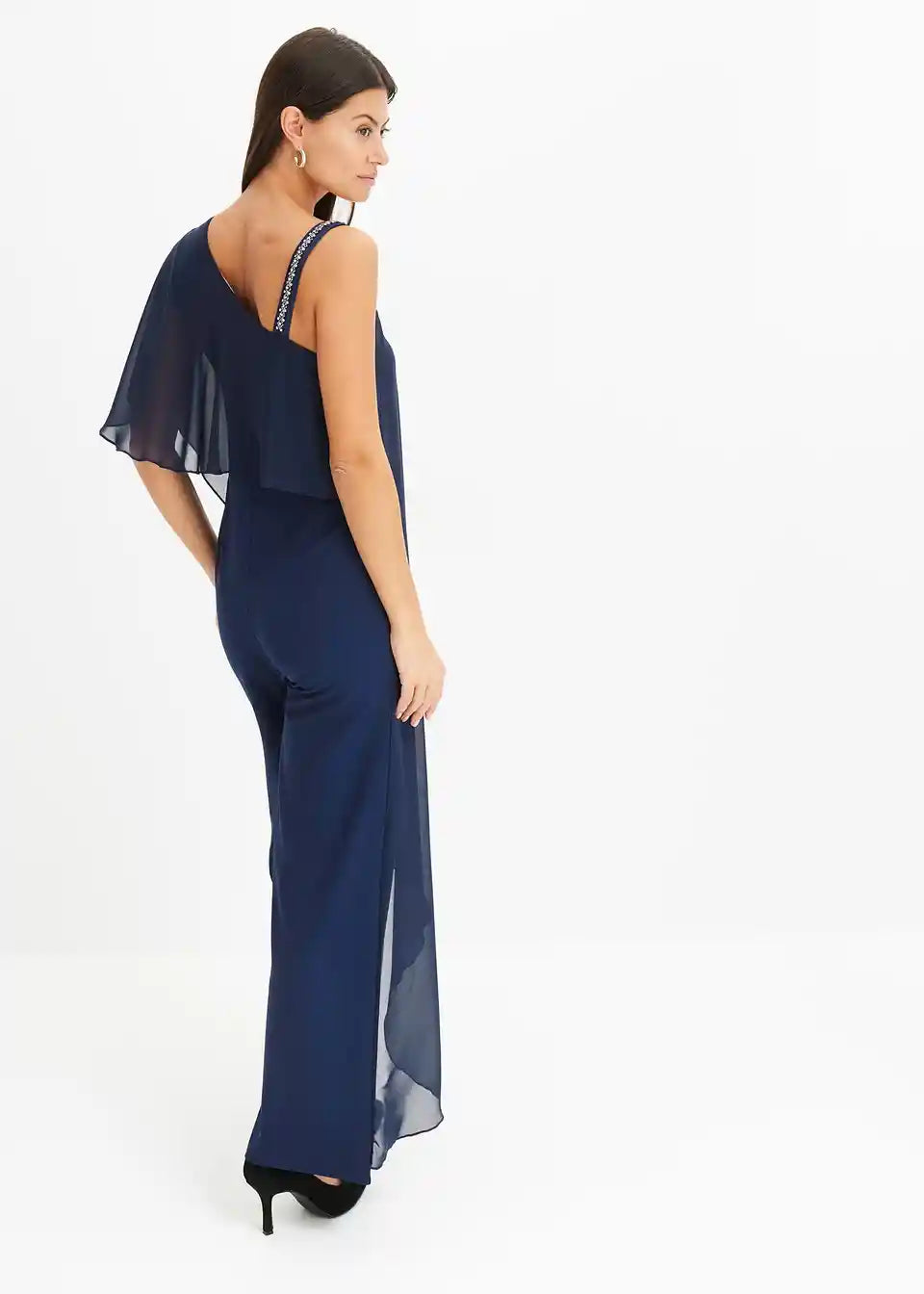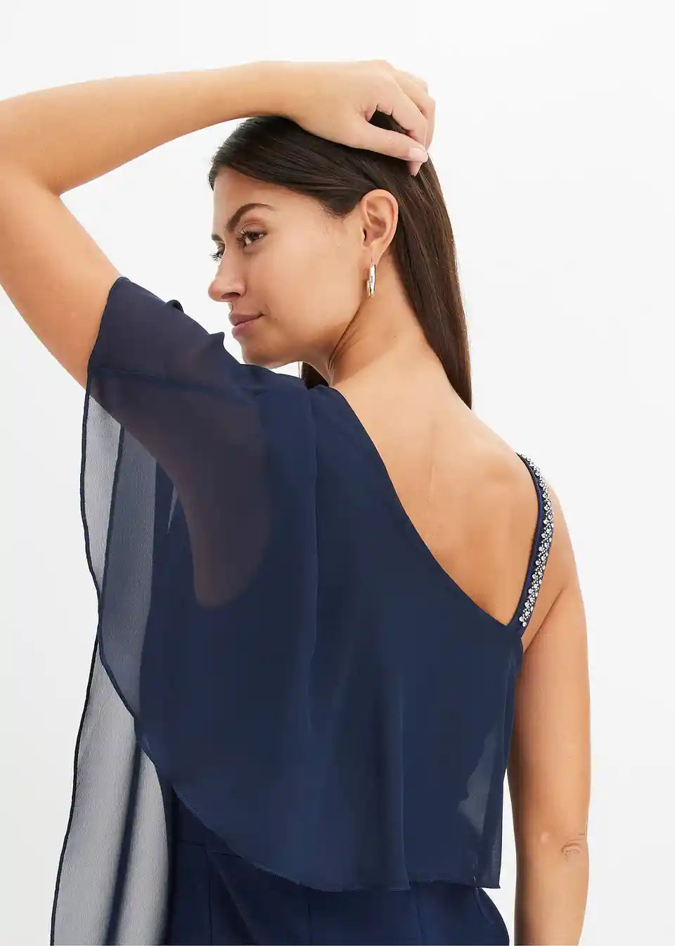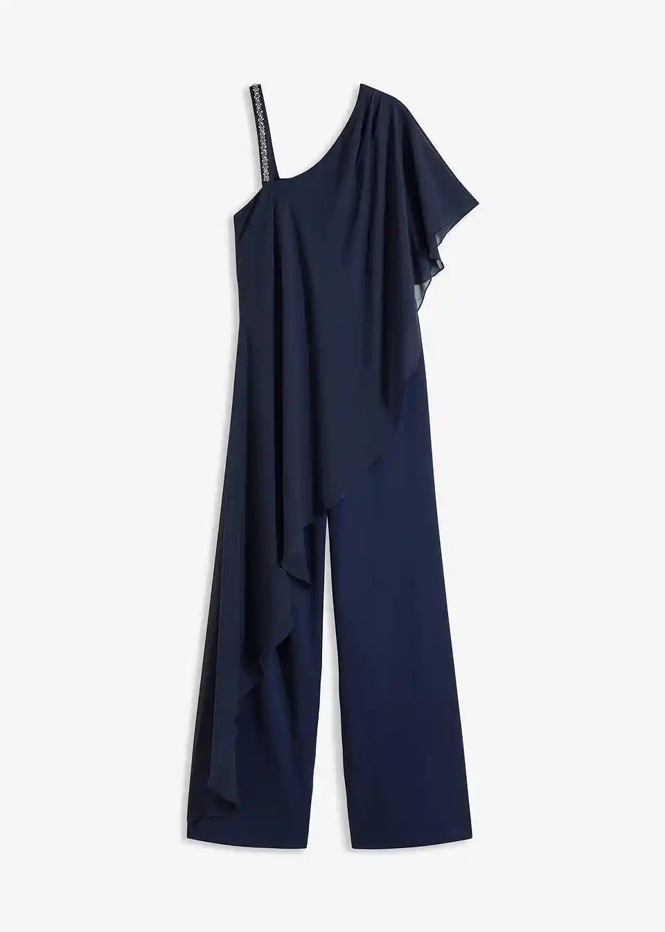 One-Shoulder Overall s prikrivajućim prekrivačem od finog šifona i naramenicom ukrašenom kamenčićima