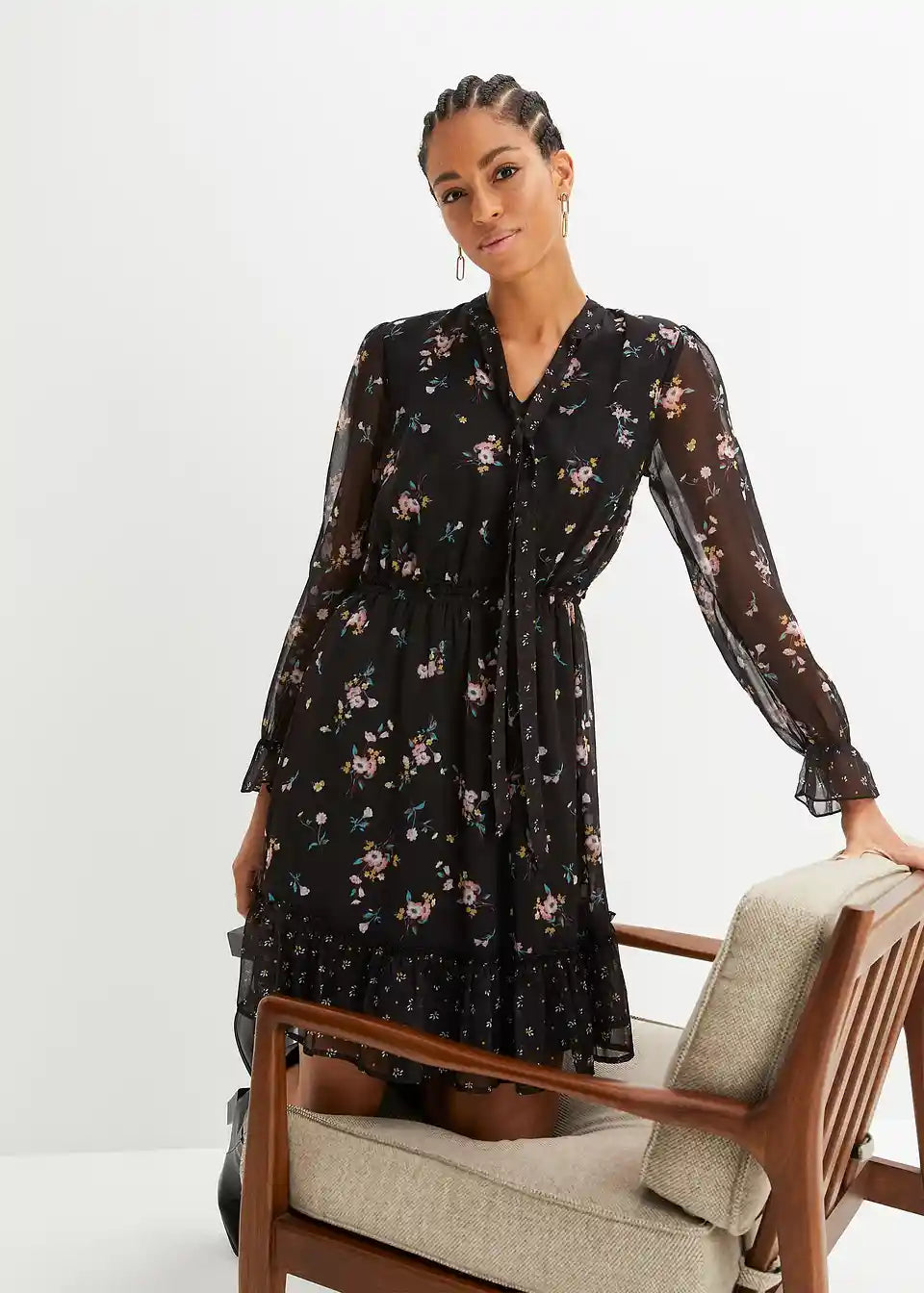 Feminina haljina s prozirnim rukavima i naborima
