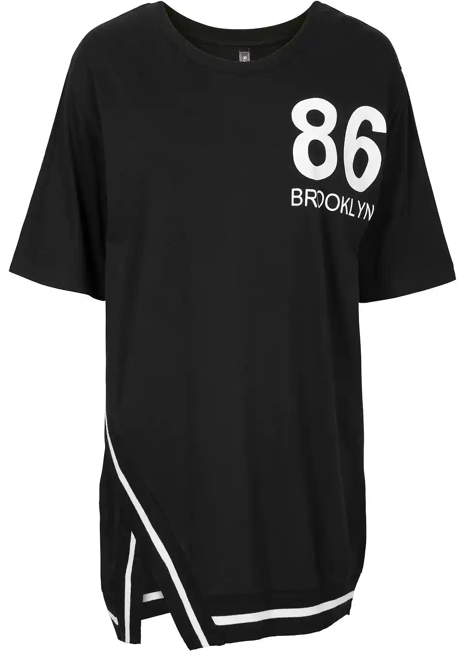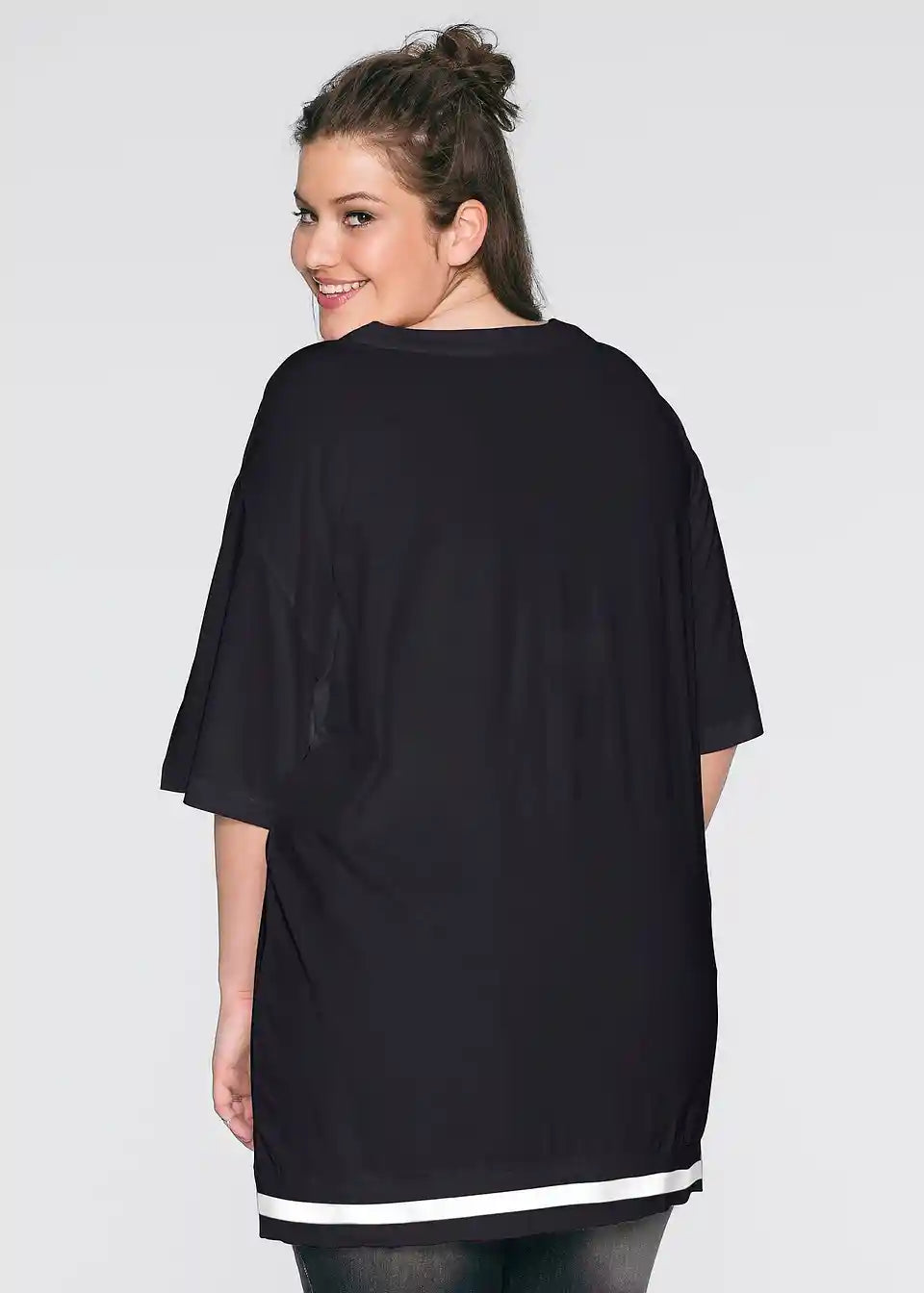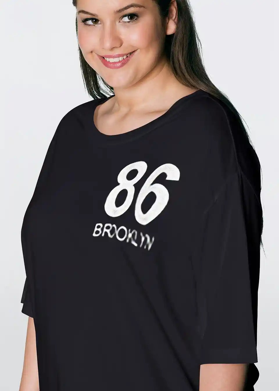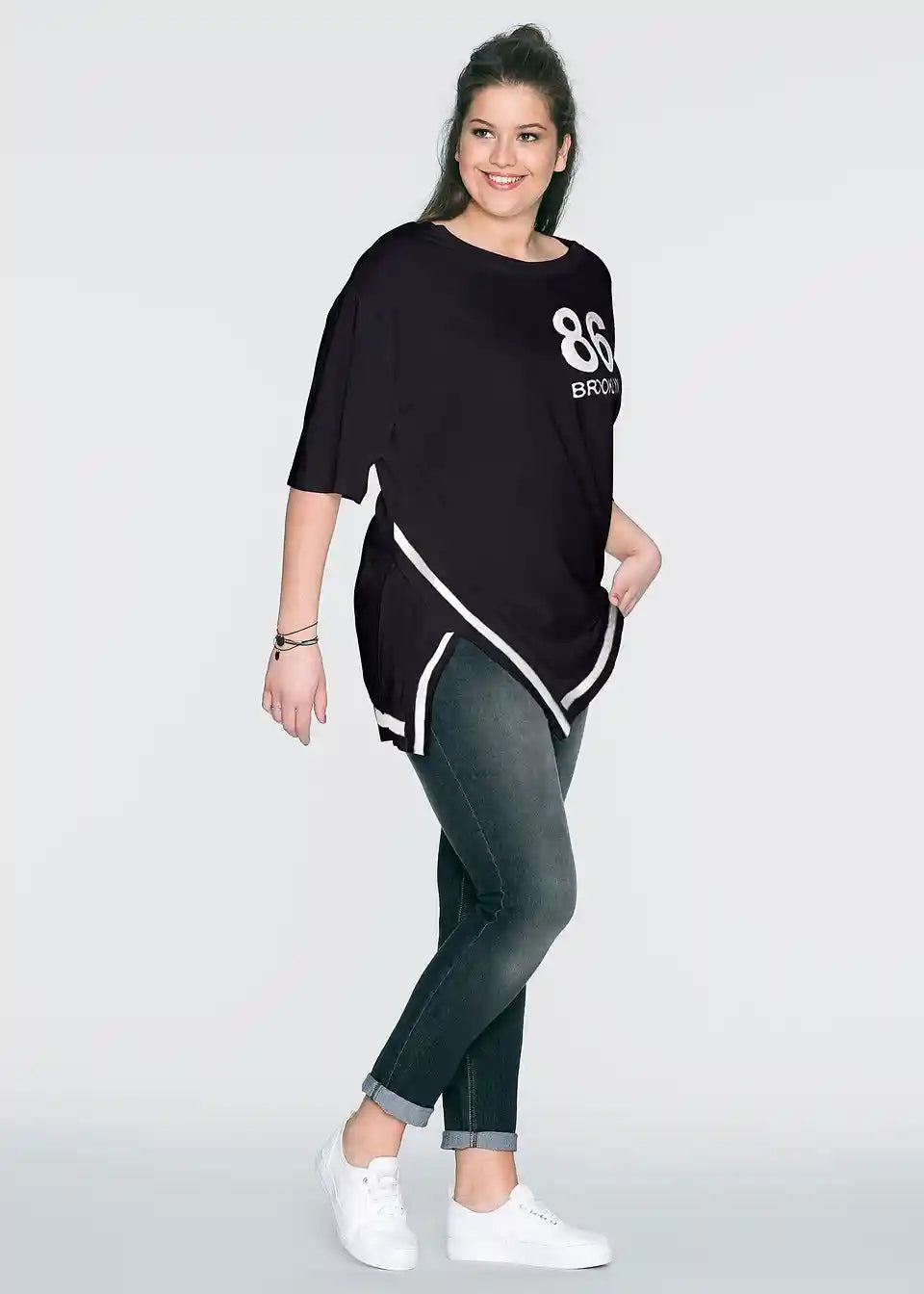 Kao pravi trendovski komad, ova majica se ističe ležernim ramenima i vrlo opuštenim krojem. Sportski print na visini grudi daje majici s oversize ramenima i 3/4 rukavima moderan izgled. Na prednjem dijelu s desne strane, majica s okruglim izrezom dizajnirana je s asimetričnim prorezom. U kombinaciji s izblijedjelim trapericama ili tajicama od imitacije kože, stvara moderan outfit.