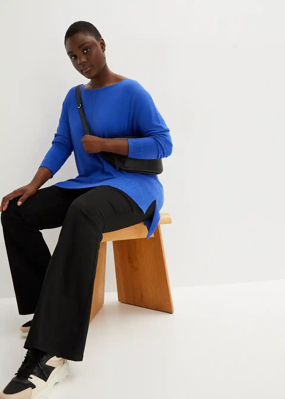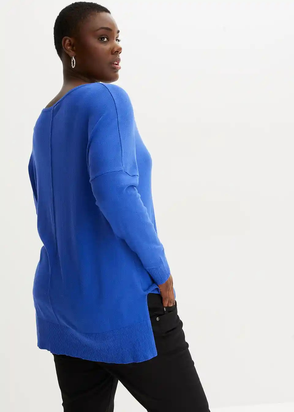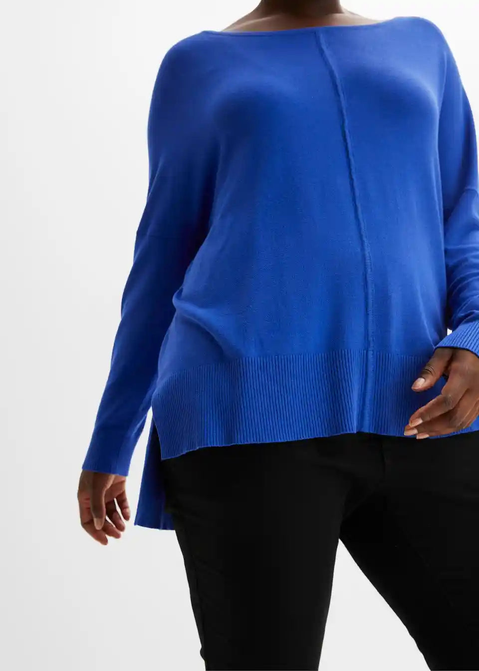 Široko krojeni pulover dobiva svoj zanimljiv izgled zahvaljujući šavu koji se proteže od okruglo izrezanog ovratnika do ruba. Rebrasti rub je na stražnjem dijelu duži nego sprijeda, a sa strane je model ležerno prorezan.