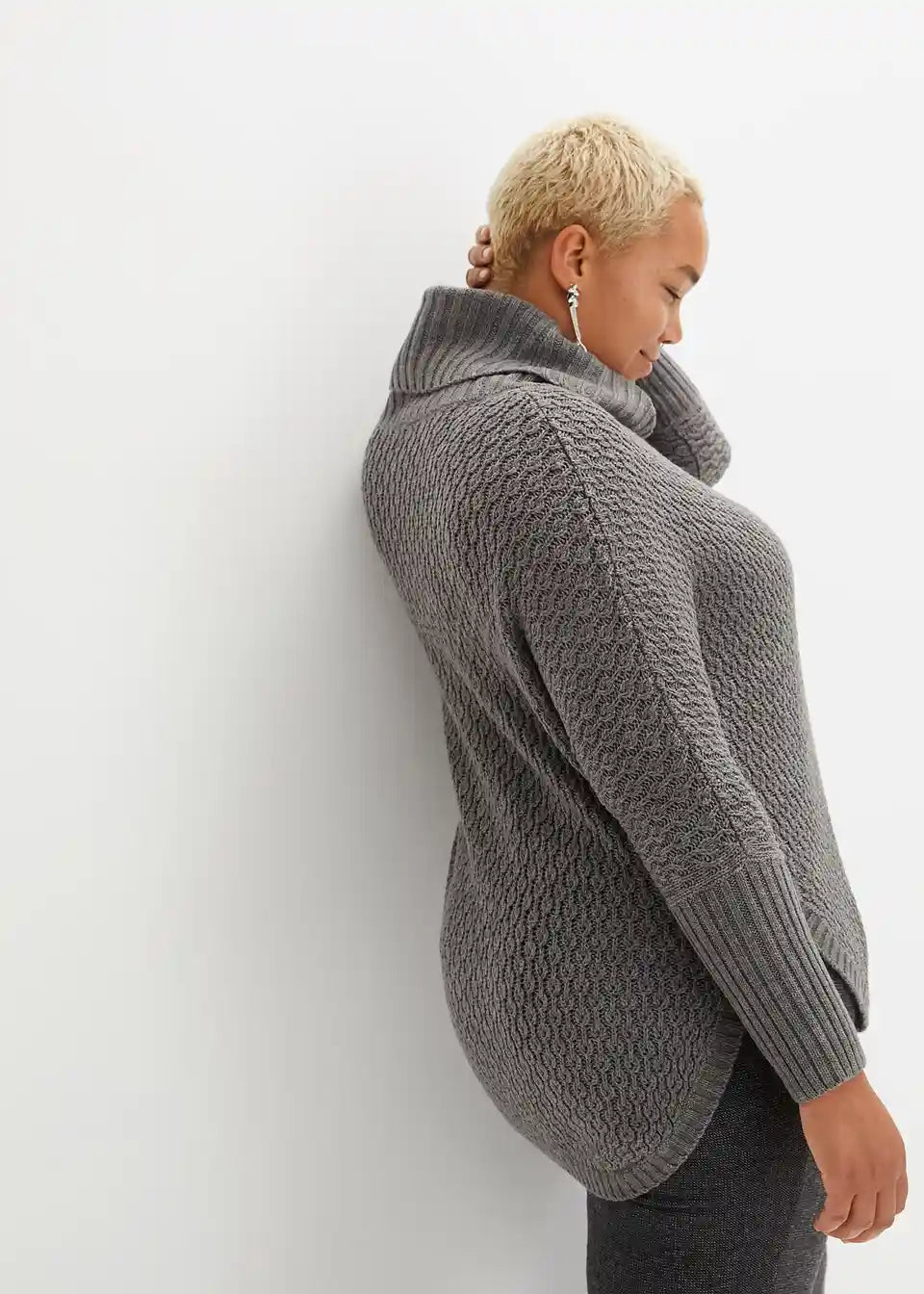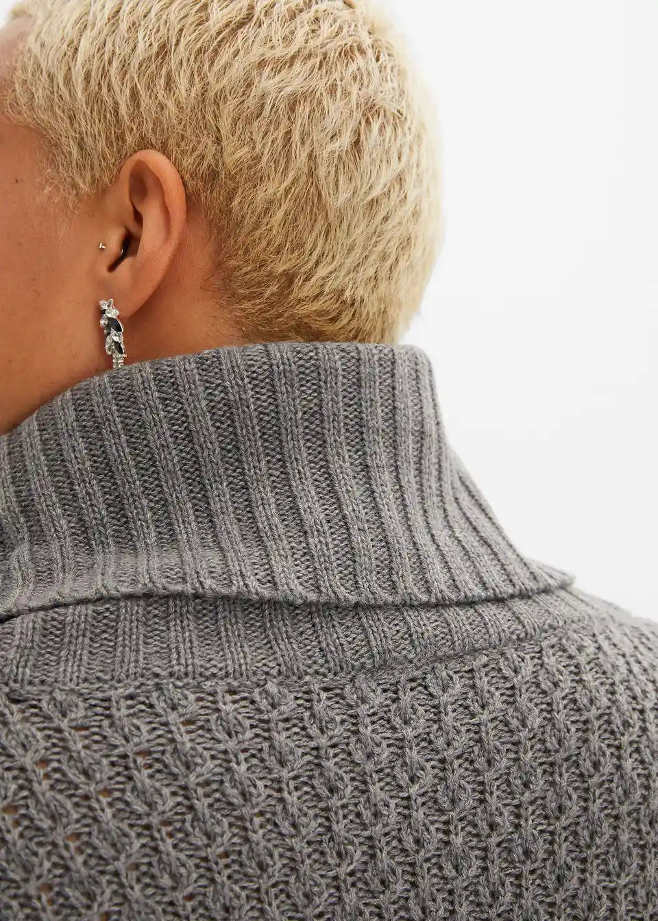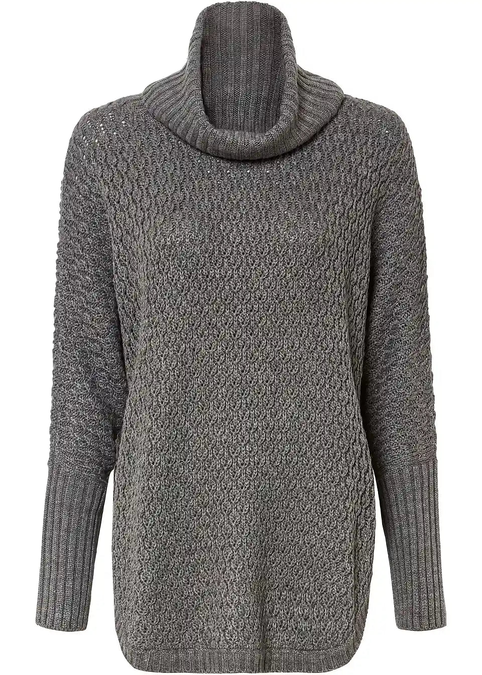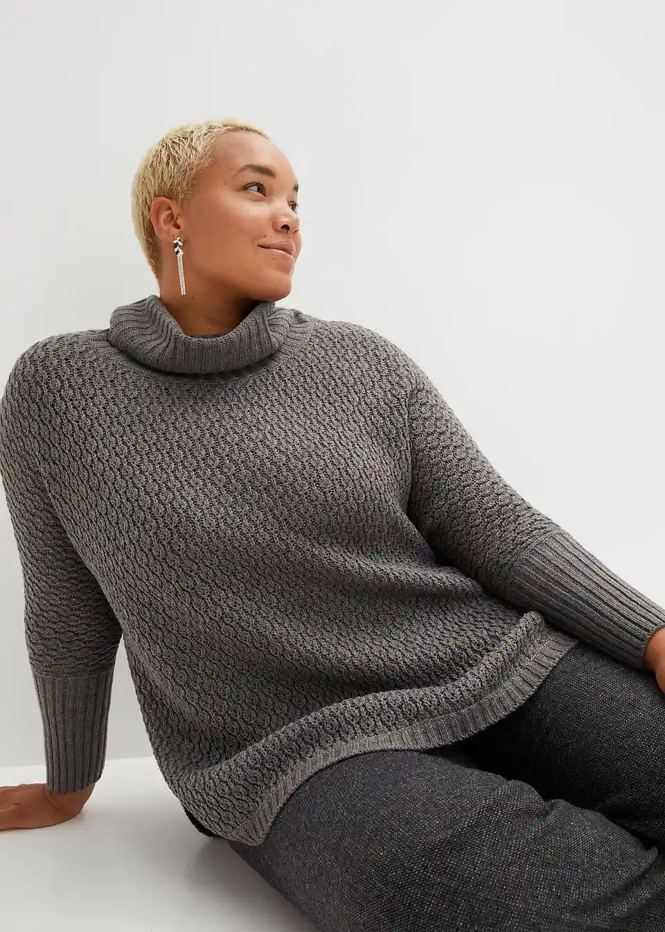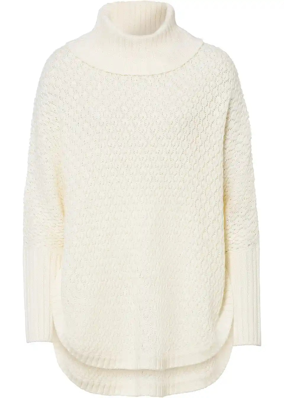 Moderan oversize-pulover s ajur uzorkom, velikim rolk ovratnikom i dva bočna proreza.