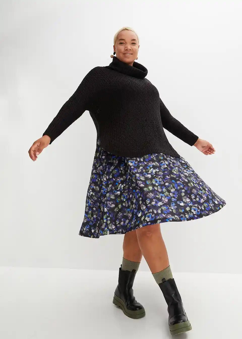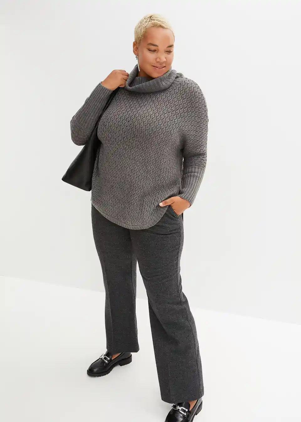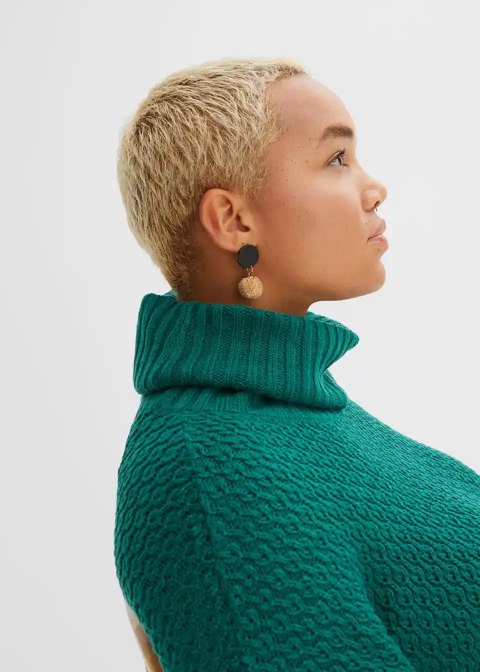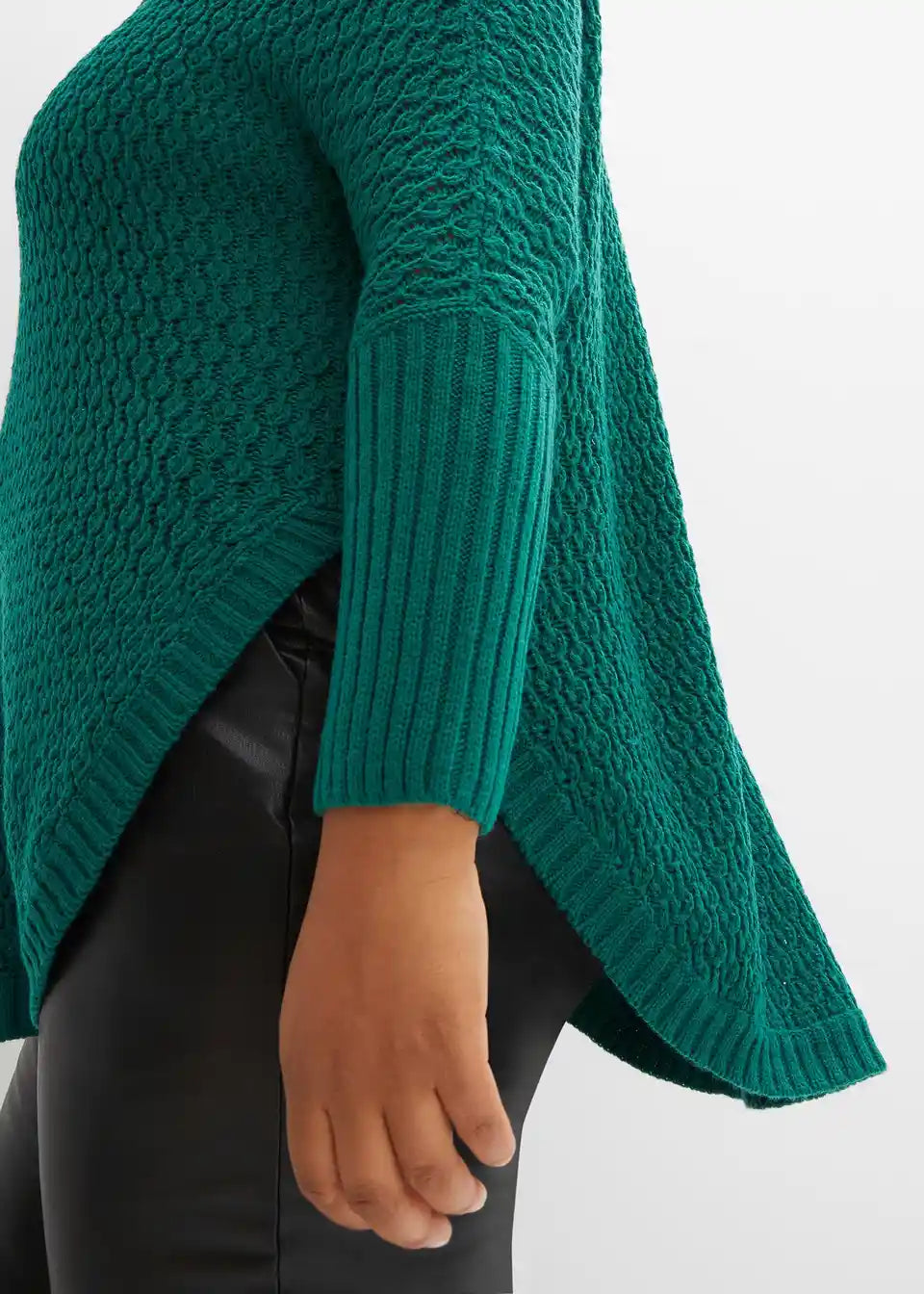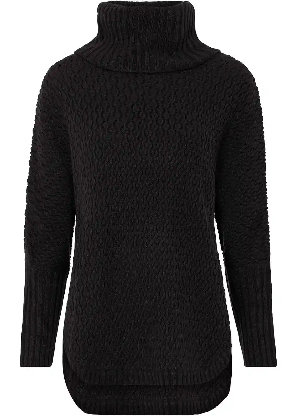 Moderan oversize-pulover s ajur uzorkom, velikim rolk ovratnikom i dva bočna proreza.