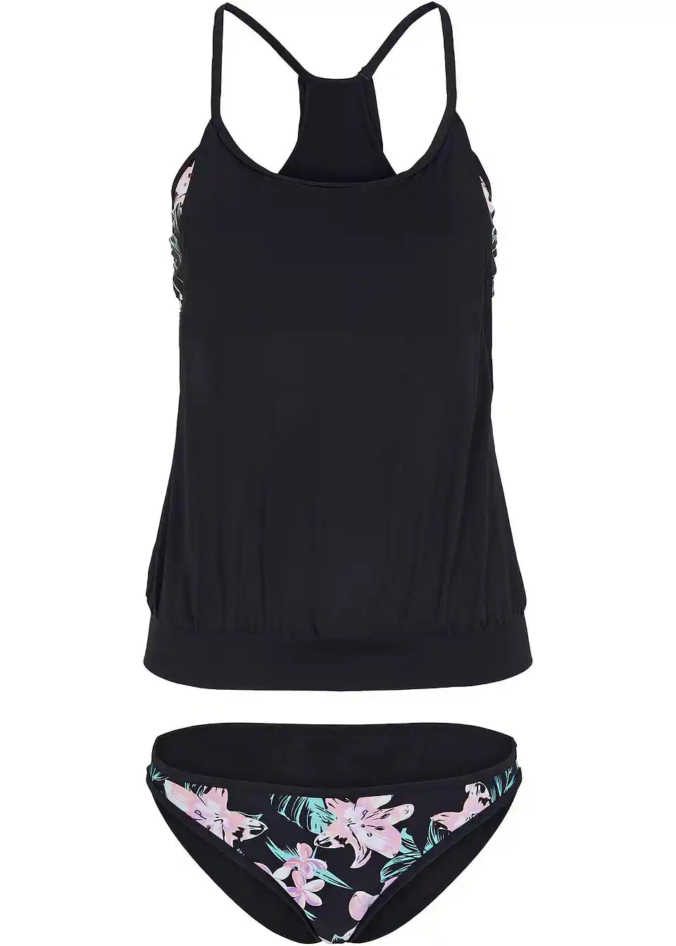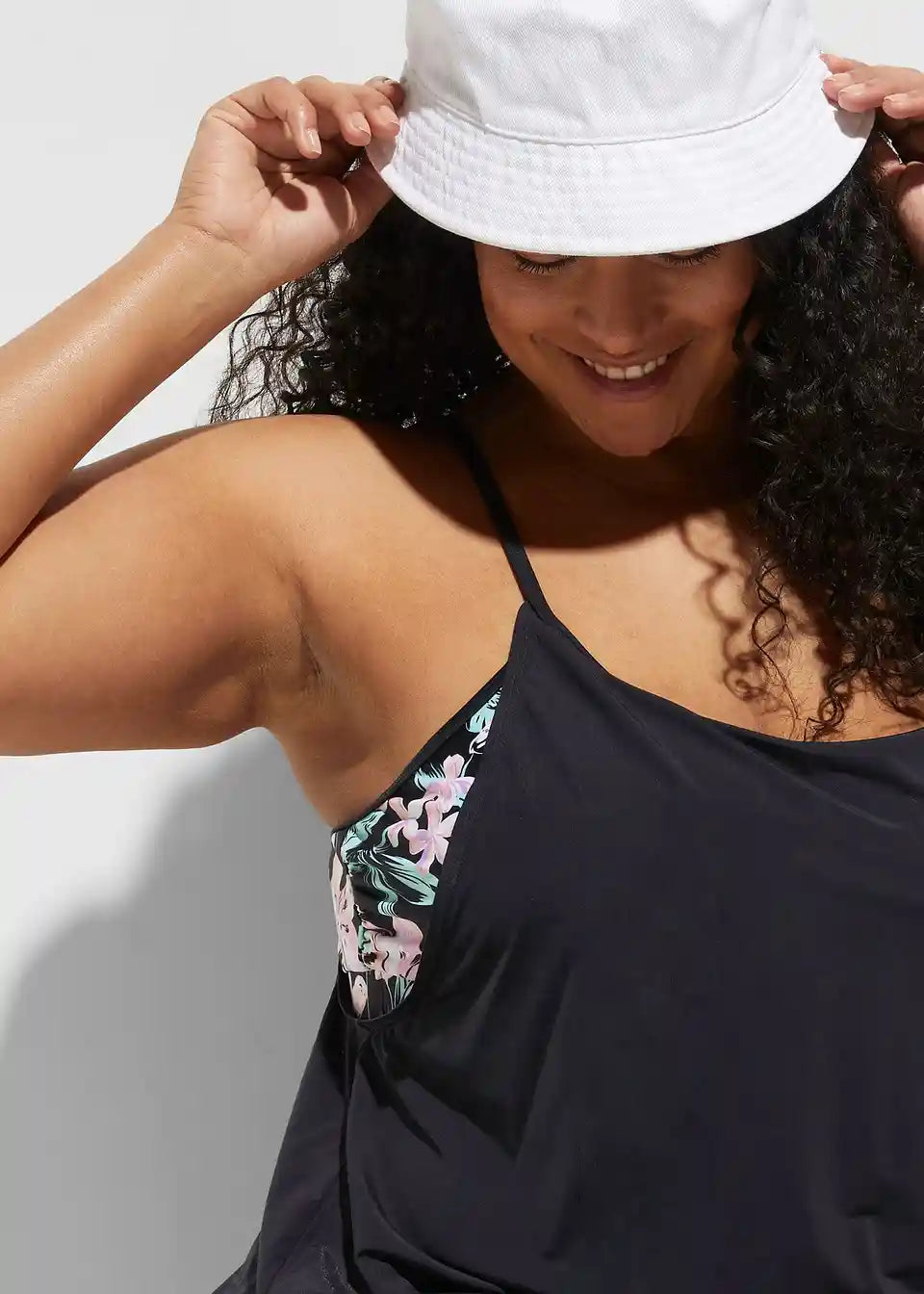 Ovim neobičnim tankinijem ostavljate dojam osobe sklonu trendovima na plaži i bazenu. Gornji dio tankinija izrađen je u cool slojevitom izgledu s opuštenim padom. Ispod oversize majice s podesivim naramenicama i leđnim sportskim izrezom nalazi se modno printani Bustier. Uklonjivi Softcups za lijep dekolte i gumica ispod grudi osiguravaju sigurno prianjanje. Gaćice tankinija izvedene su u istom uzorku kao i Bustier i ugodno su podstavljene.