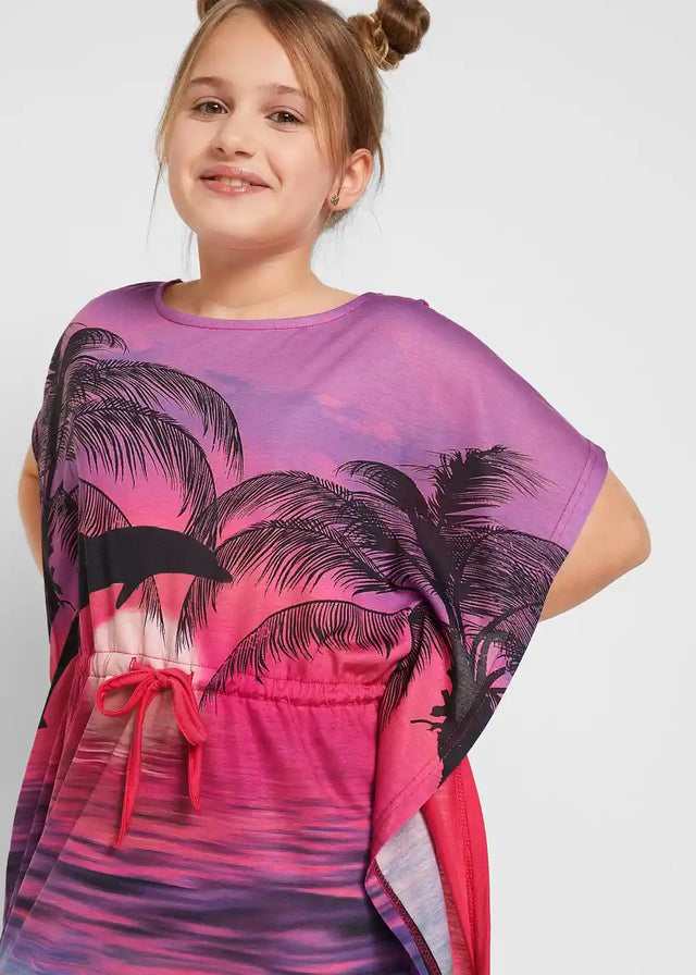 Tunika za djevojčice s urezanim rukavima za plažu i mnoge druge prilike. Izrađena od mekog i lepršavog materijala, s lijepim uzorkom i vrlo ležernim krojem - praktično i šik u isto vrijeme.