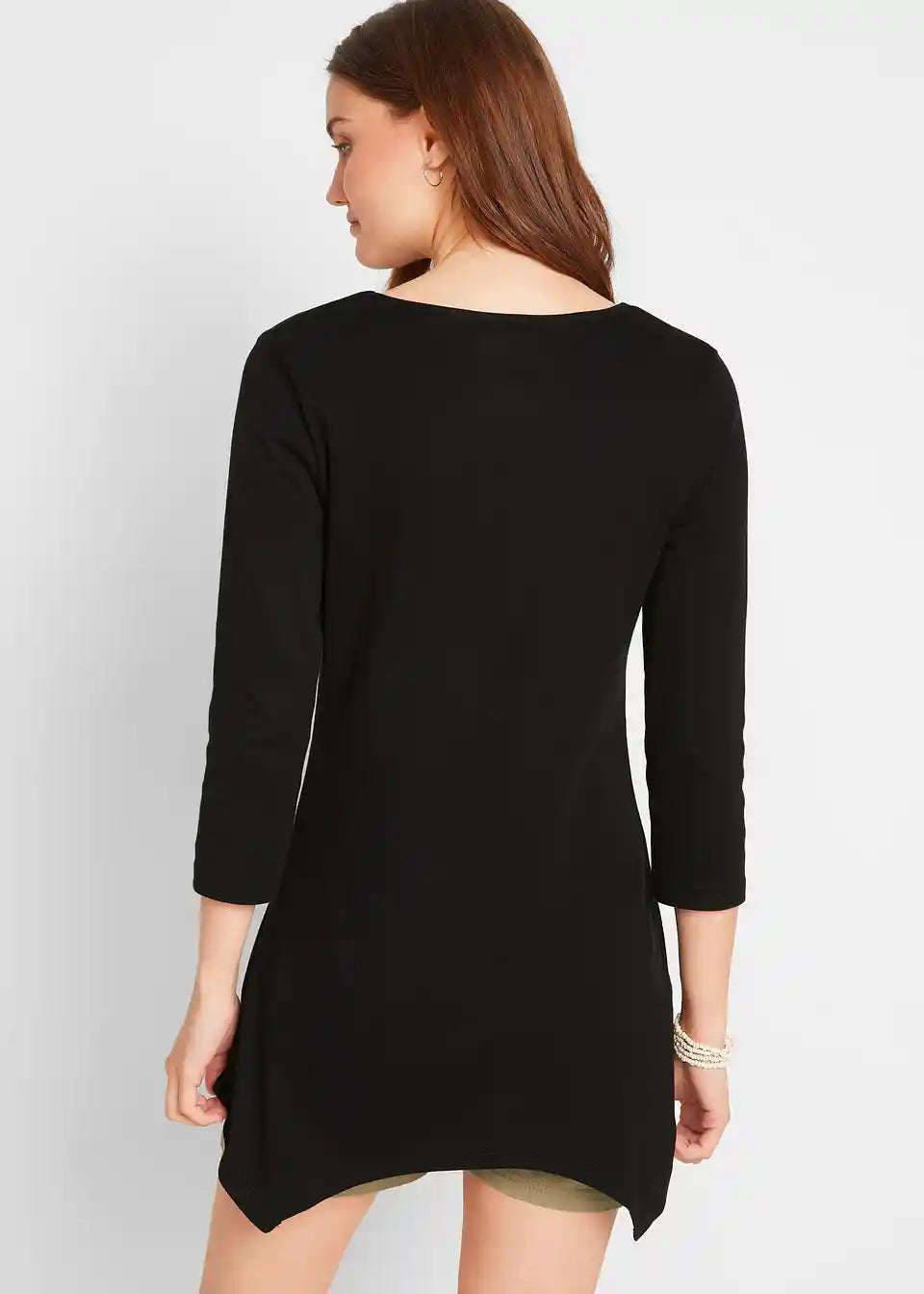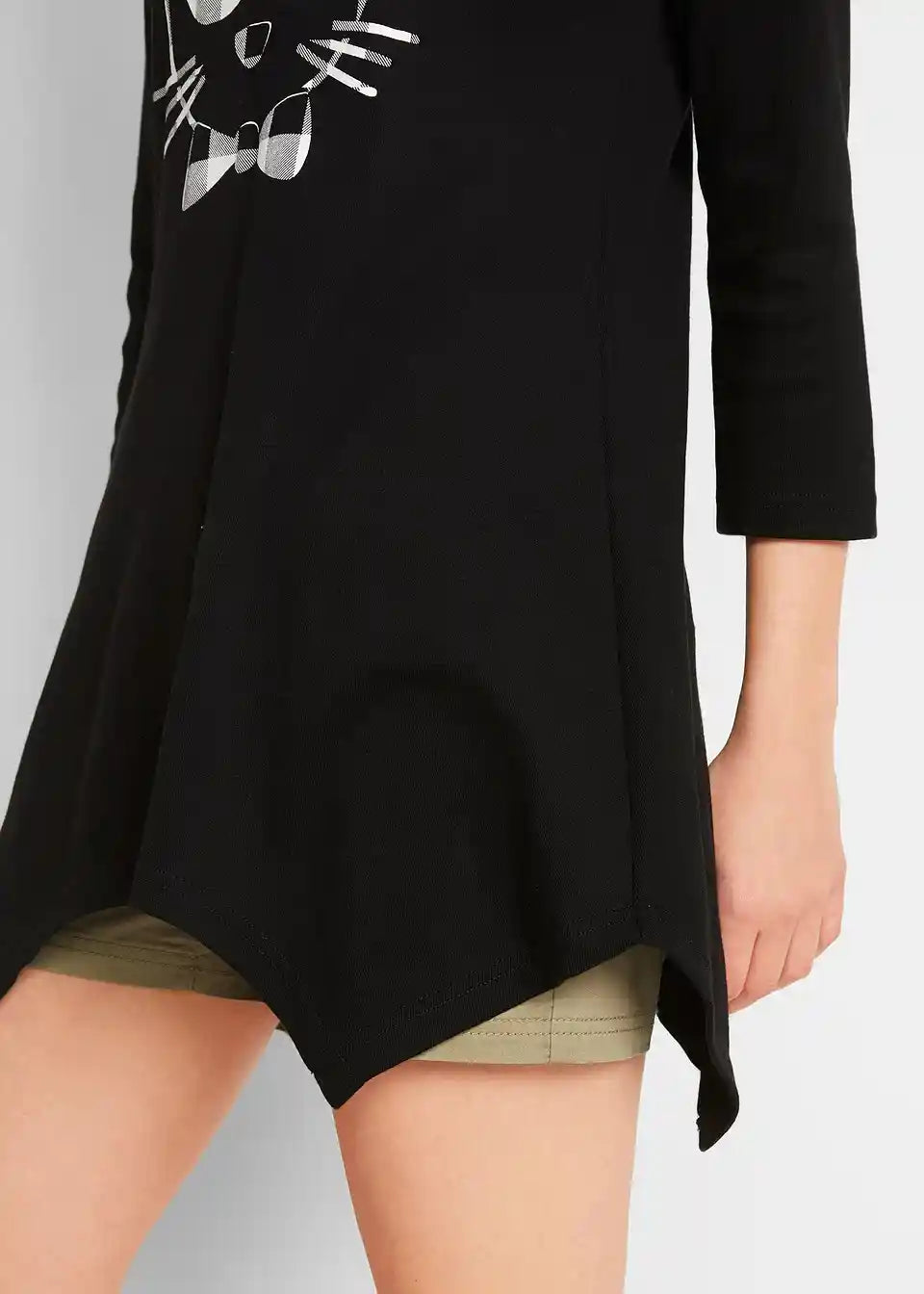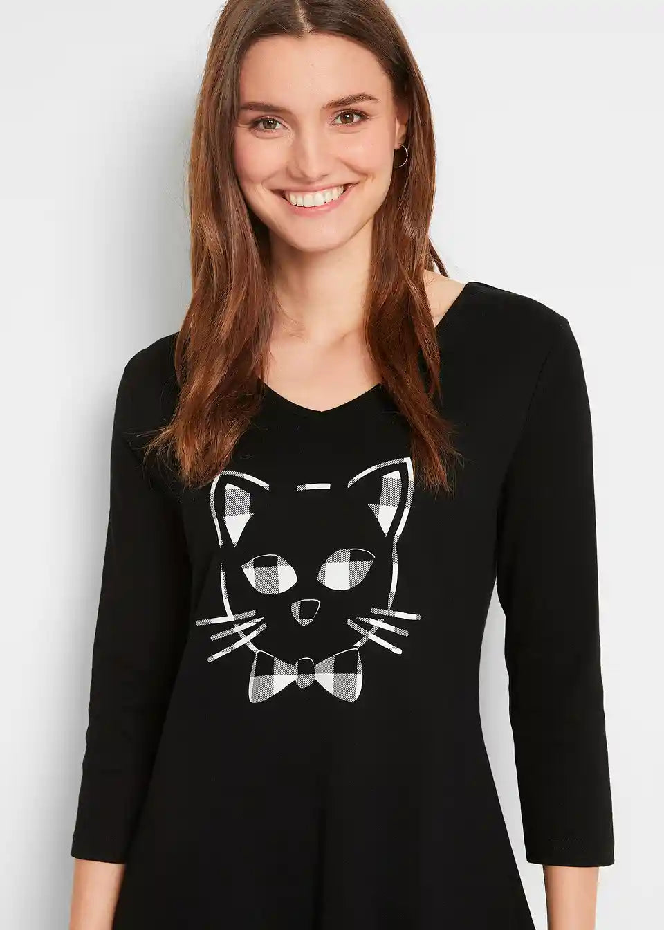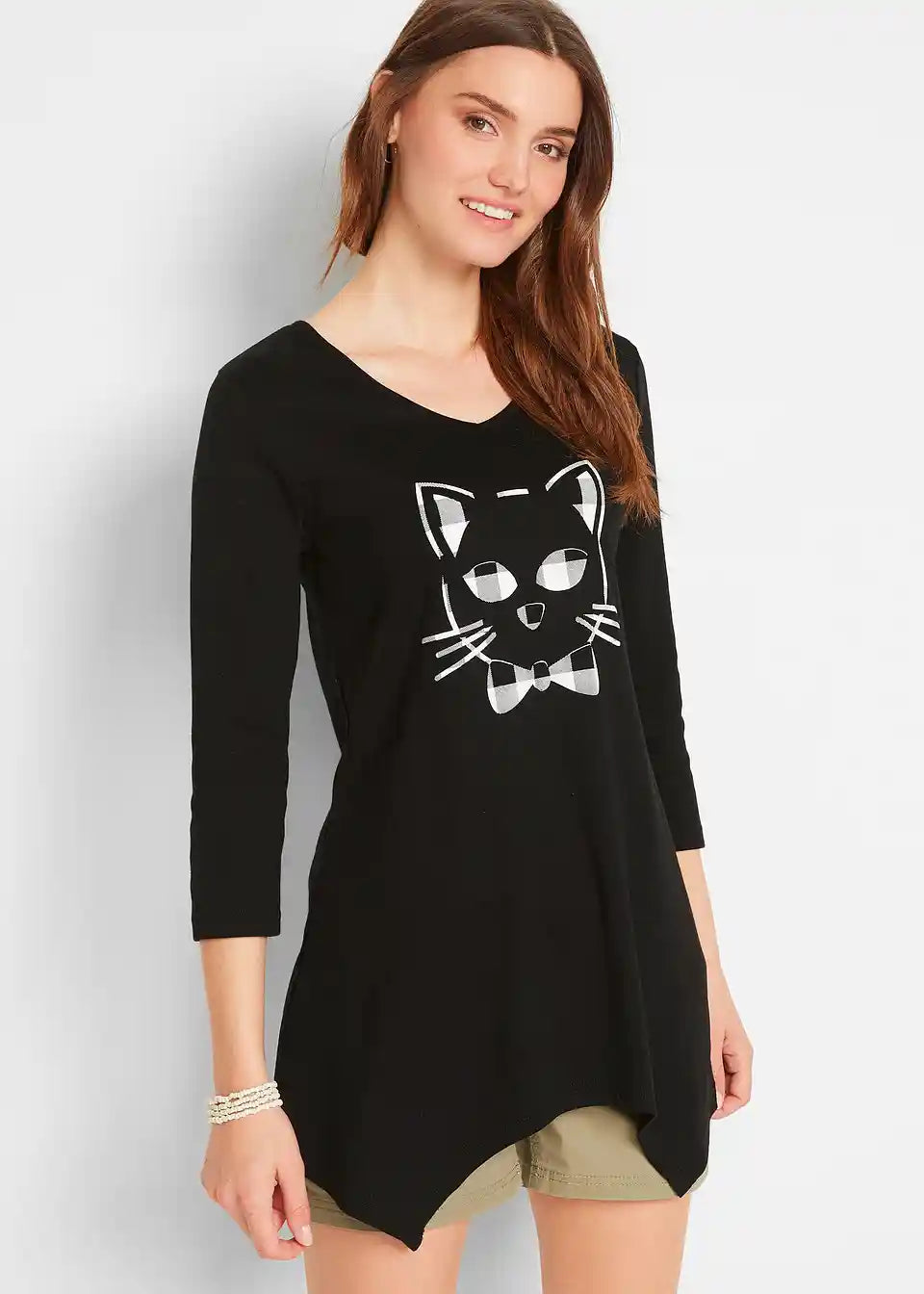 Asimetrična duga majica s postavljenim printom mačke, 3/4 rukava i optički izduženim V-izrezom, od 100% pamuka