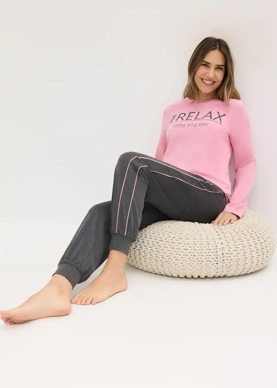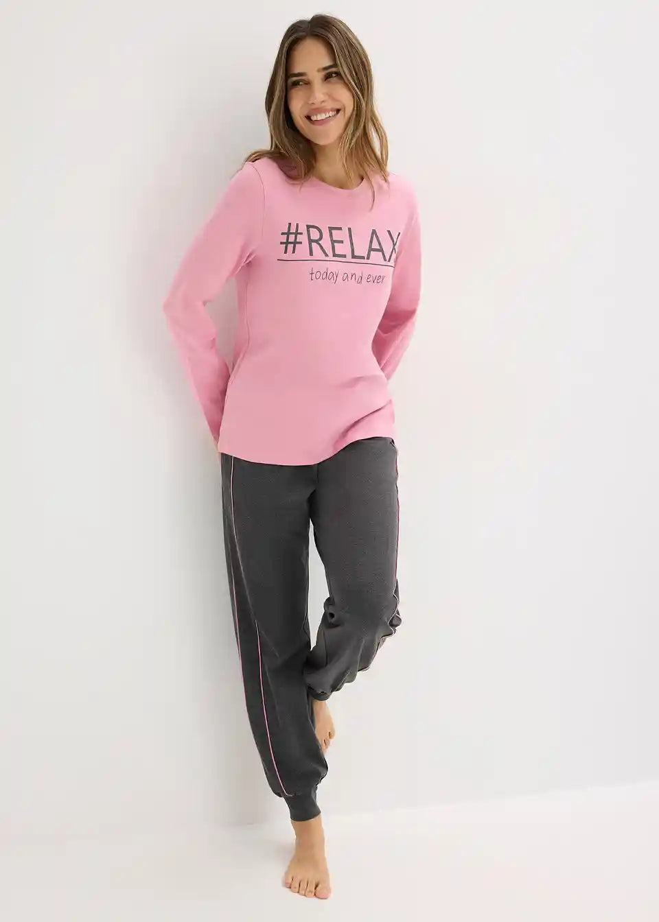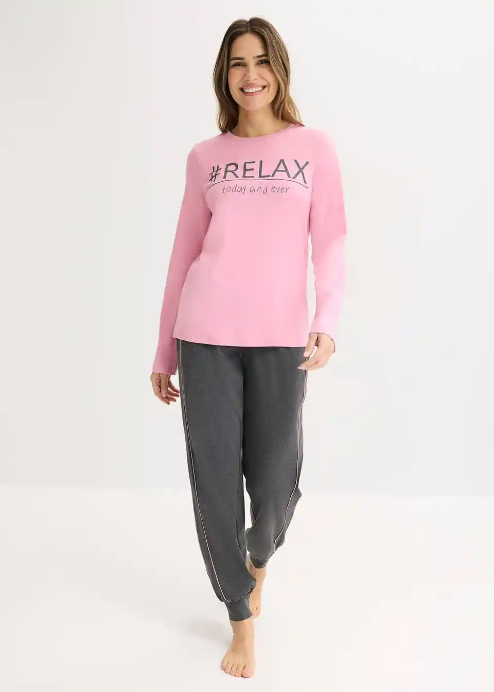 Pidžama s majicom dugih rukava i okruglim izrezom s ukusnim printom, kao i hlačama s kontrastnim paspulom na bočnom šavu, džepovima te manšetama na rubu.