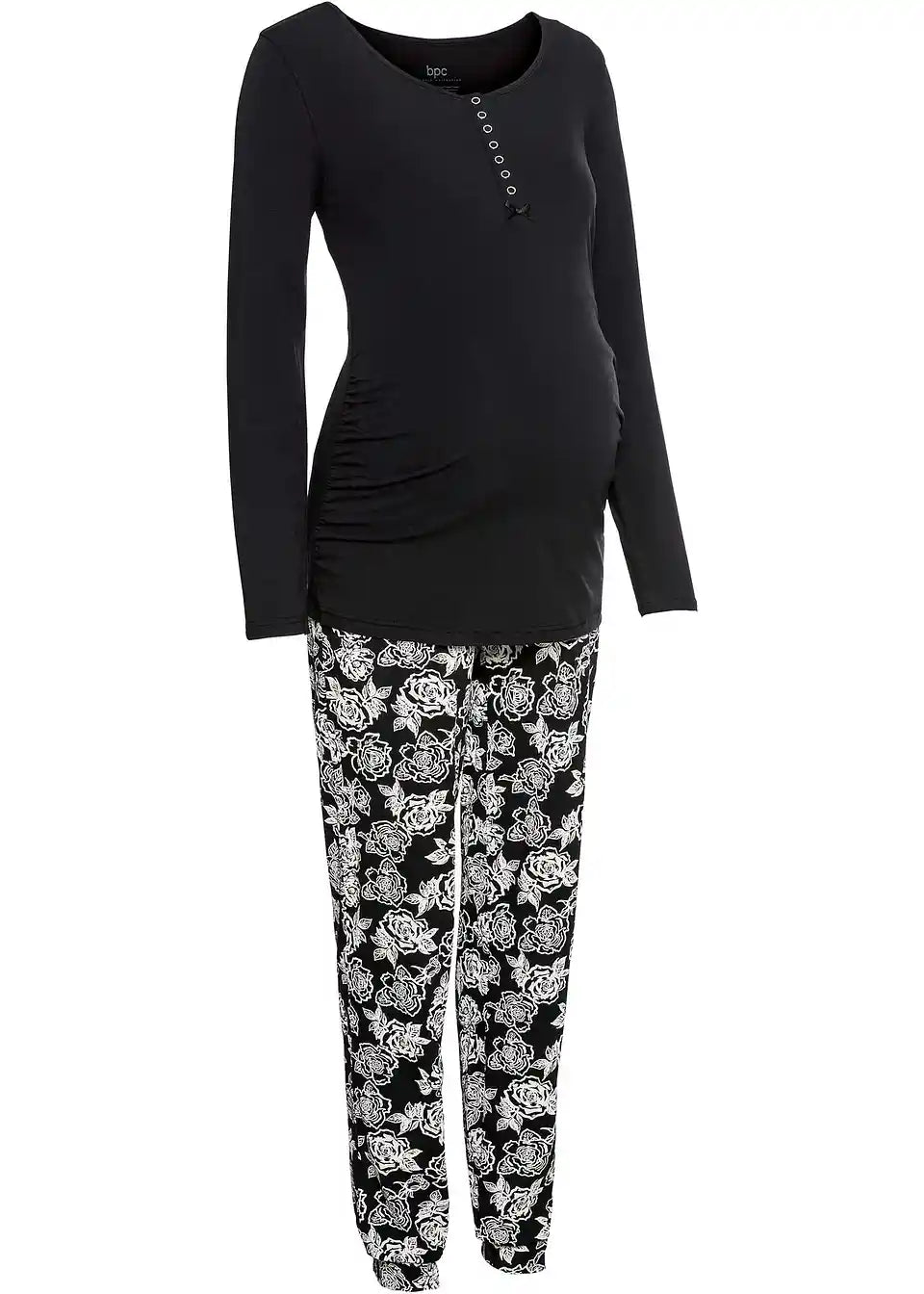 Koži ugodan spavaćica od organskog pamuka savršen je za trudnoću i razdoblje dojenja. Jednobojna majica dugih rukava pruža prostor za rastući trbuh i može se otvoriti preko linije gumba na izrezu za dojenje. Uz to dolaze duge hlače s udobnim pojasom i cvjetnim uzorkom u cijelosti.