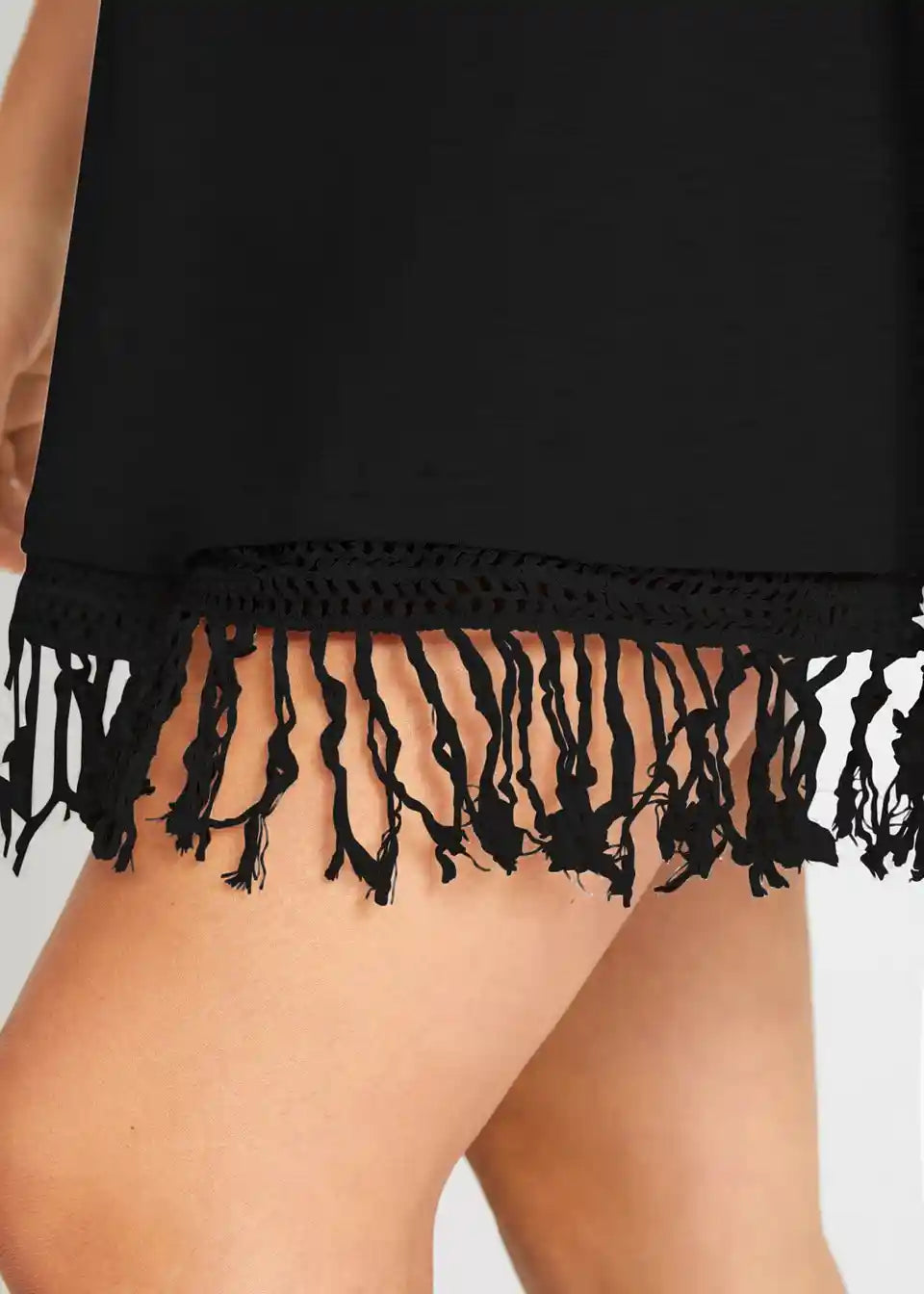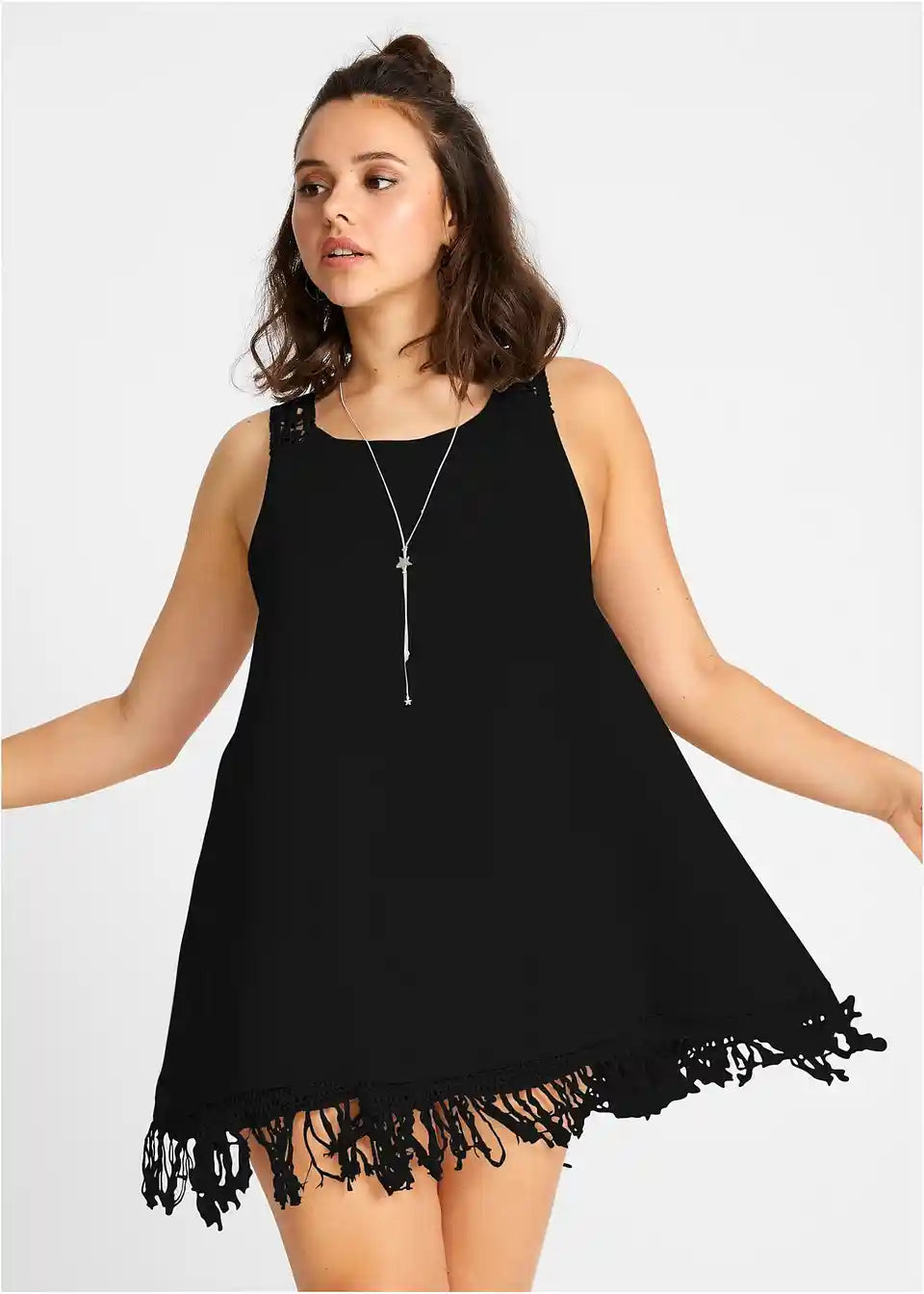 Upadljiv izgled sa čipkastim ukrasima, resama i rubovima čini ovu modernu plažnu haljinu izvanrednim privlačenjem pogleda. Ležeran, bezrukavni kroj u modernom A-oblika daje modelu od ugodno mekanog, lagano prozirnog Jersey materijala trendovski izgled. Izvrstan akcent daje rub s uzorkom rupica i završetkom s resama. Dekorativan detalj ove kratke haljine s okruglim izrezom je stražnji dio u obliku sportskog rezača, kompletno izrađen od fine kukičane čipke.