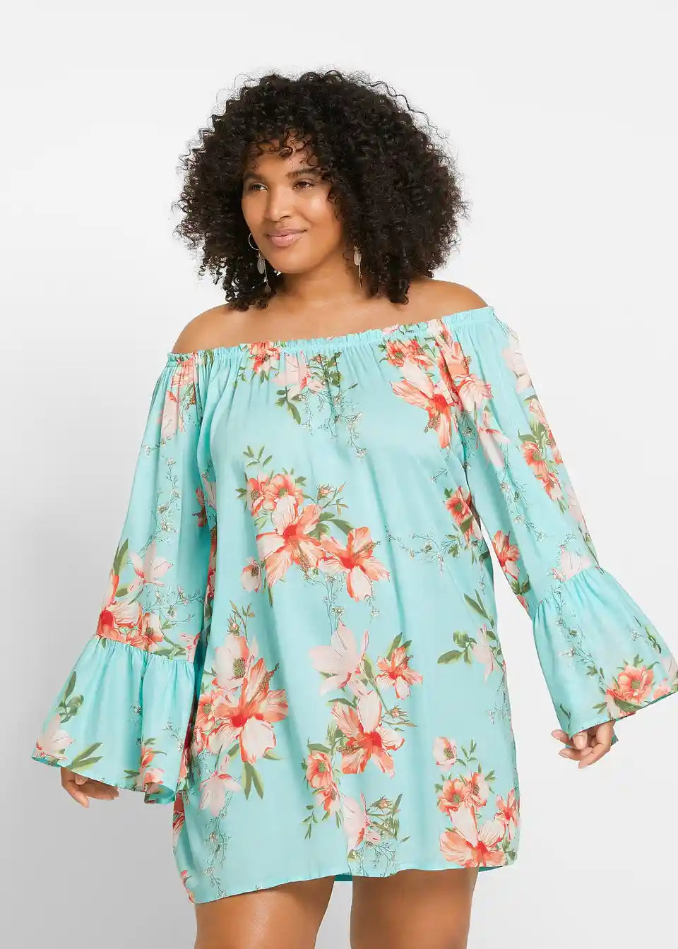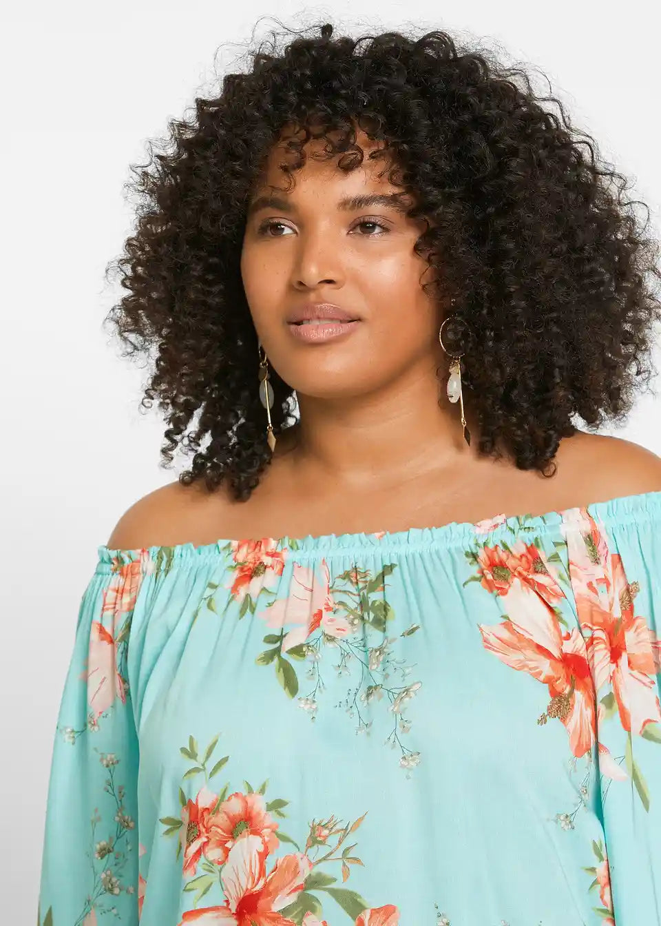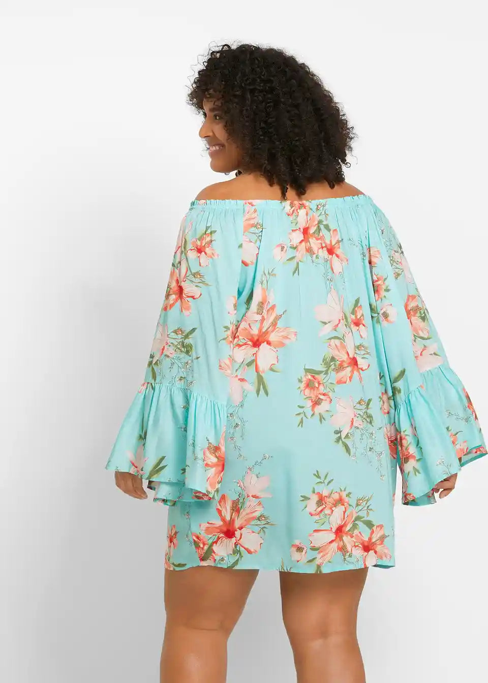 Tunika s Carmen-izrezom i širokim volan rukavima.