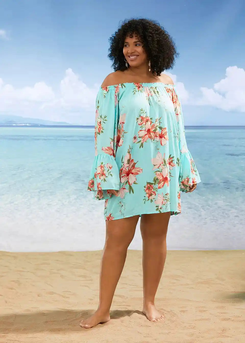 Elegantna, široko krojena plažna tunika s modernim Carmen-izrezom