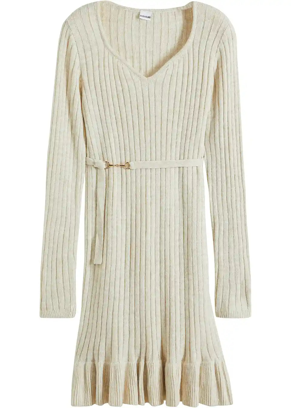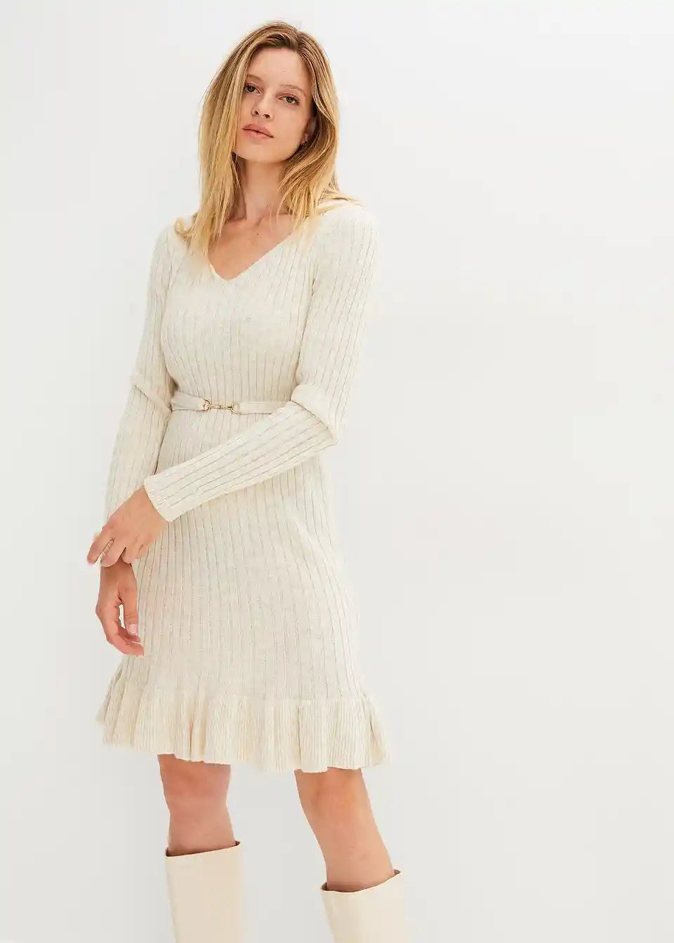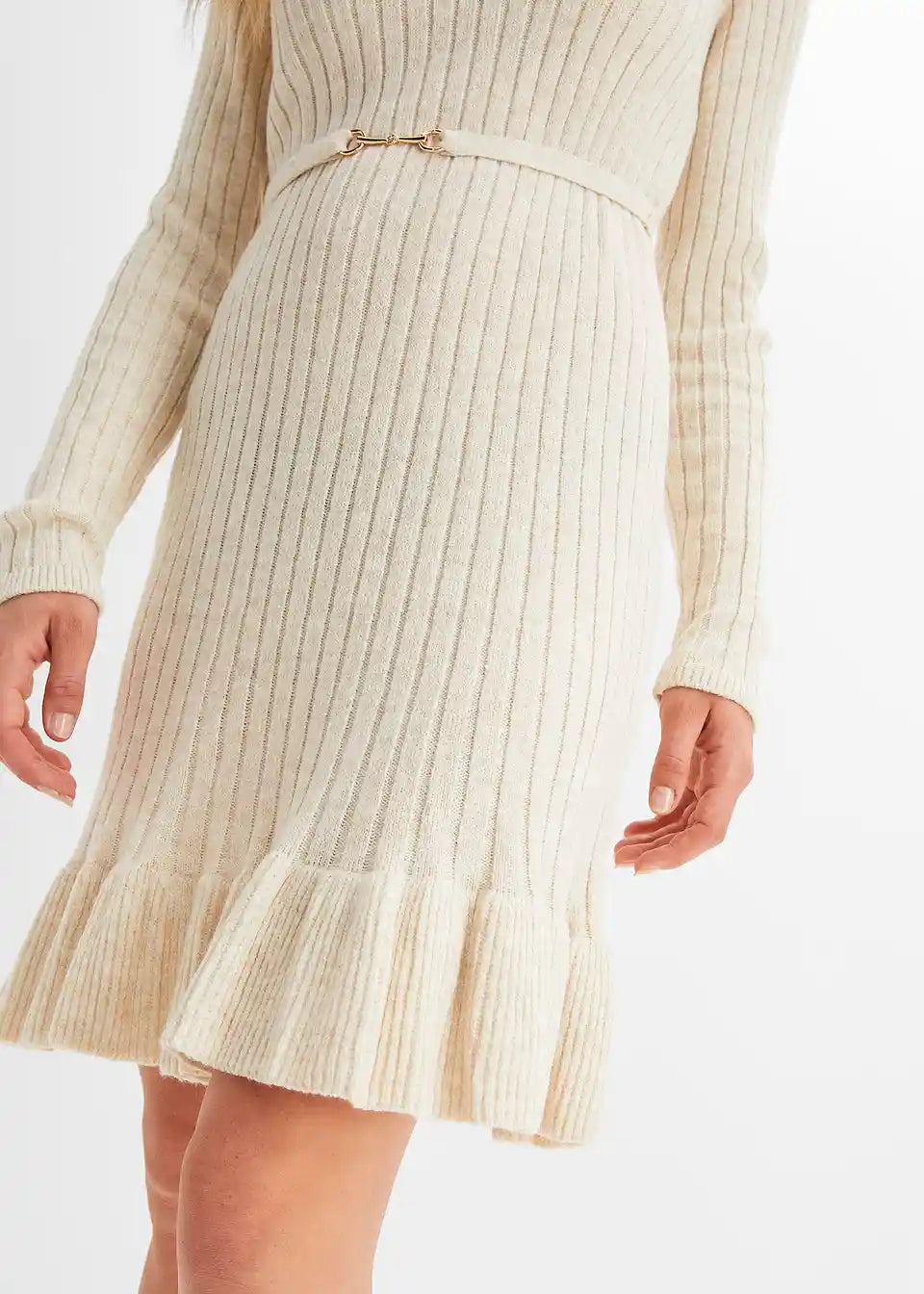 ženska pletena haljina s volanom i aplikacijom u struku.