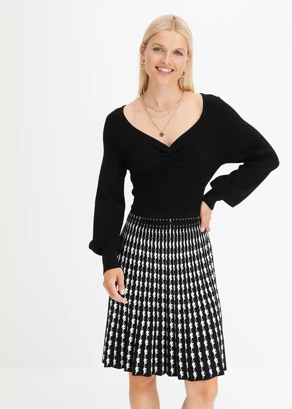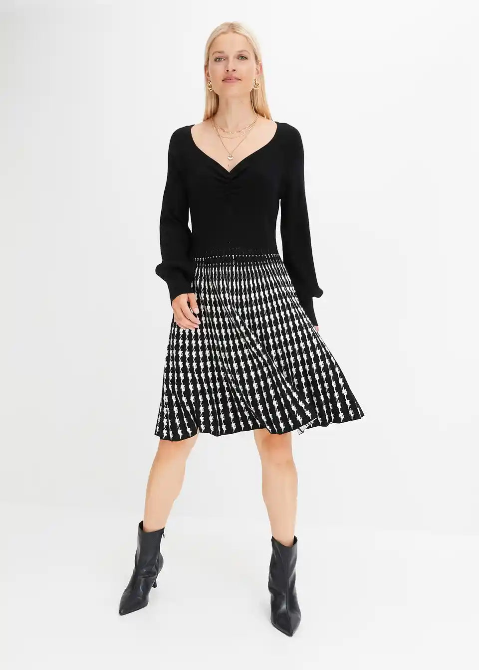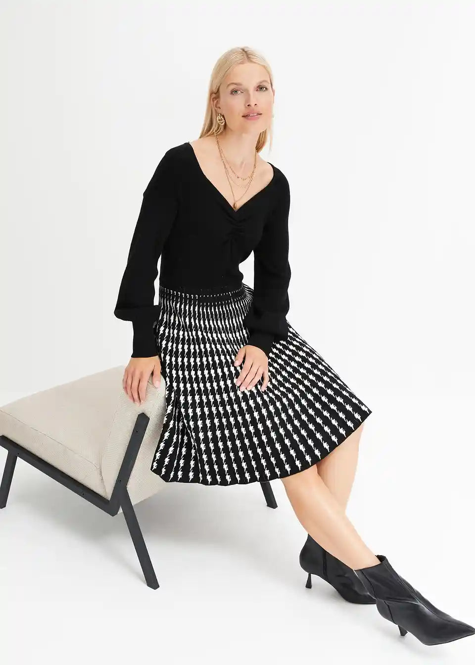 ženska pletena haljina s uzorkom na suknji i dubokim srcolikim izrezom sprijeda