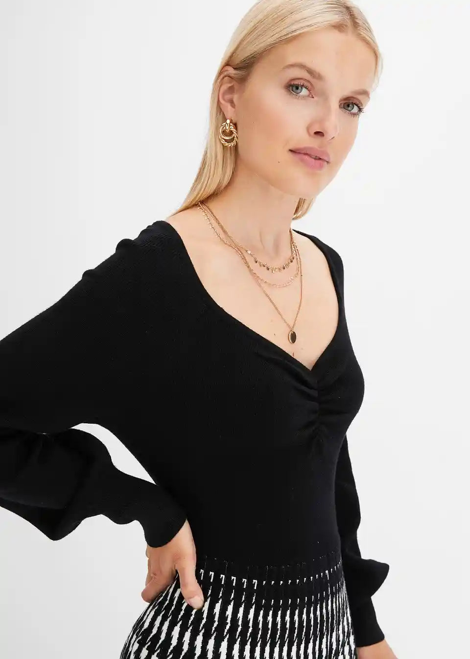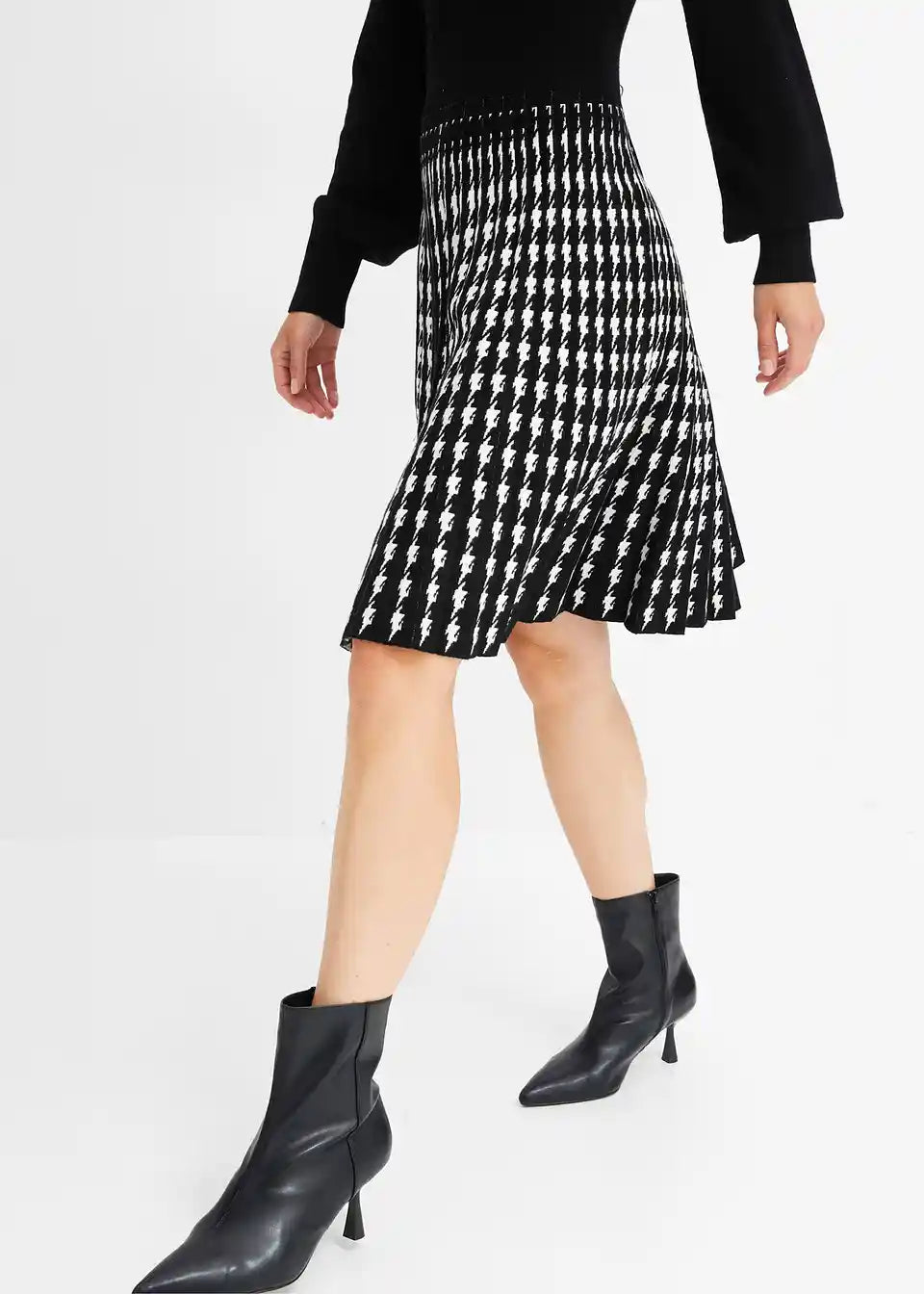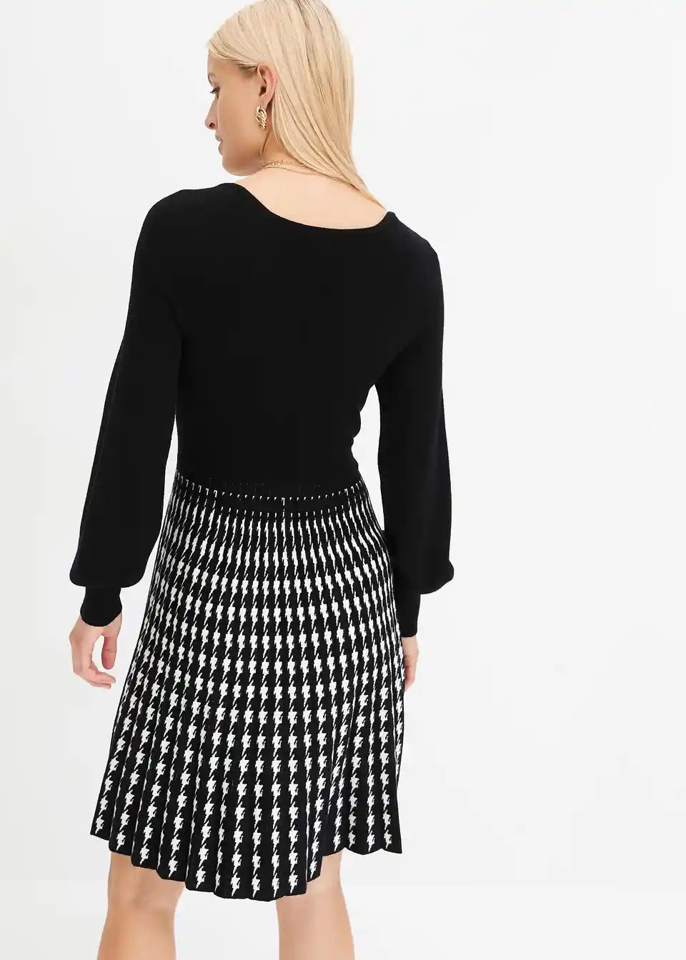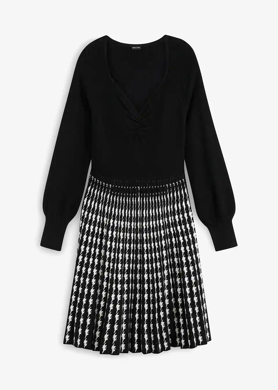 ženska pletena haljina s uzorkom na suknji i dubokim srcolikim izrezom sprijeda