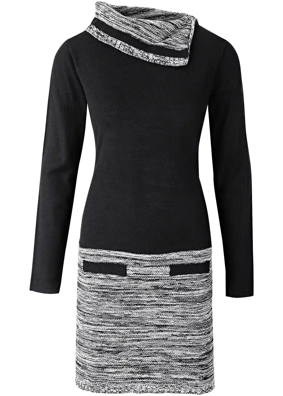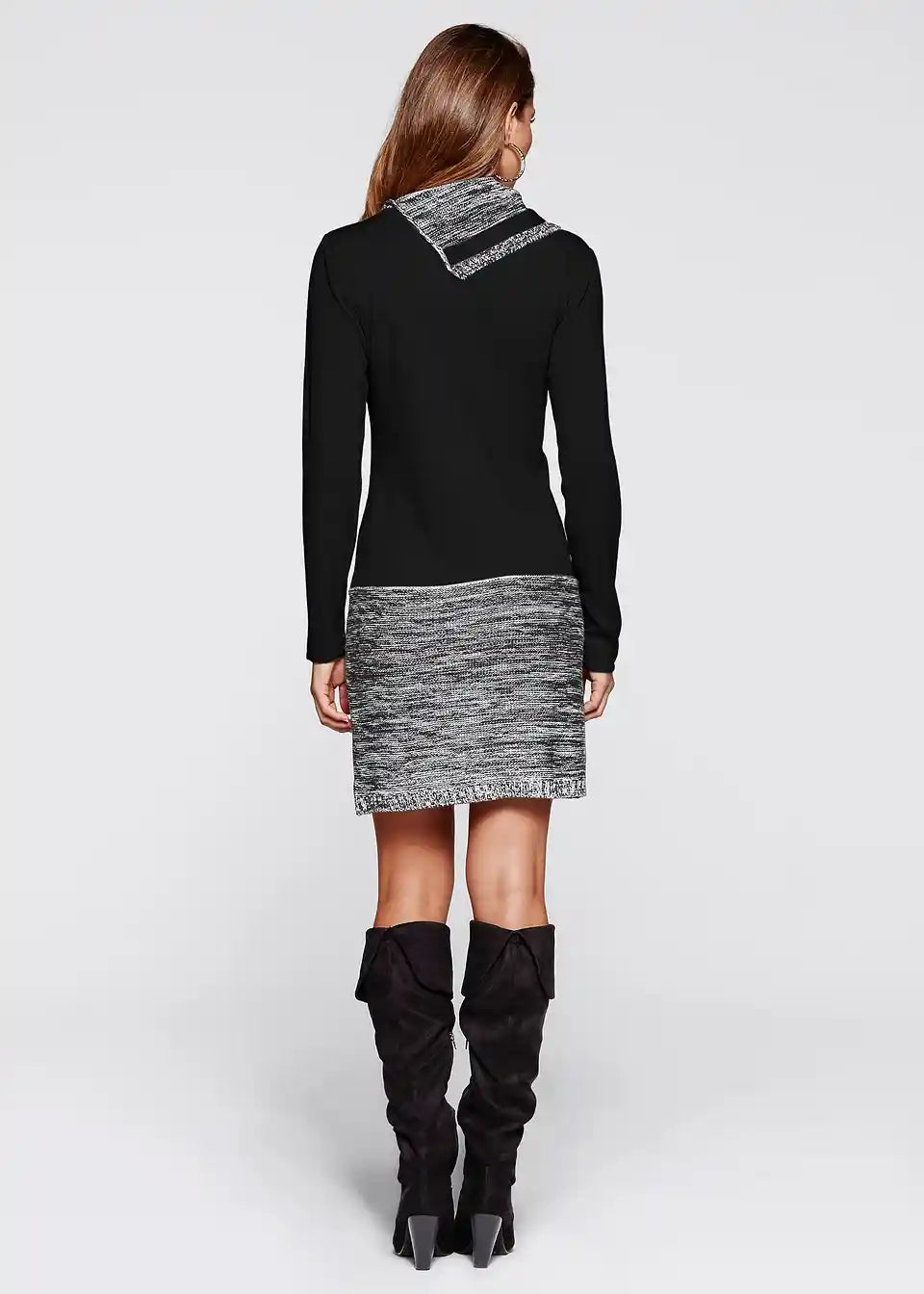 Dvobojni izgled čini ovu lijepu pletenu haljinu prividno dvodijelnom kombinacijom suknje i gornjeg dijela. Dok je donji dio haljine meliran, gornji dio je jednostavniji. Okrugli turtleneck ovratnik s meliranim izgledom dodatno naglašava ženstven stil usko pripijene haljine. Elegantne visoke čizme ili čizme upotpunjuju ovaj ženstveni stil.