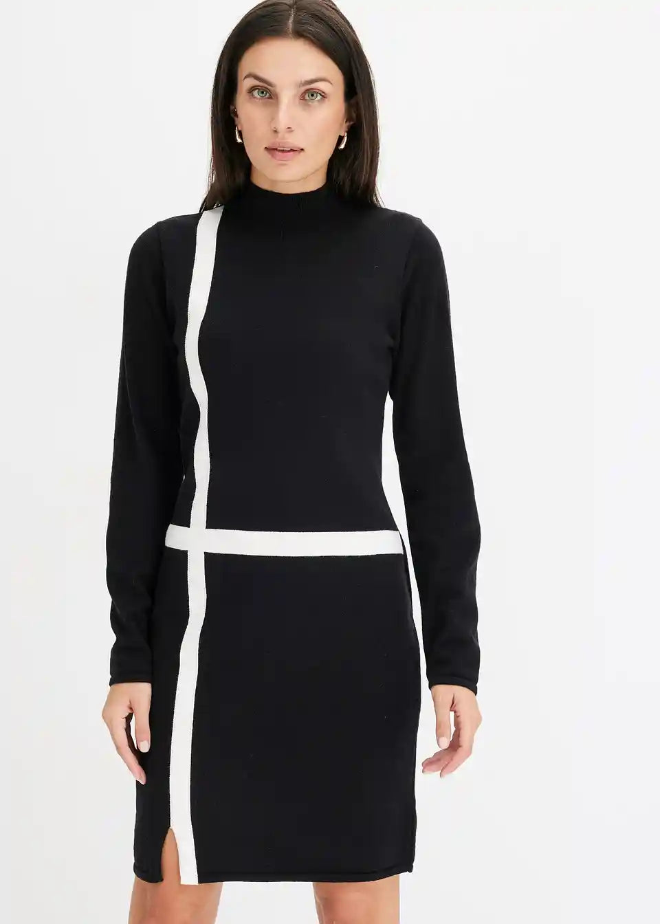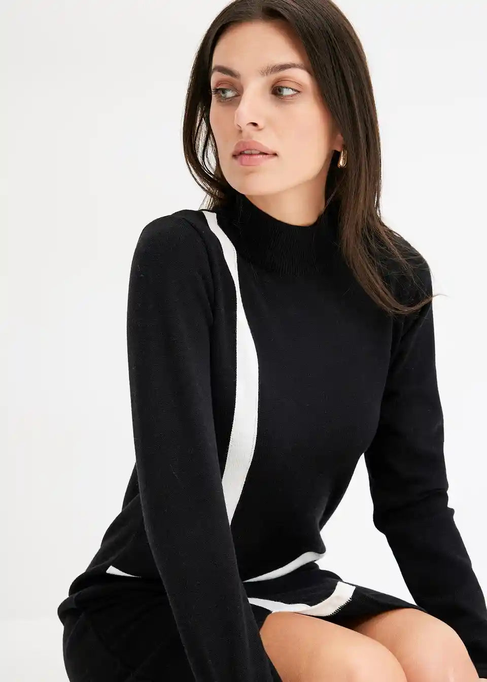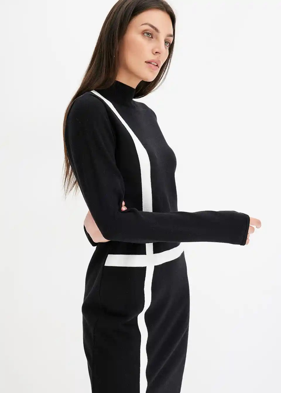 Moderna i ženstvena: Pletena haljina s visokim ovratnikom i prugastim uzorkom